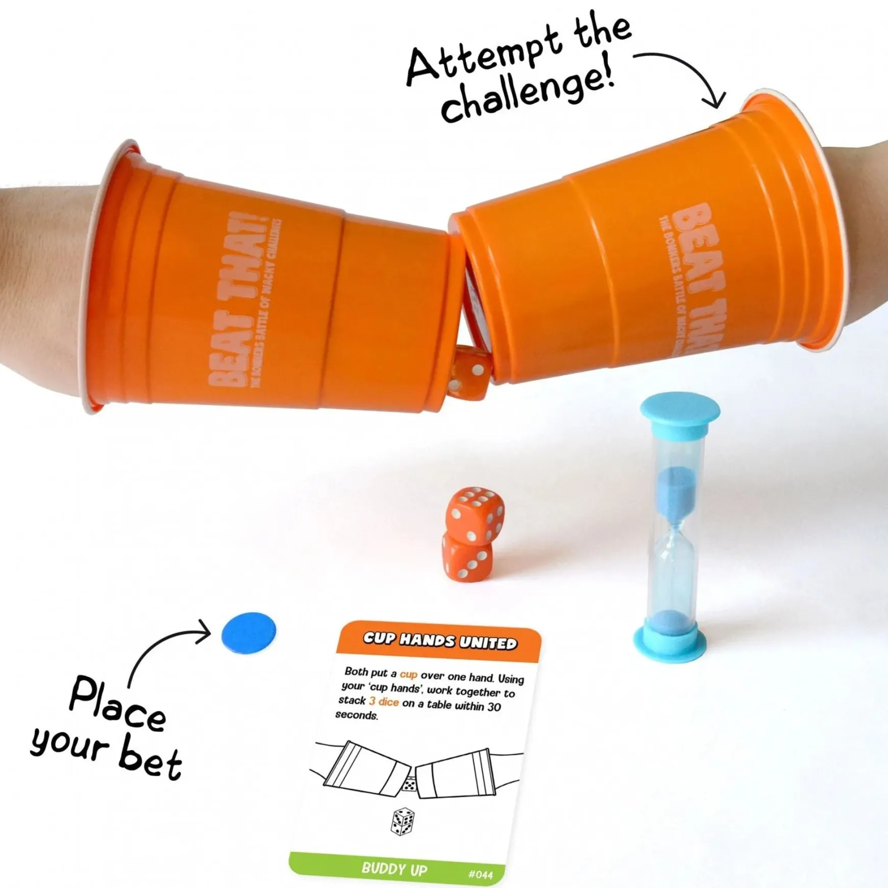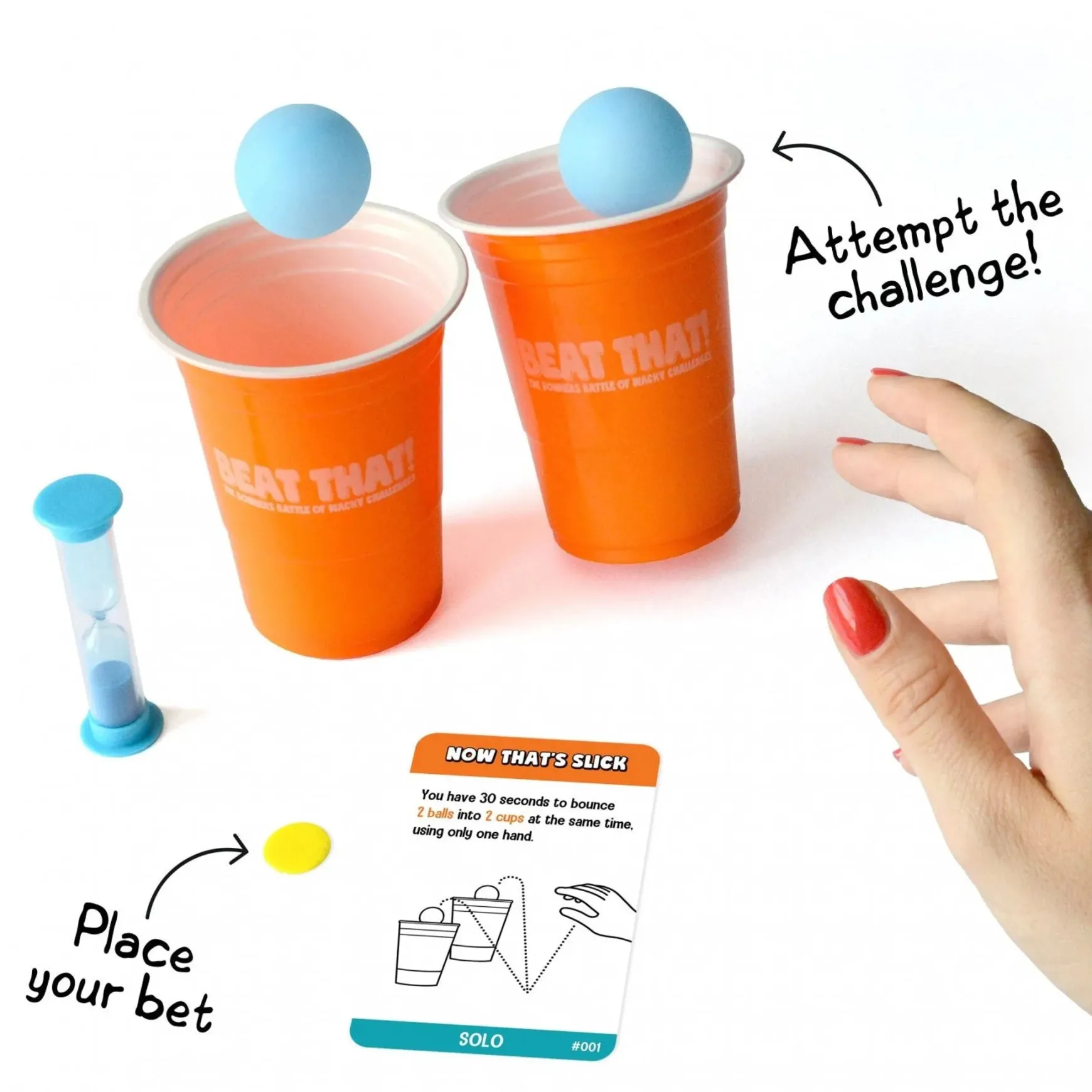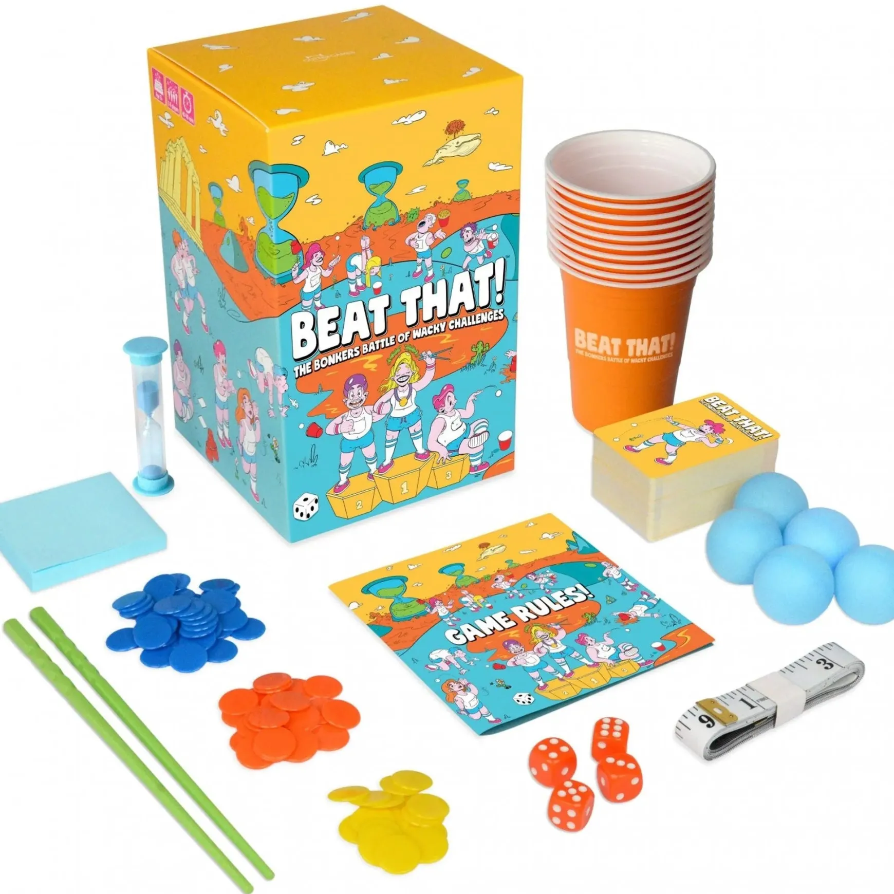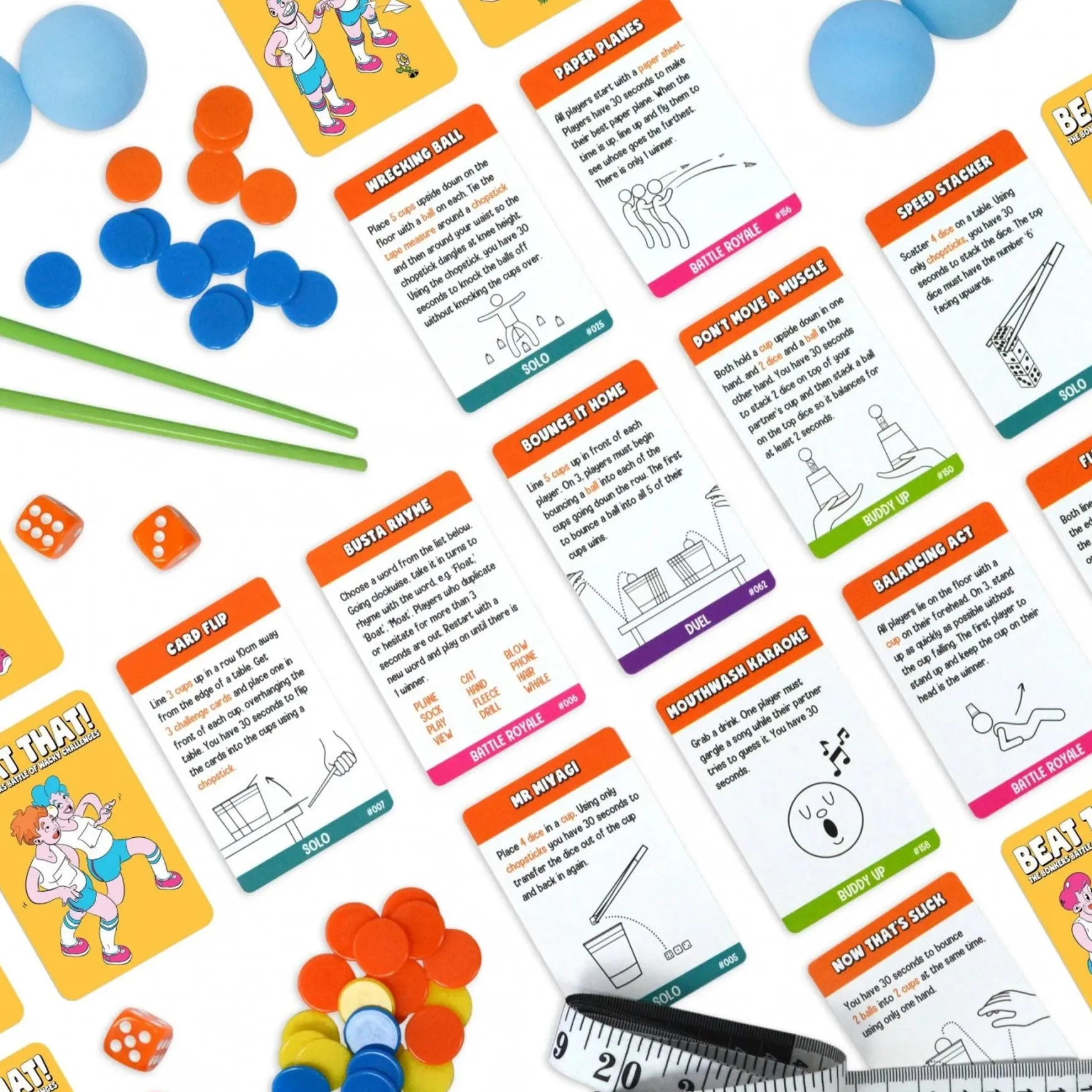 Beat That! consists of 10 rounds of challenges. Start by dealing 10 betting tokens to each player (tokens have different point values). Next, pick up a challenge card and read it aloud. All players then place a bet on their own ability to complete the challenge. Once bets are placed, go around the circle attempting the challenge. Players who succeed bank their points. The player with the most points at the end of 10 rounds is the champion!
