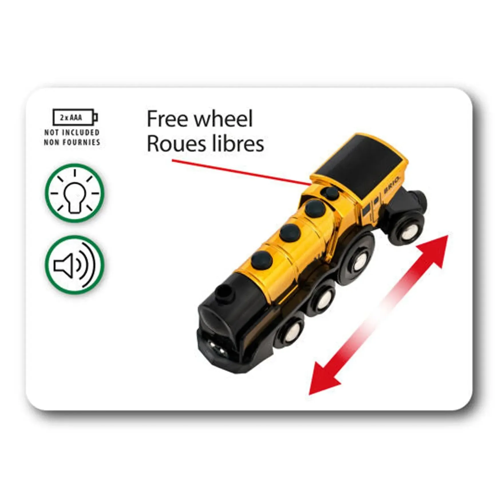With its shiny gold, metalized paint and classic “choo-choo” sound, the 33630 Mighty Gold Action Locomotive impresses everyone as it flies down the tracks at high speed. This battery-powered toy train is one of the strongest in BRIO World and drives forward and reverse with accompanying light and sound effects. It also features a switch on top which allows you to use the train without the battery function – disengaging the axel for free-wheel rolling. This retro designed train helps your child’s development by promoting logical thinking and improving fine motor skills.