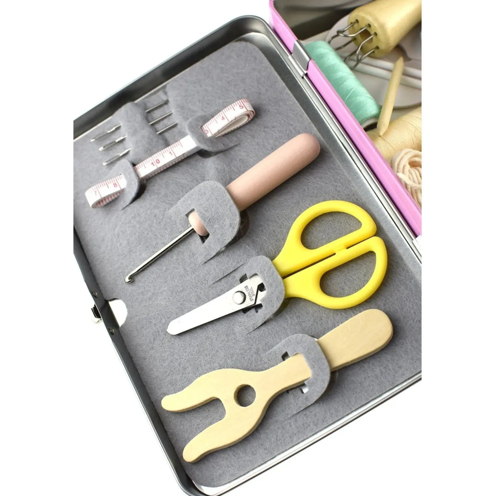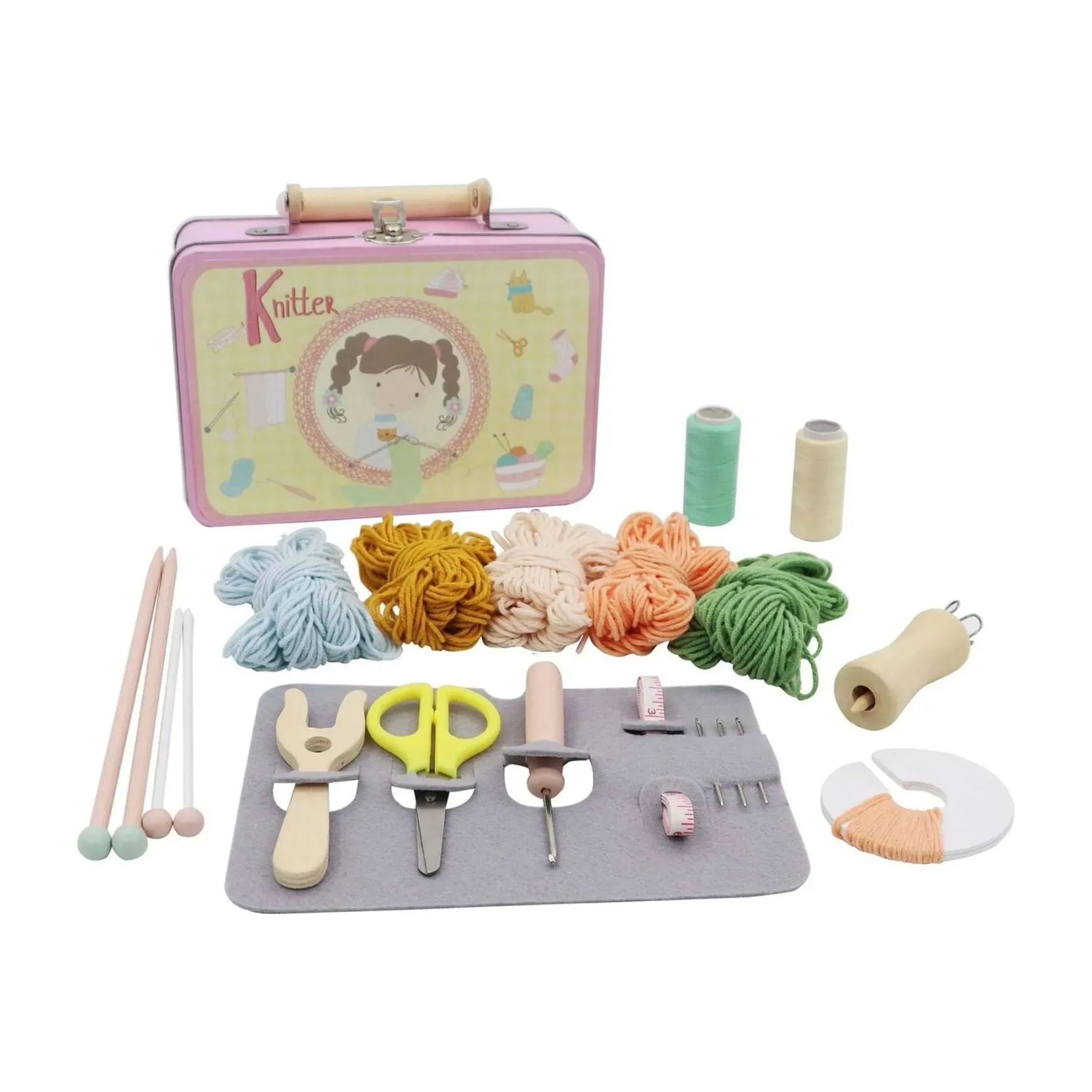 This kit comes with wood knitting needles approx 21cm long. Tin filled with nancy and thread and scissors.