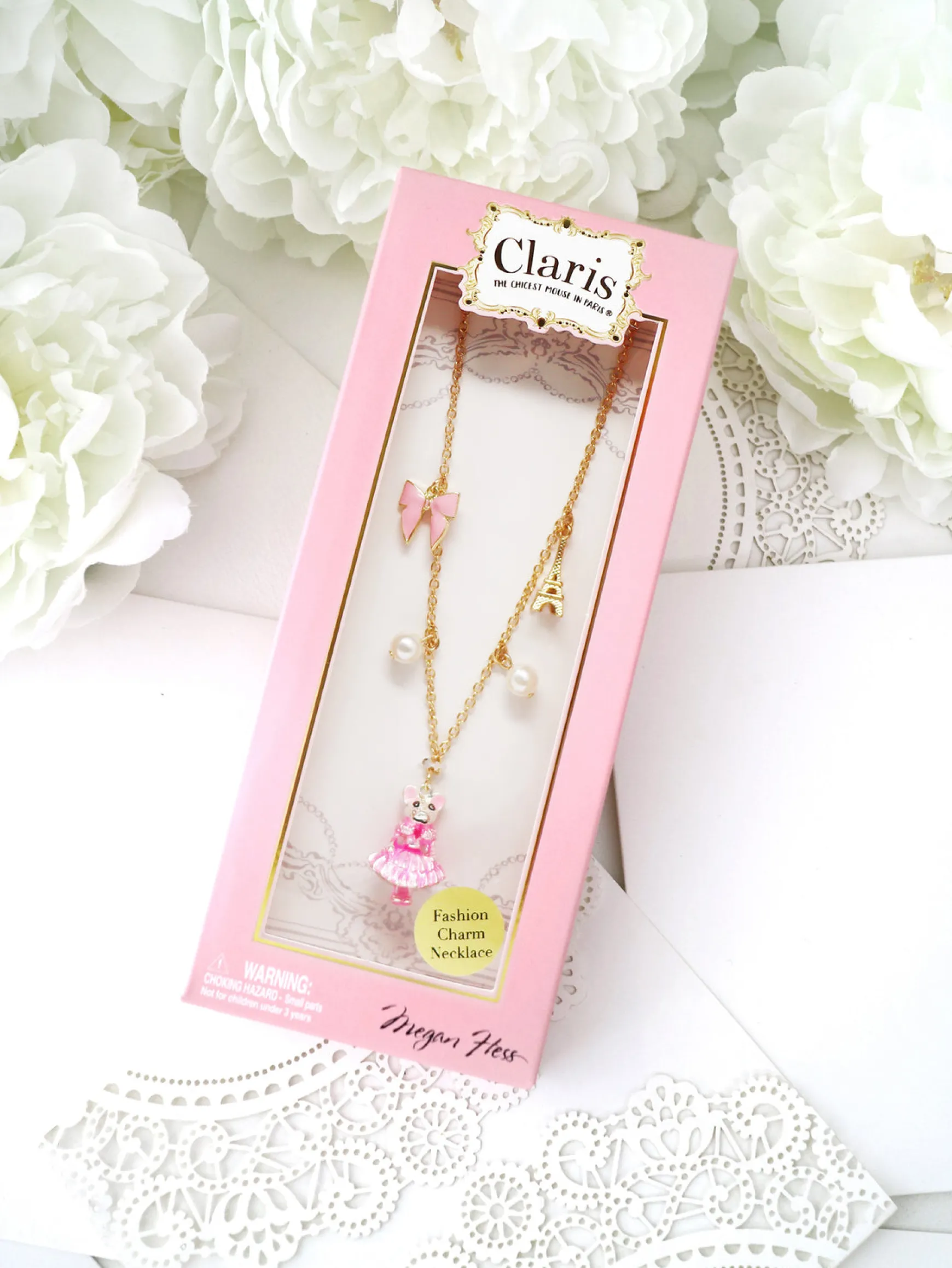 Hand-painted enamel detail on the 3D Charms Three 3D charms included: Claris, Eiffel Tower and Bow (2.5cm – 3cm charm drop) Two beaded pearls (1.5cm pearl drop) Necklace chain size: 40cm circumference (with a 6cm adjustable chain) ‘Claris’ gold metal engraved charm on the adjustable clasp Tested u0026amp; compliant to meet Australian u0026amp; International safety standards Packaged in Claris Signature Gift Box Designed in Australia Jewellery Care: Wipe with a damp cloth. Take off jewellery before swimming, bathing, washing up and cleaning, as well as prior to applying perfume or lotion. Keep jewellery stored safely in a jewellery box when not in use. Recommended age: 3+ years.Not for children under 3 years.