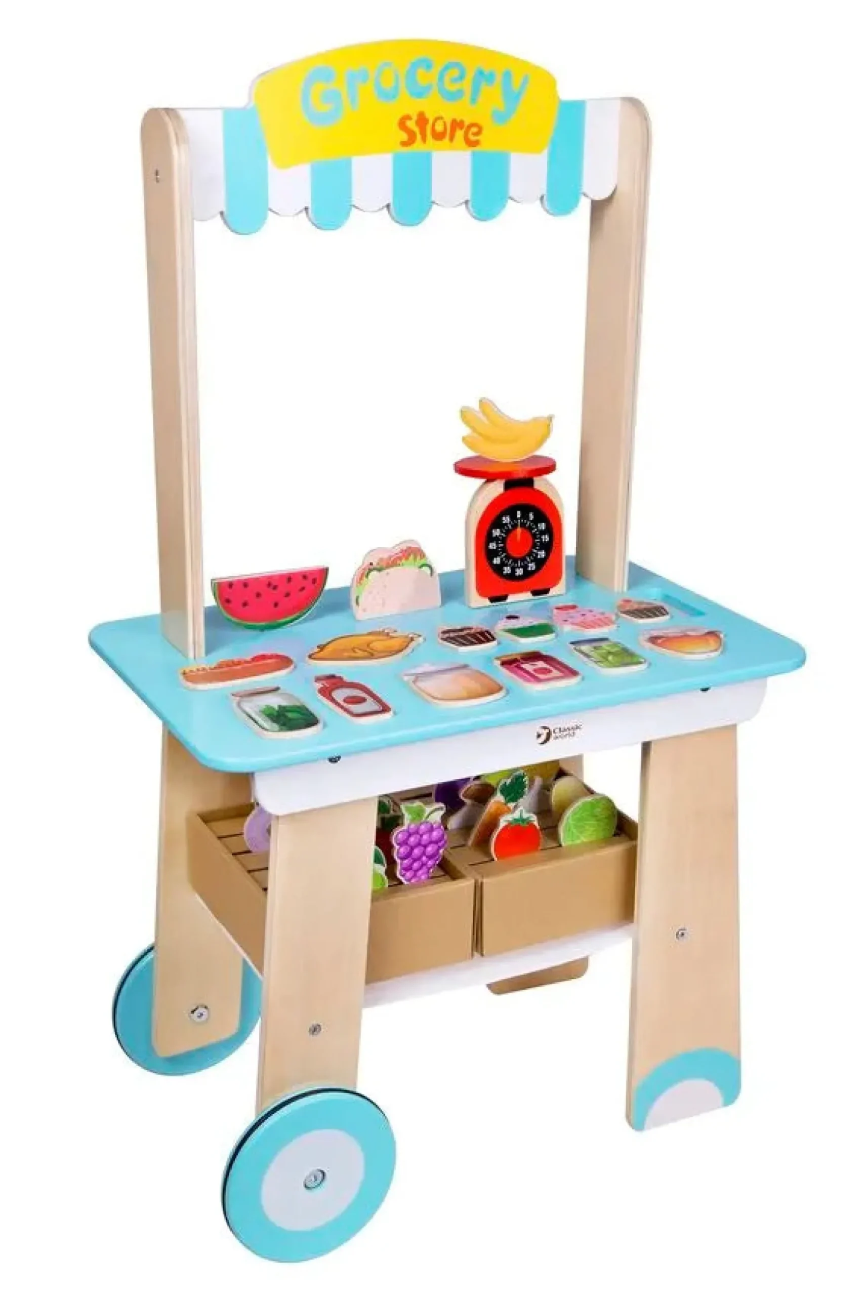 Our Wooden Grocery Store makes buying or selling fun and features fresh vegetables, fruit, milk, and handmade cookies. Your child will learn to identify produce and other foods as they enhance role play and creativity.