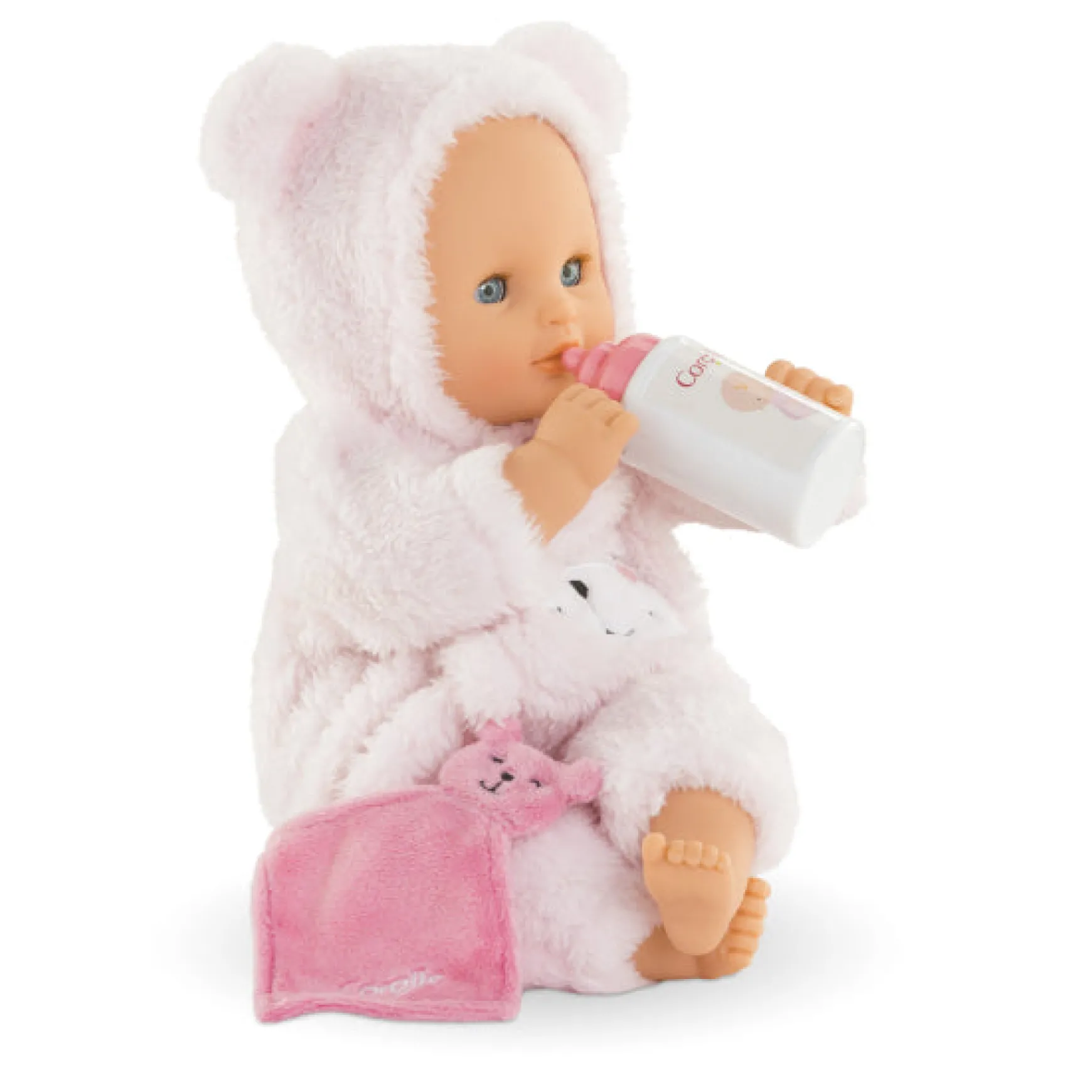 Dressed in a removable furry teddy bear suit that reveals a printed body underneath, Bébé Calin Loving Teddy Bear comes with its own feeding bottle and lovey, perfect for early nurturing play. This precious doll is part of the Mon Premier Poupon Corolle collection, designed to enhance imaginative caregiving.