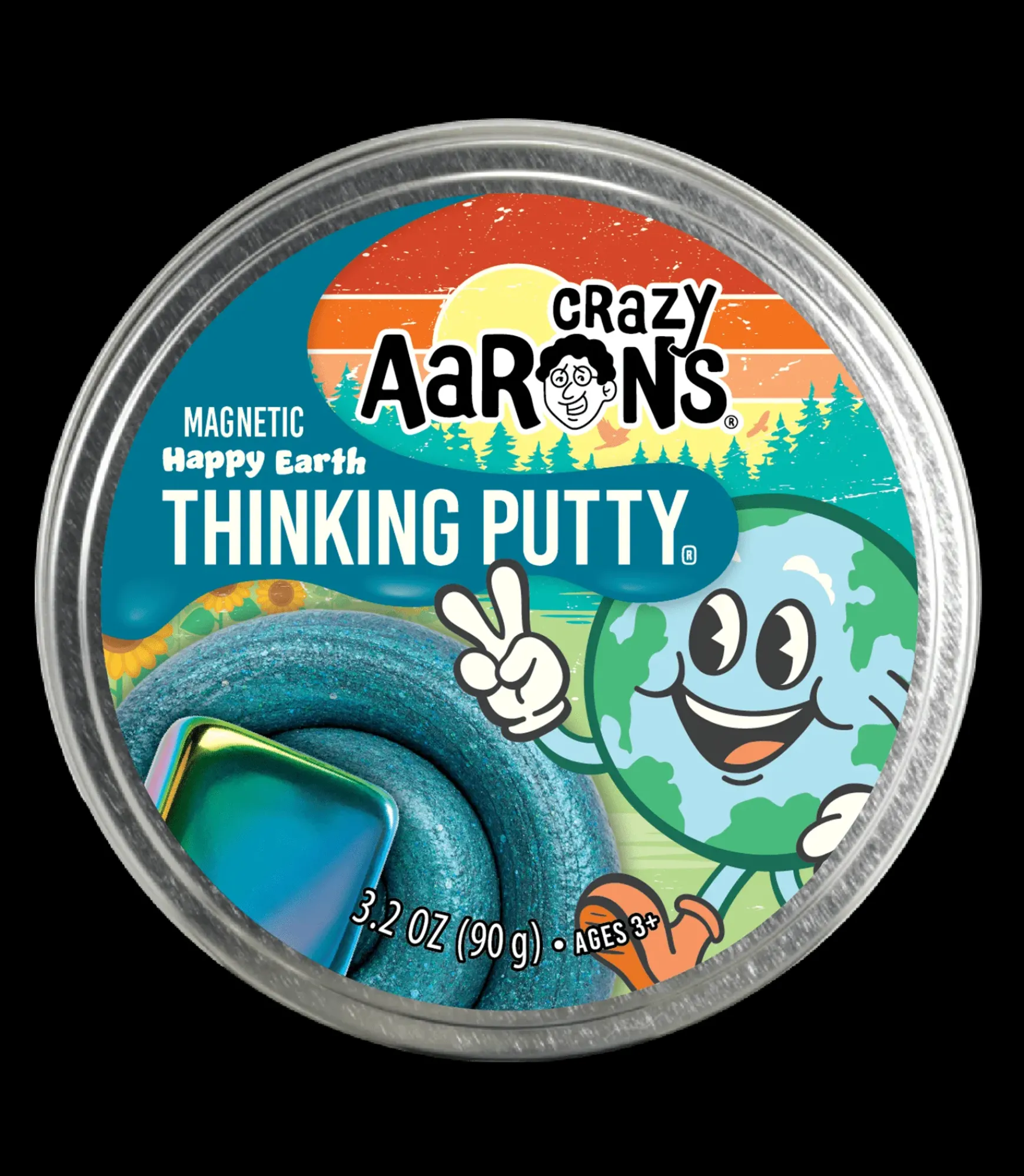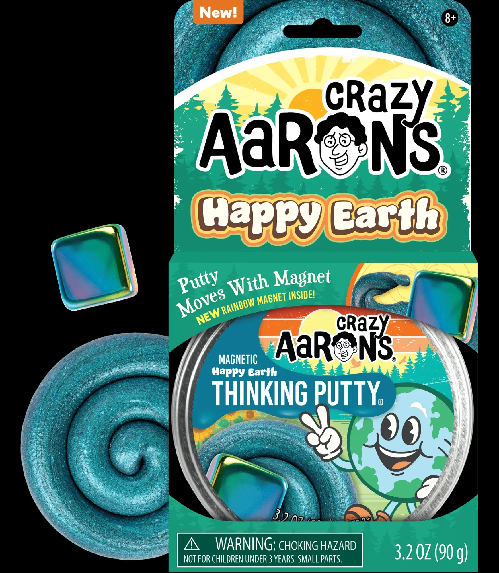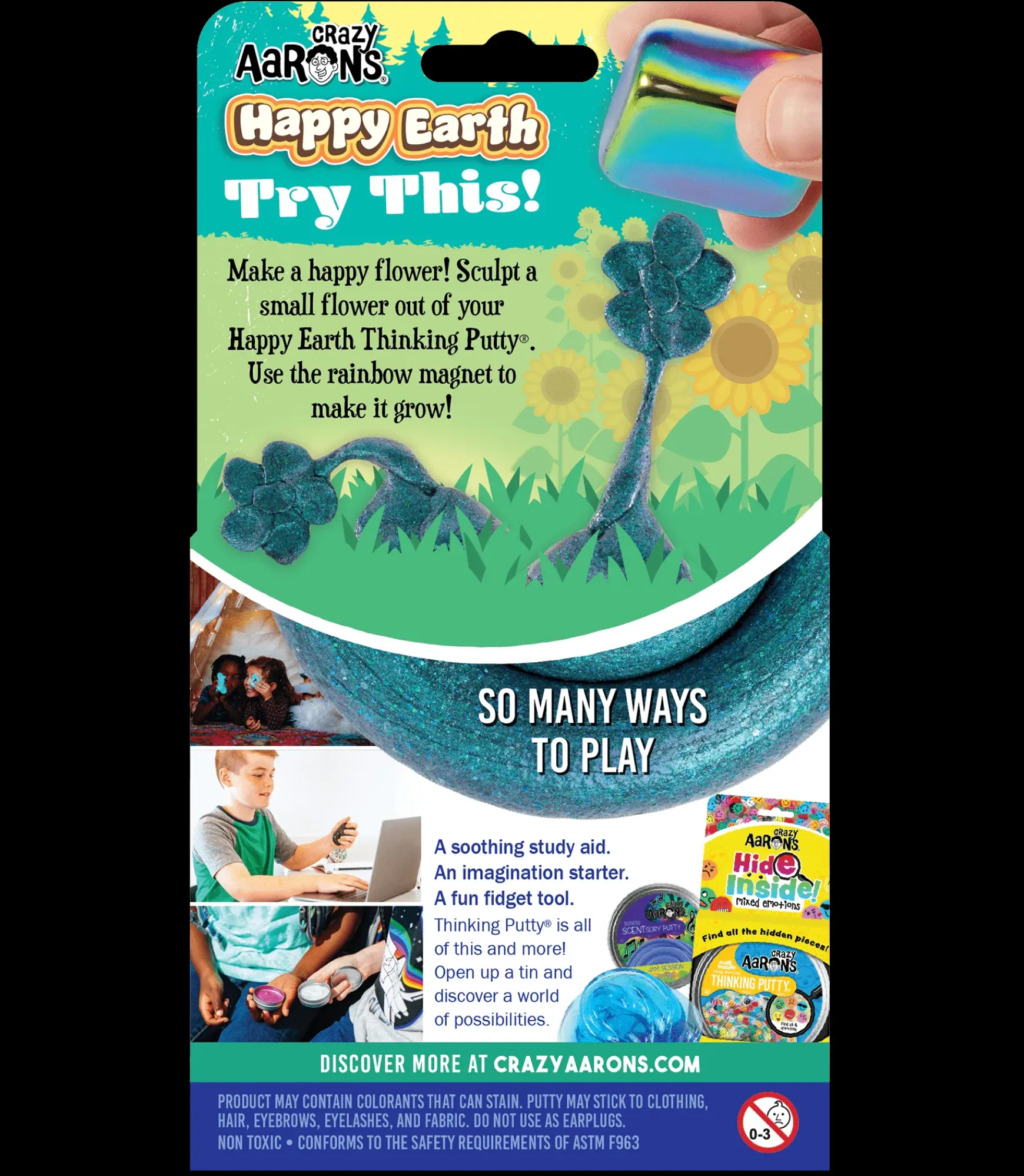 You’ll be a happy camper knowing our Thinking Putty® tins are made of food grade material that can be reused for crafts and projects or recycled with other metals like soup cans! When charged with the rainbow magnet, Happy Earth Thinking Putty® will gleefully dance around showing off its sparkling, mineral earth blue color.