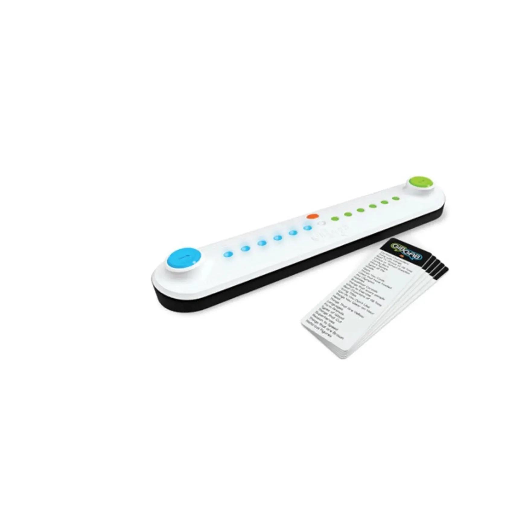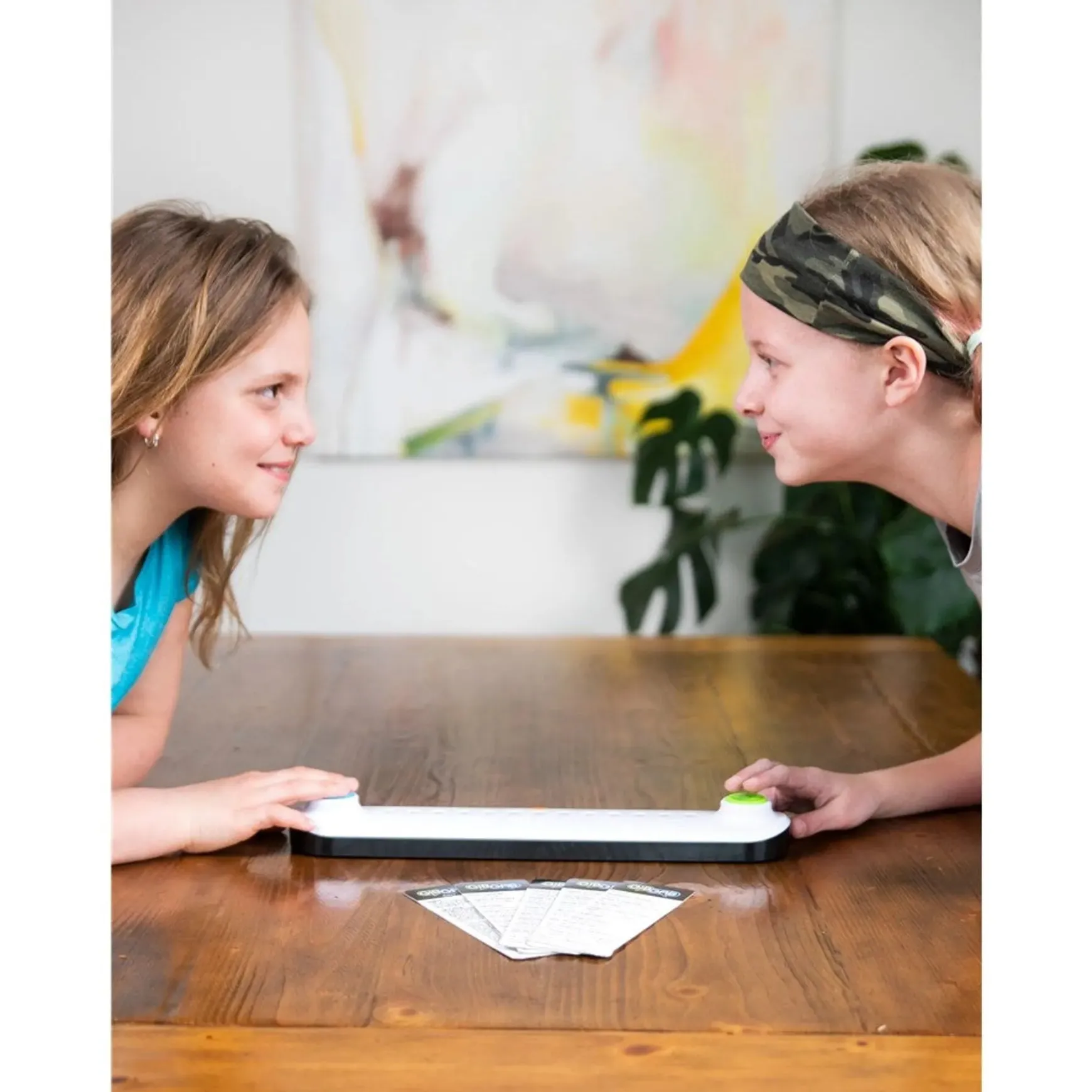 Can you gib faster than they can gab? Pick a category from one of the cards and then press the center button to switch it on. The lights on the game board light up, half yours, half theirs. Quick! Say a word that matches the category and then press your button. When you do, your lights begin to move toward your opponent. Now they’ve got to think fast, say a word, and press their button to get their lights moving back toward you! You can set the lights to move either 2 seconds per light, 1 and 1/2 seconds per light, or if you’re really feeling ambitious, just one second per light. Do you have the knowledge and memory skills to keep your opponent’s lights from ever reaching your end of the game board? Enliven your next game night with the heart-racing high-pressure challenge of GibGab!