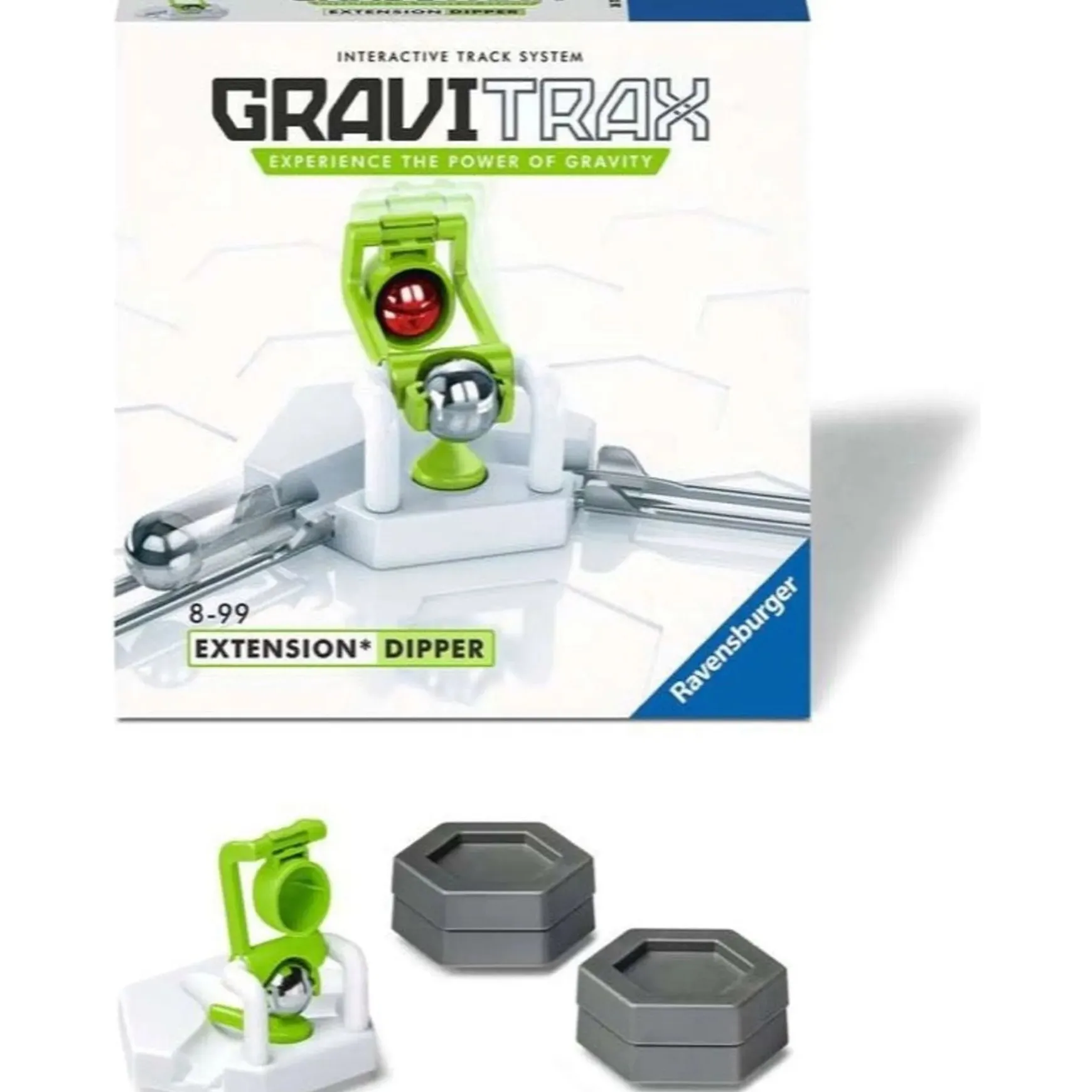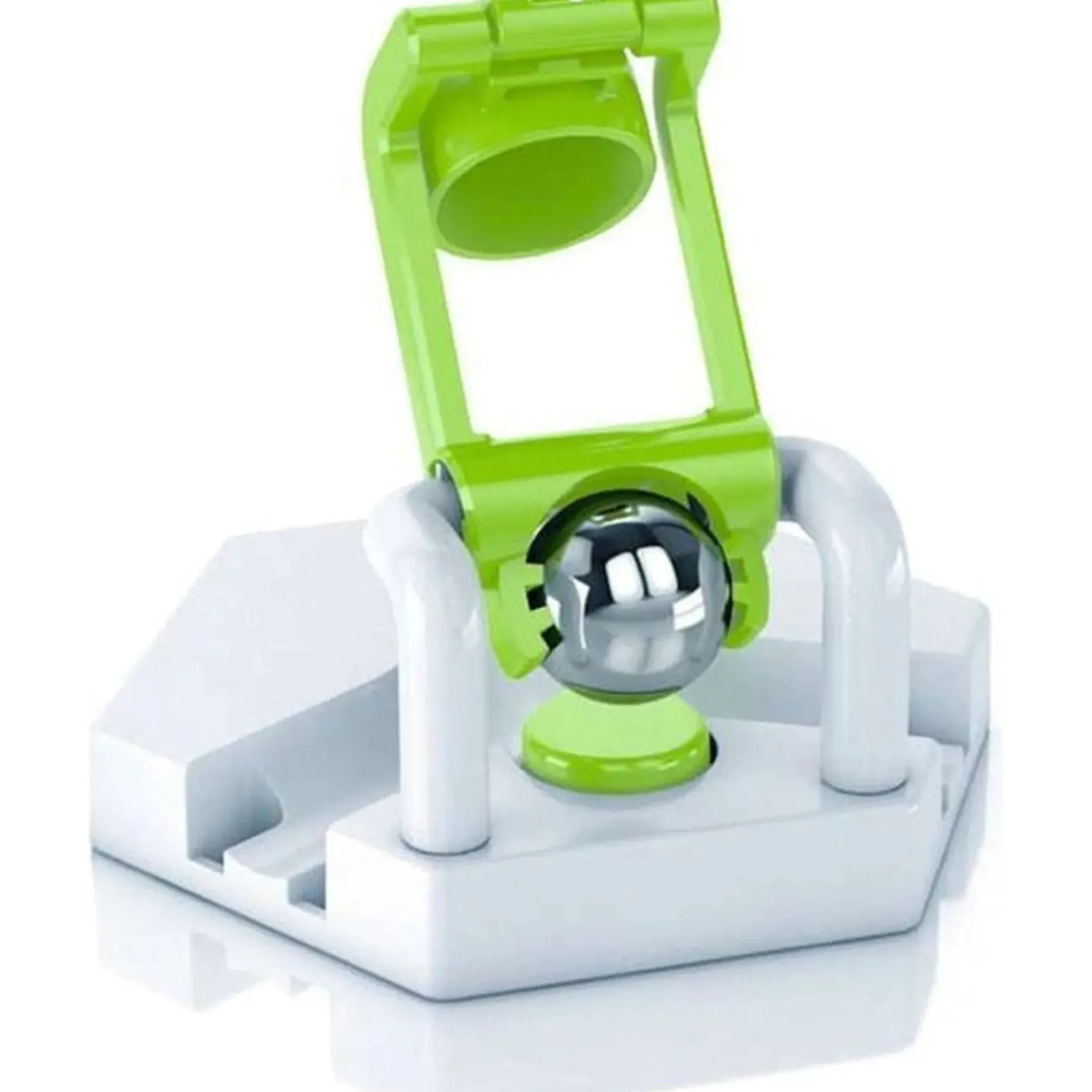 Dip down between levels! The Dipper will take your marble, pick it up, move down a level and drop it. Use this extension for a dynamic way to change between the levels in your tracks. You can control what side the ball will leave the Dipper allowing you to continue building in the right direction. Combined with the GraviTrax Starter Set, the Dipper will guarantee fast-paced fun and action-packed tracks!
