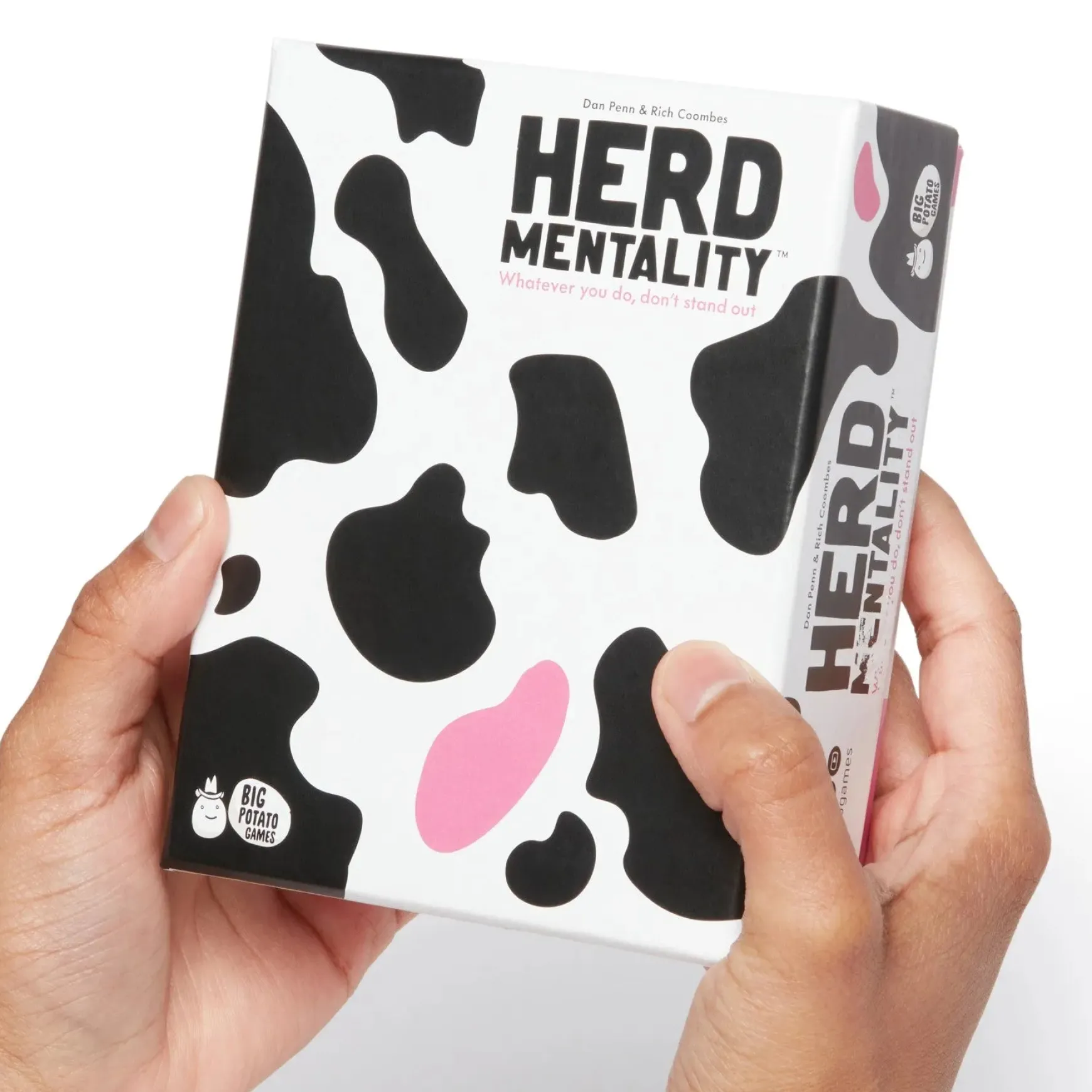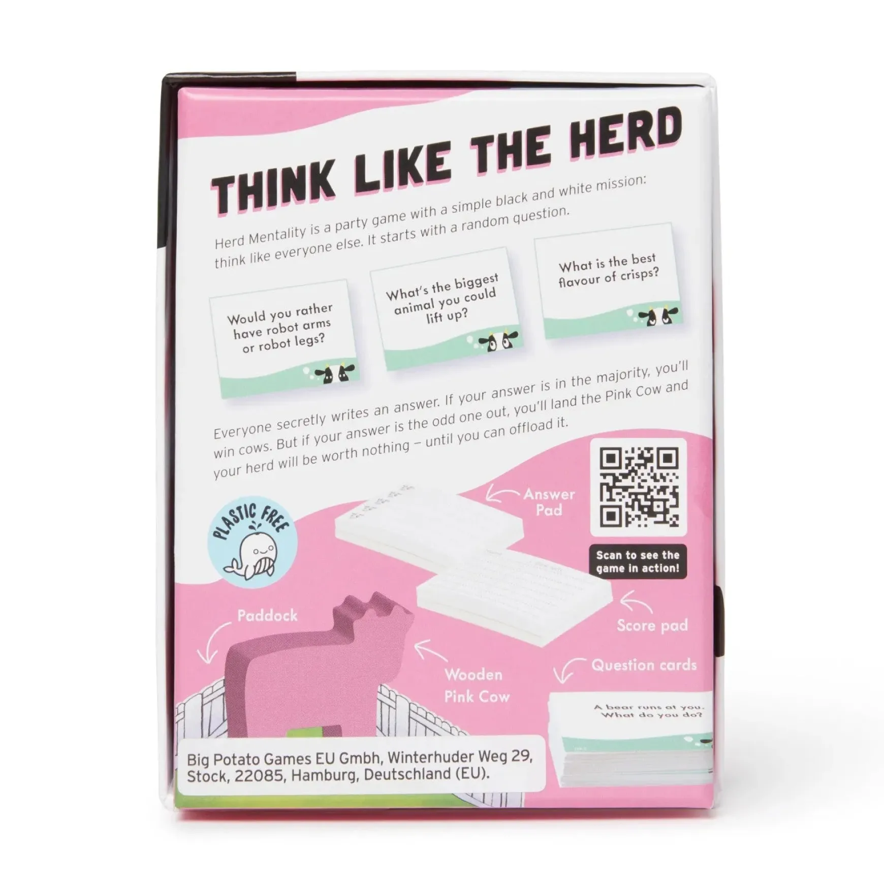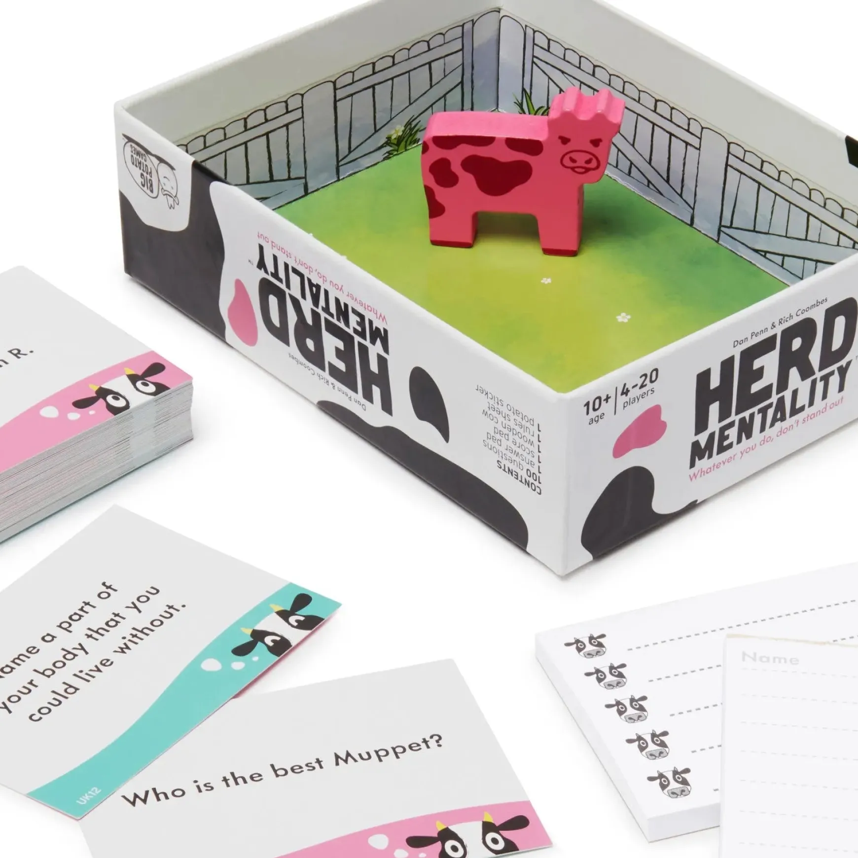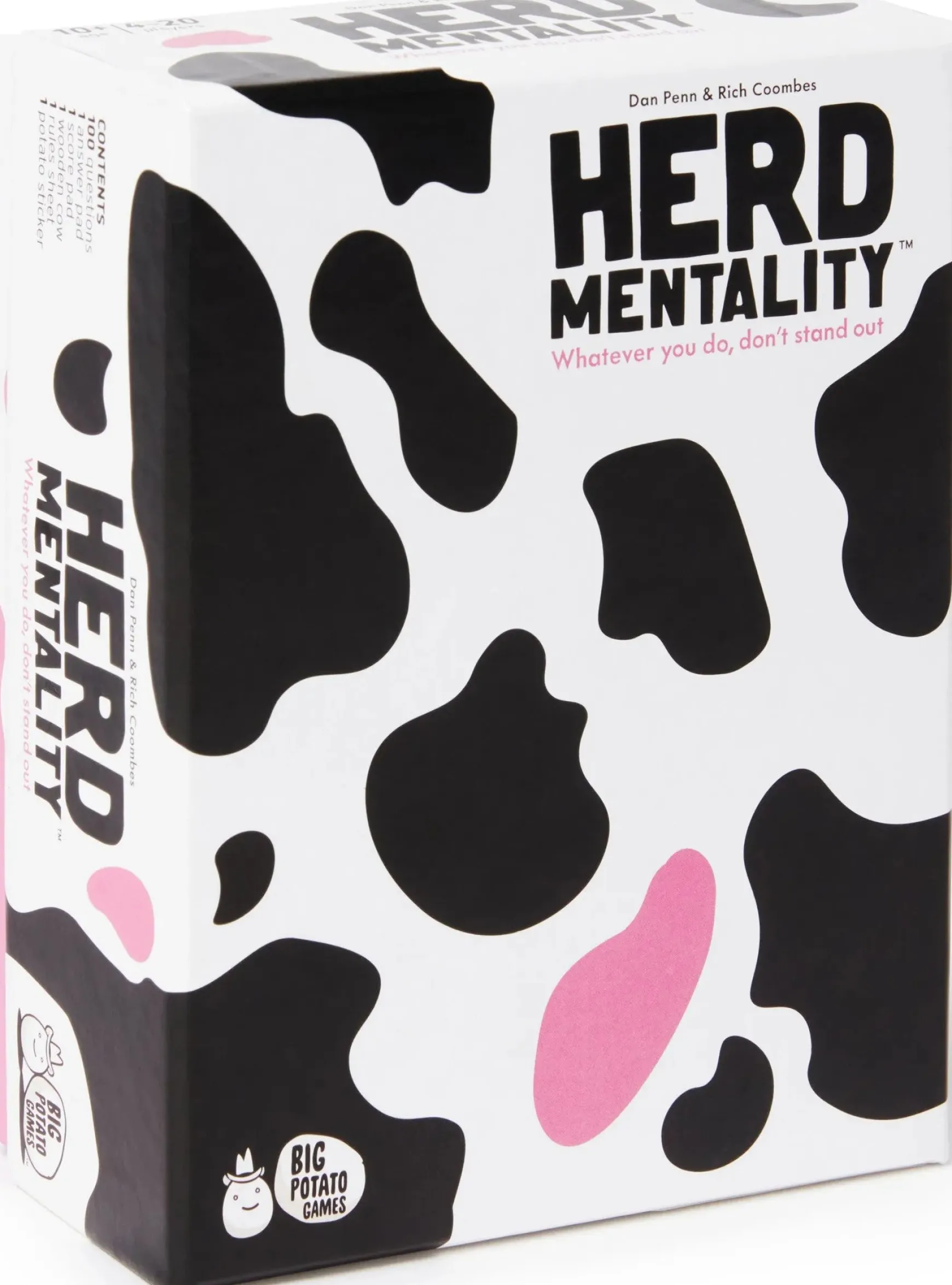 Herd Mentality is a party game with a simple black and white mission: write down the same answer as everyone else. It starts with a random question, then everyone secretly writes down an answer. If your answer is in the majority, you win cows. But if your answer is the odd one out, you’ll land the Pink Cow and your herd will be worthless unless you can pass it on!”