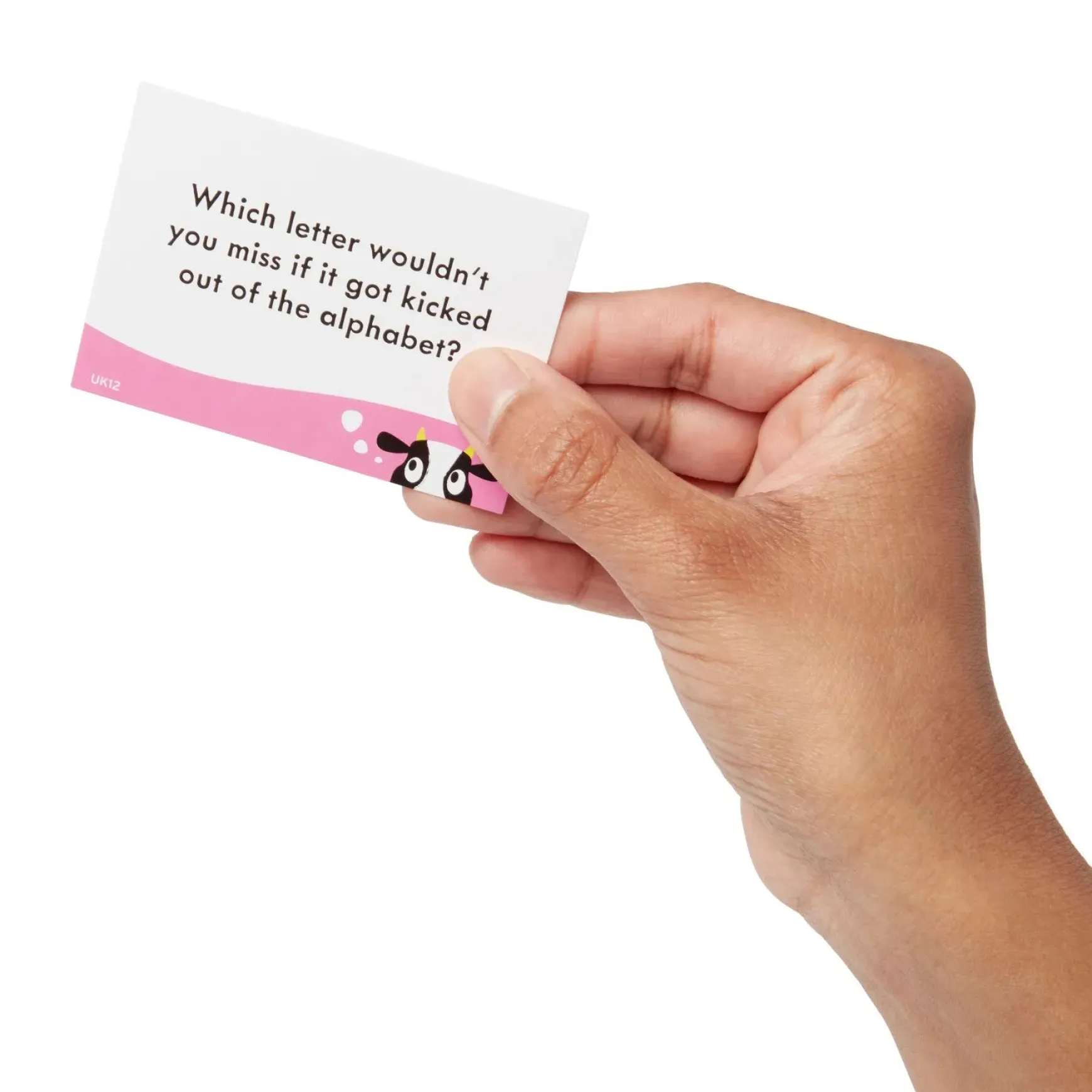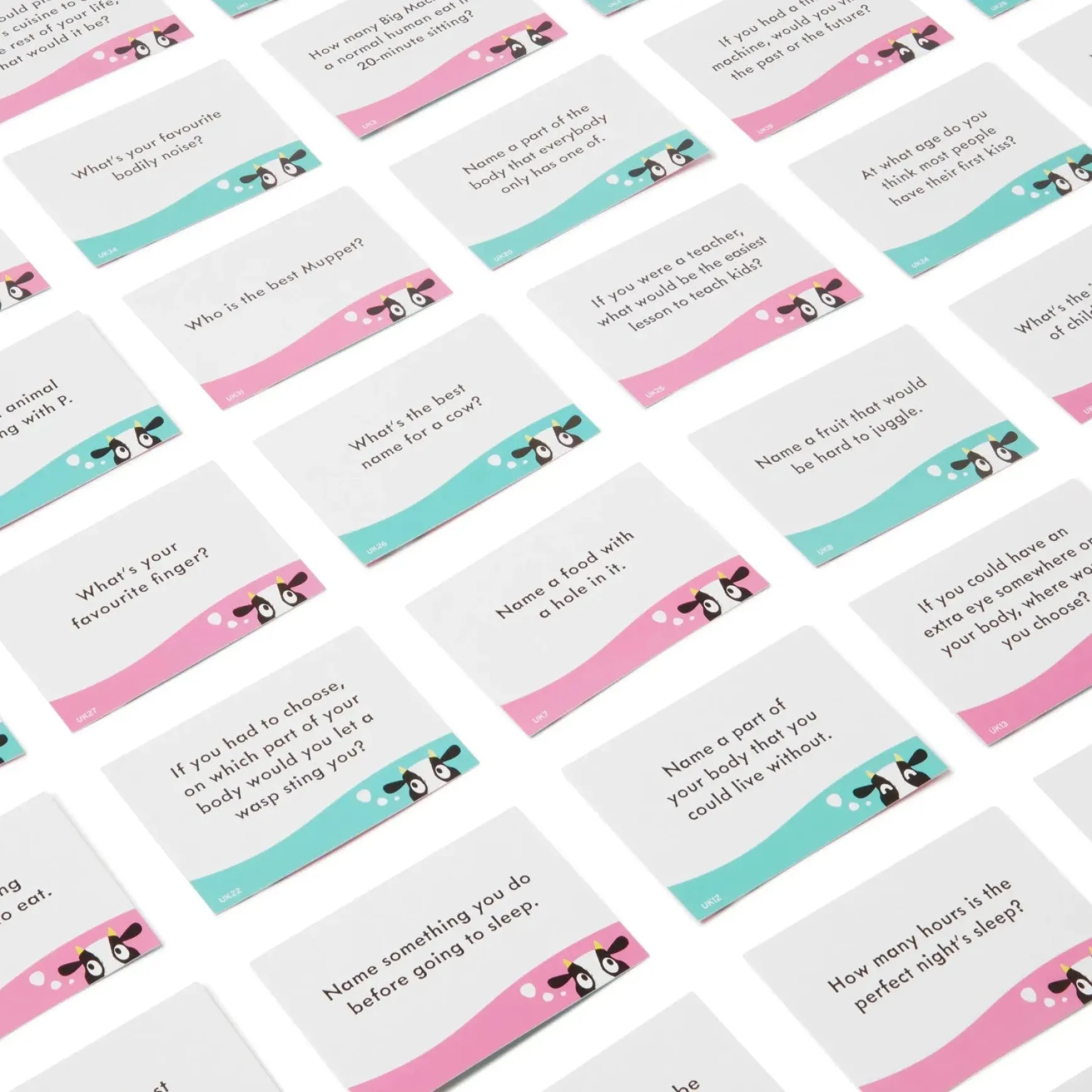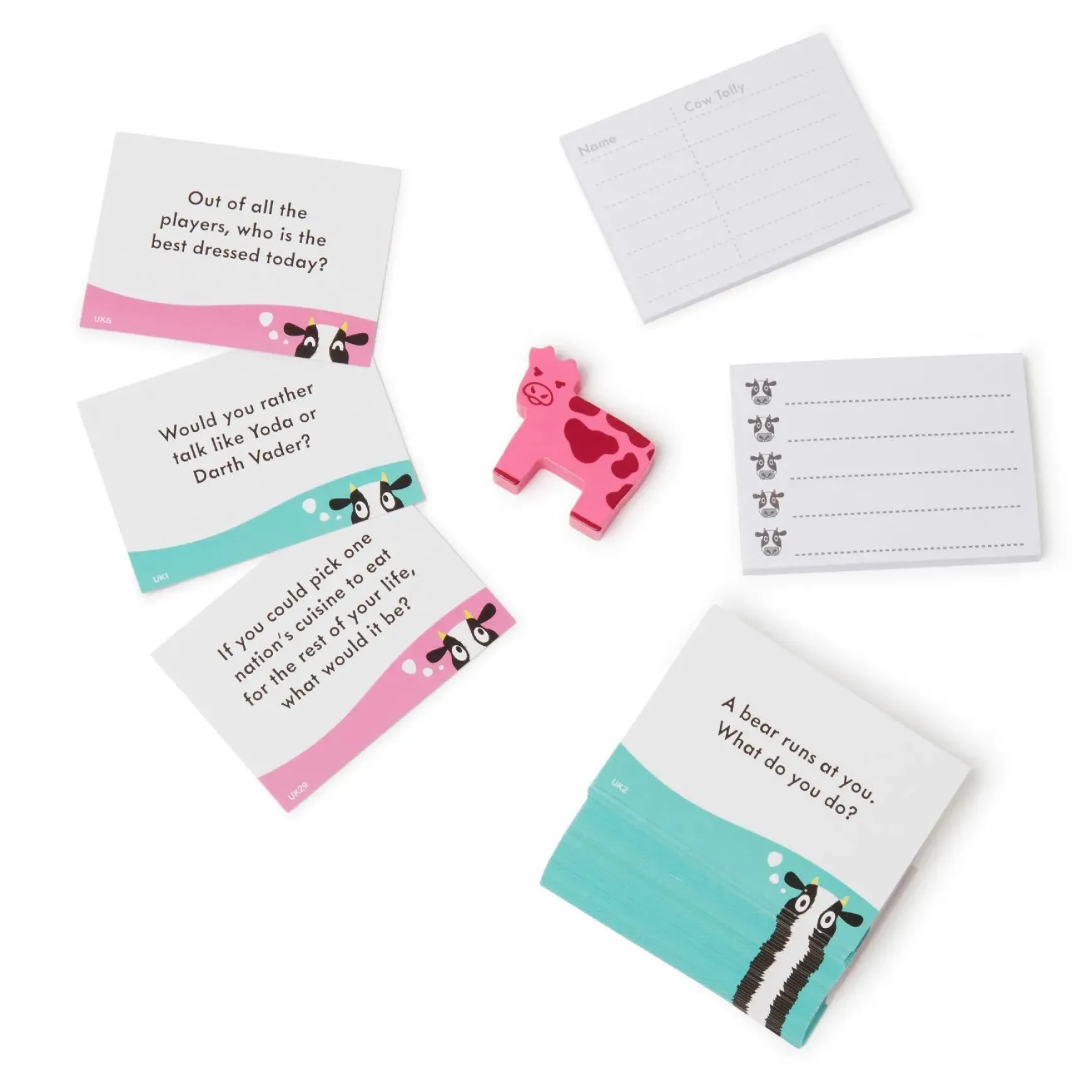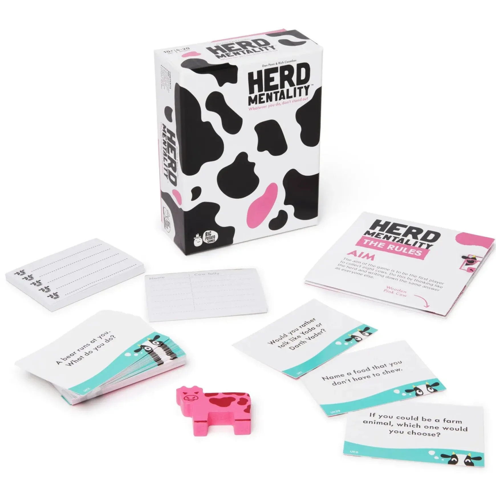 Herd Mentality is a party game with a simple black and white mission: write down the same answer as everyone else. It starts with a random question, then everyone secretly writes down an answer. If your answer is in the majority, you win cows. But if your answer is the odd one out, you’ll land the Pink Cow and your herd will be worthless unless you can pass it on!”