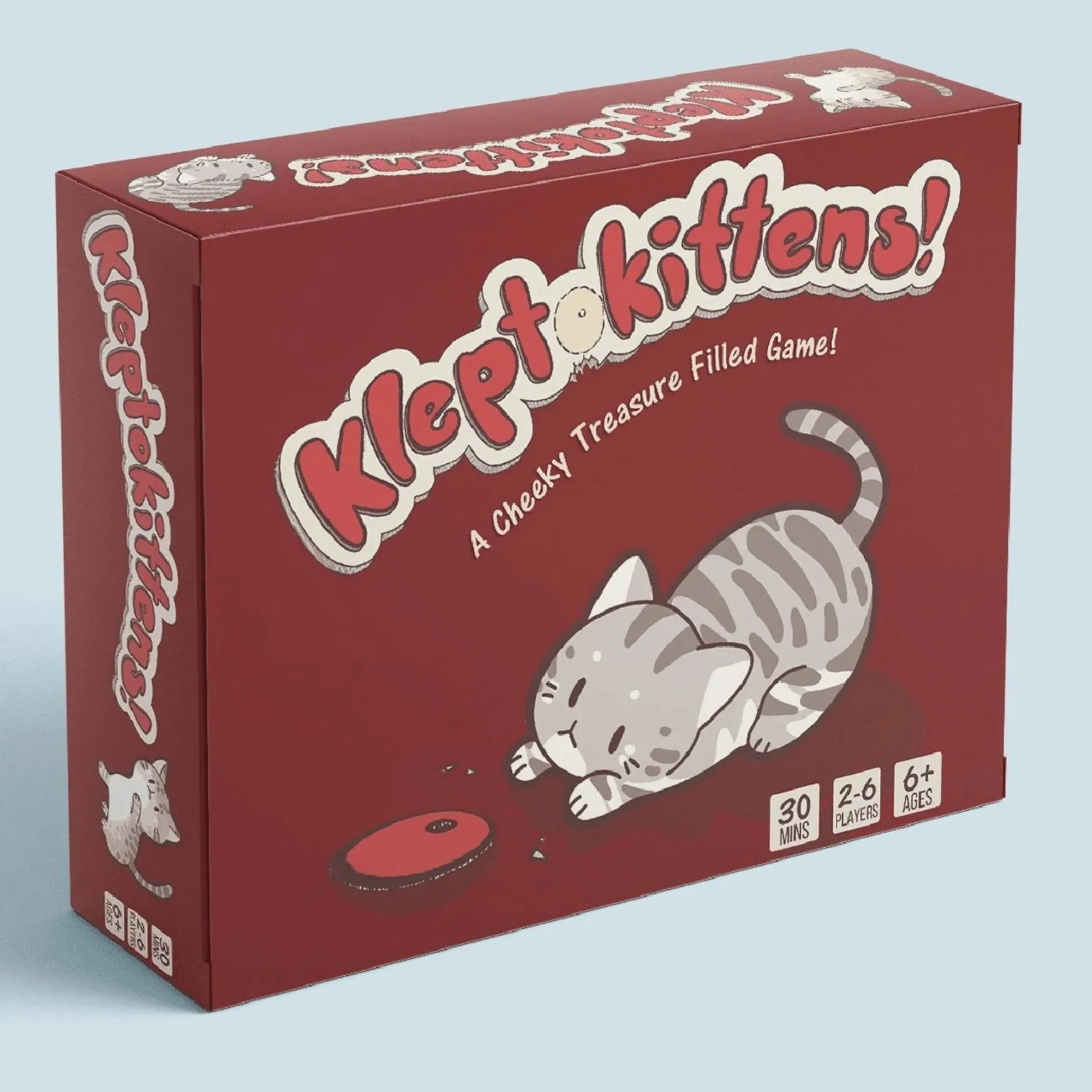 Kleptokittens! is a push your luck, memory game where players take turns flipping cards in a set time limit. For each pair they gain a treasure, if they find catnip they can swiftly boost their score. But watch out! If you turn up a spray bottle, your kitties stash is gone!