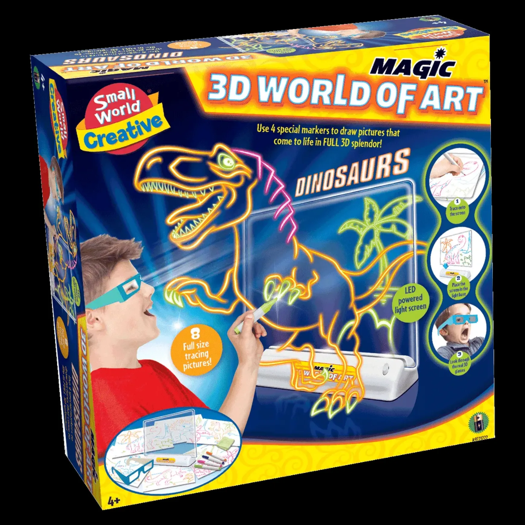 Magic 3D World of Art Use 4 special markers to draw pictures that come to life in FULL 3D splendour! LED powered light Screen Trace onto the screen, place the screen in the light base, look through the real 3D glasses! .4xAAA batteries required. Not included.