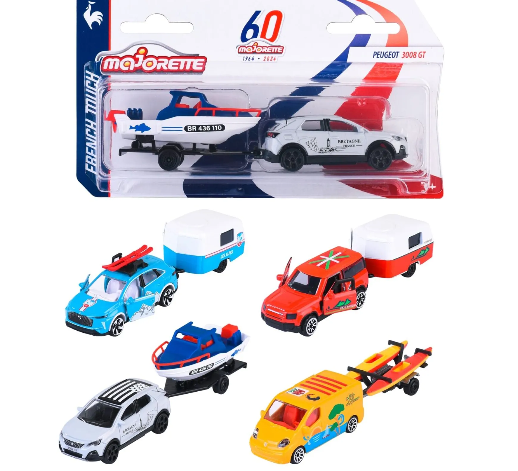Celebrate Majorette’s 60th anniversary with the French Touch Trailer (Assorted), a special edition collection that brings the charm of French design to life on the road. Each trailer in this assortment is paired with a beautifully detailed die-cast vehicle, representing the pinnacle of French automotive craftsmanship. From the sleek lines of a Renault pulling a stylish caravan to the robust design of a Citroën paired with a vintage trailer, these models are a tribute to the brand’s six decades of excellence in creating high-quality, realistic toy vehicles.
