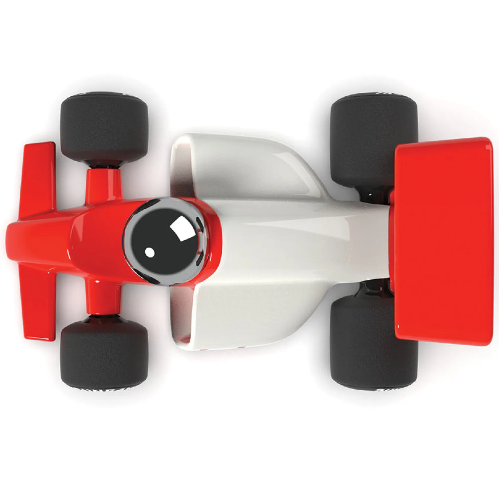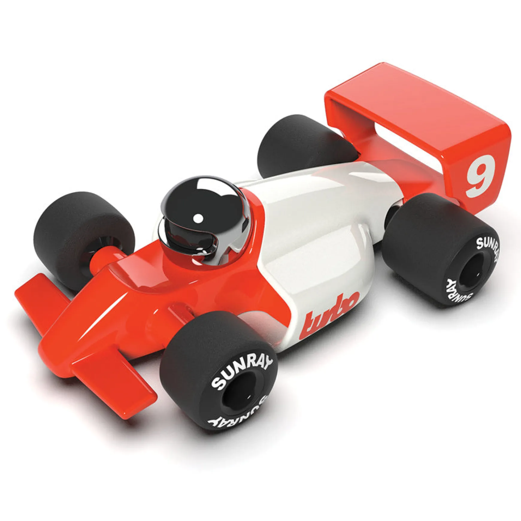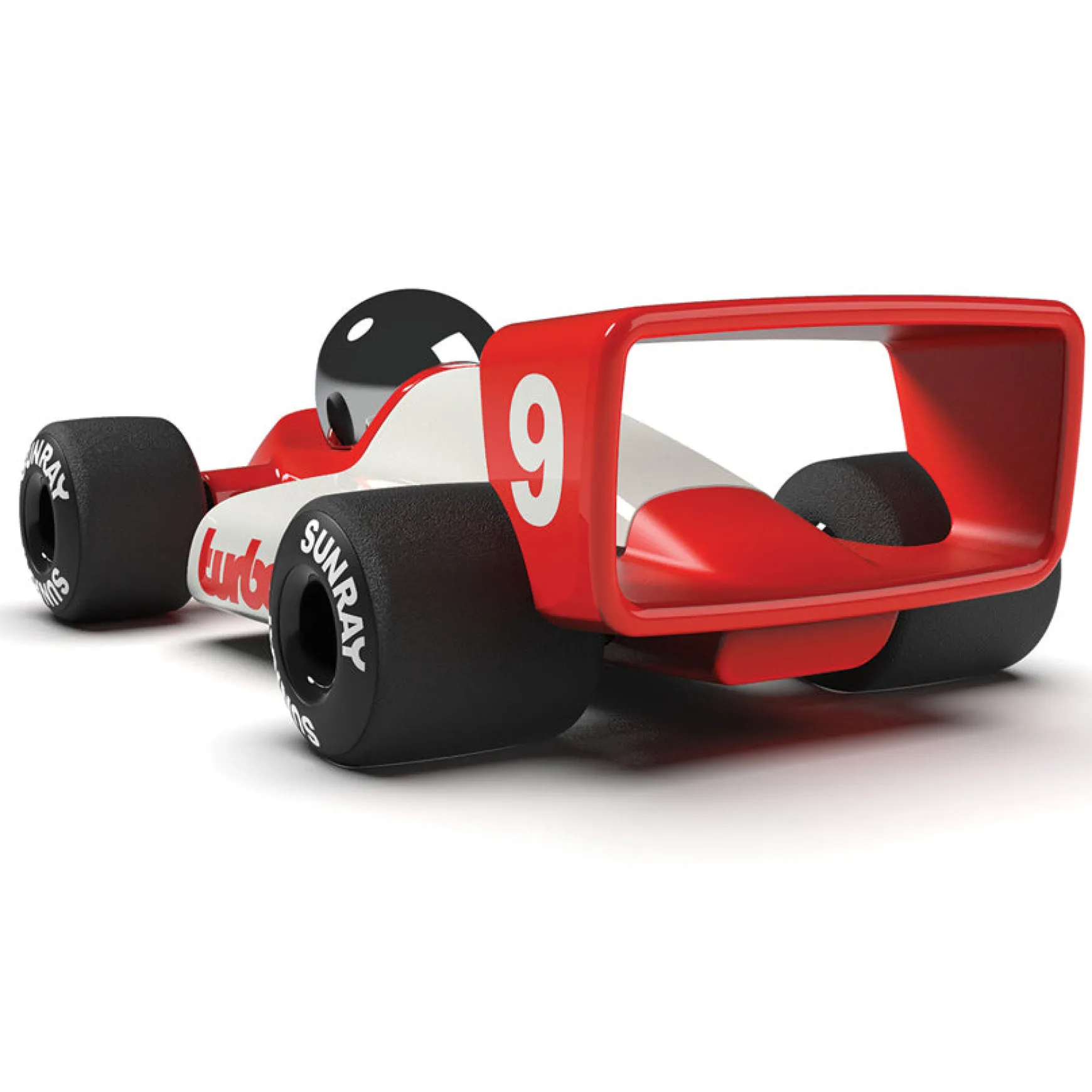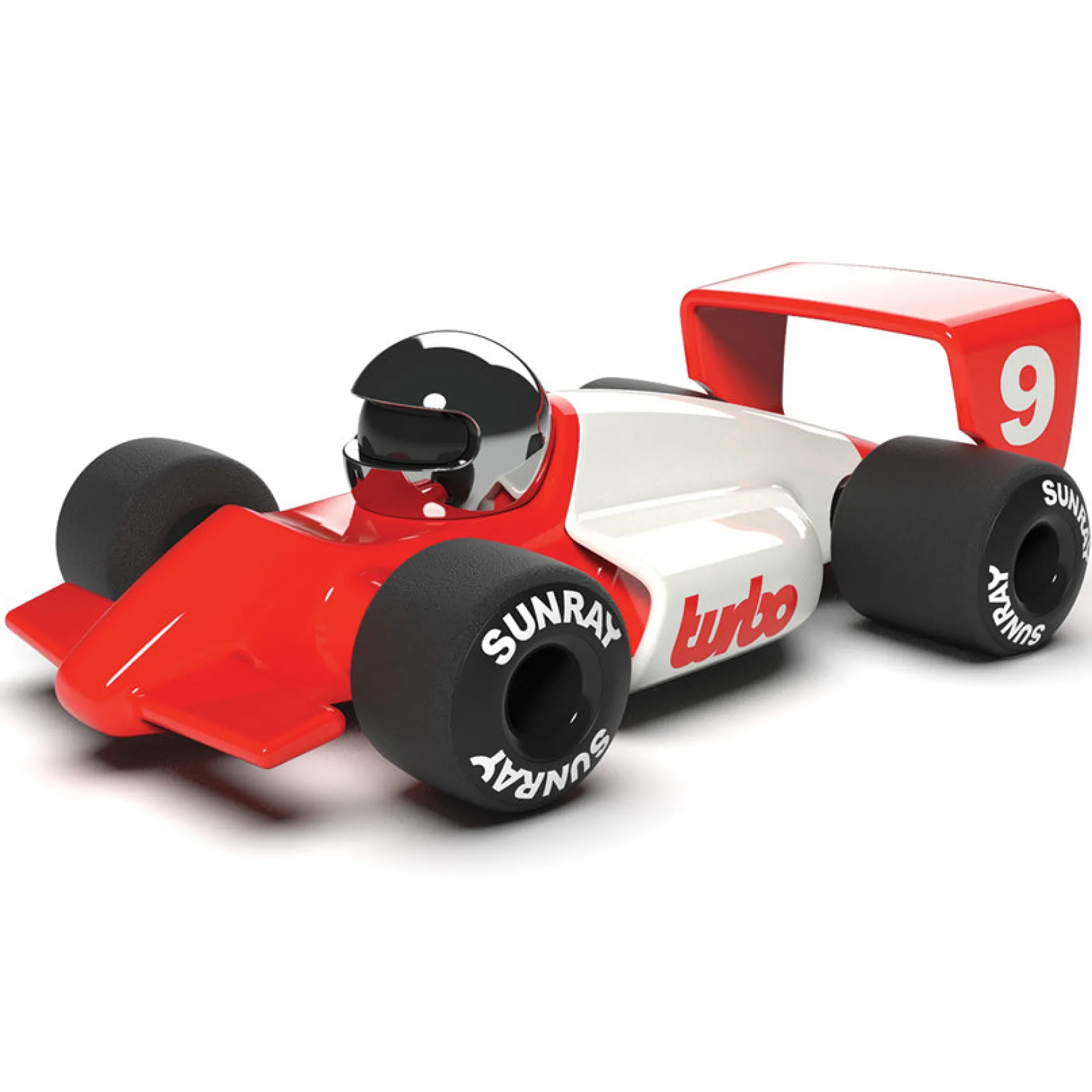 Turbo Lauper is bright red-orange and white with massive air ducts and bold graphics. Matching box wings and chrome helmet complete the tangible aesthetics Playforever is famous for. Reminiscent of Formula 1 in the 80’s the Playforever Verve Turbo series has authentic design with a flawless finish. Solidly constructed from heavy duty plastic with high gloss UV-resistant paint and rolling smoothly on soft rubber tyres they look just as good on the shelf as they do at play. You may not be able to buy the real thing but Playforever’s Turbo series is sure to bring delight to any toybox mantelpiece office or man cave.