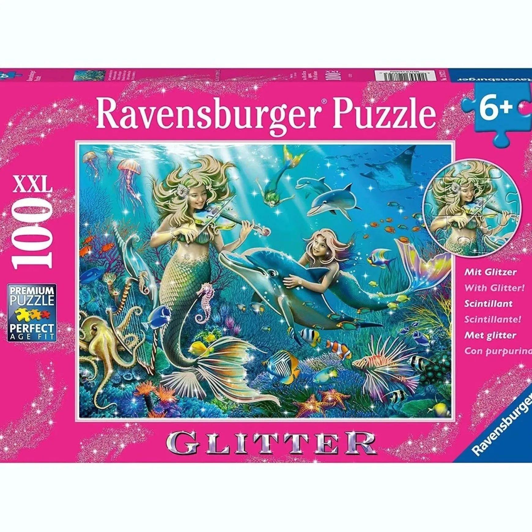 One Mermaid plays the violin while another rides a dolphin in this beautiful Glittering 100 piece puzzle! Showing a delightful underwater scene with a sea horse, an octopus playing a harp, starfish and fish all swimming at the bottom of the ocean. Made in Germany by Ravensburger. 100 piece jigsaw puzzle Finished Puzzle Size: 49 x 36 cm.