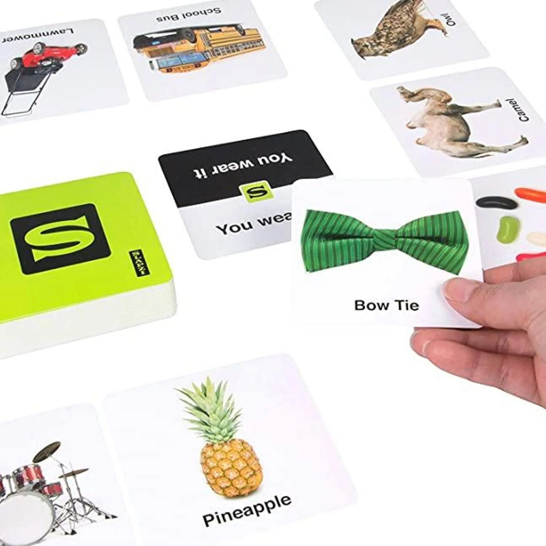 Be the first to match the right picture cards to the right clue cards. Each player is dealt 5 double sided picture cards which they lay out in front of themselves. The clue cards are placed upside down in the middle. Any player can flip over a clue card and players need to be the first to match one of their cards with the clue cards. The first player to get rid of all their picture cards wins! Plus, there are lots of other different ways to play! Contains 120 Double Sided picture Cards and 65 Clue Cards.
