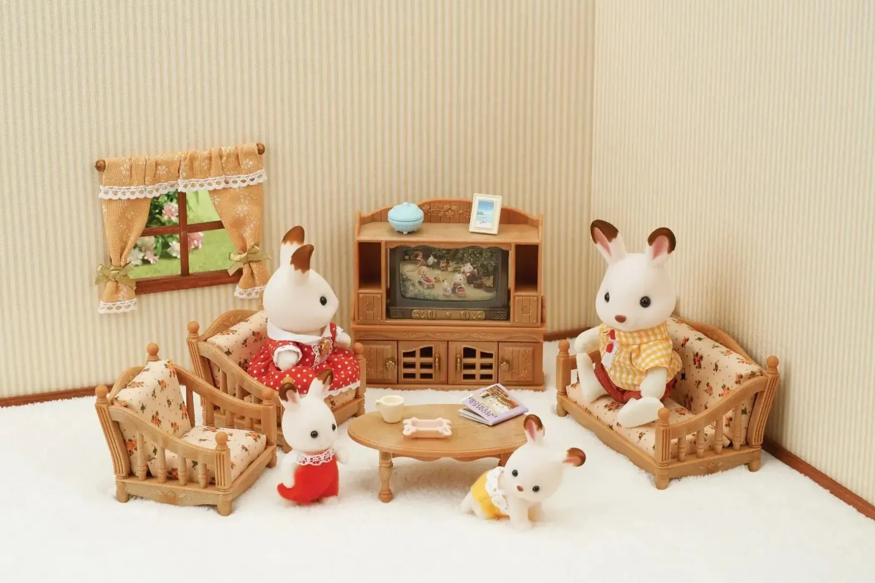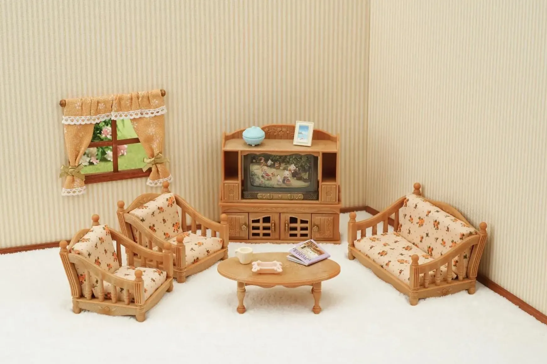 Comfy Living Room Set includes a sofa, armchairs, low table, TV and TV cabinet. Comfy Living Room Set features picture sheets within the TV that can be taken out and replaced to change the TV picture. The included interchangeable materials for the sofa and armchairs allow for easy design changes.