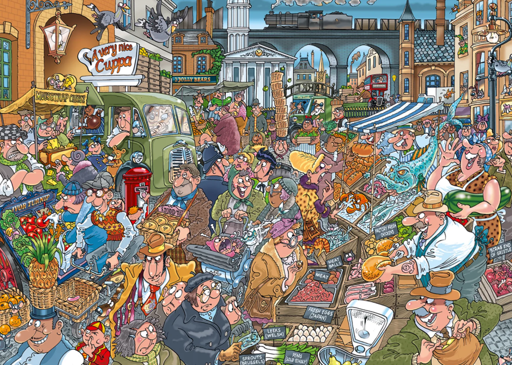 Immerse yourself in the vibrant world of “Organic Overload,” a 1000-piece puzzle that captures the evolving landscape of today’s bustling street markets! From family favourites and fresh produce to trendy organic options, this puzzle showcases a market square where the familiar meets the new. Here, traditional butchers and grocers stand alongside influencers and pop-up stands serving up meat-free, vegan, and sustainable choices. As you piece together this colourful scene, you’ll discover the lively fusion of old and new – a playful reflection of how today’s food trends and traditions collide.