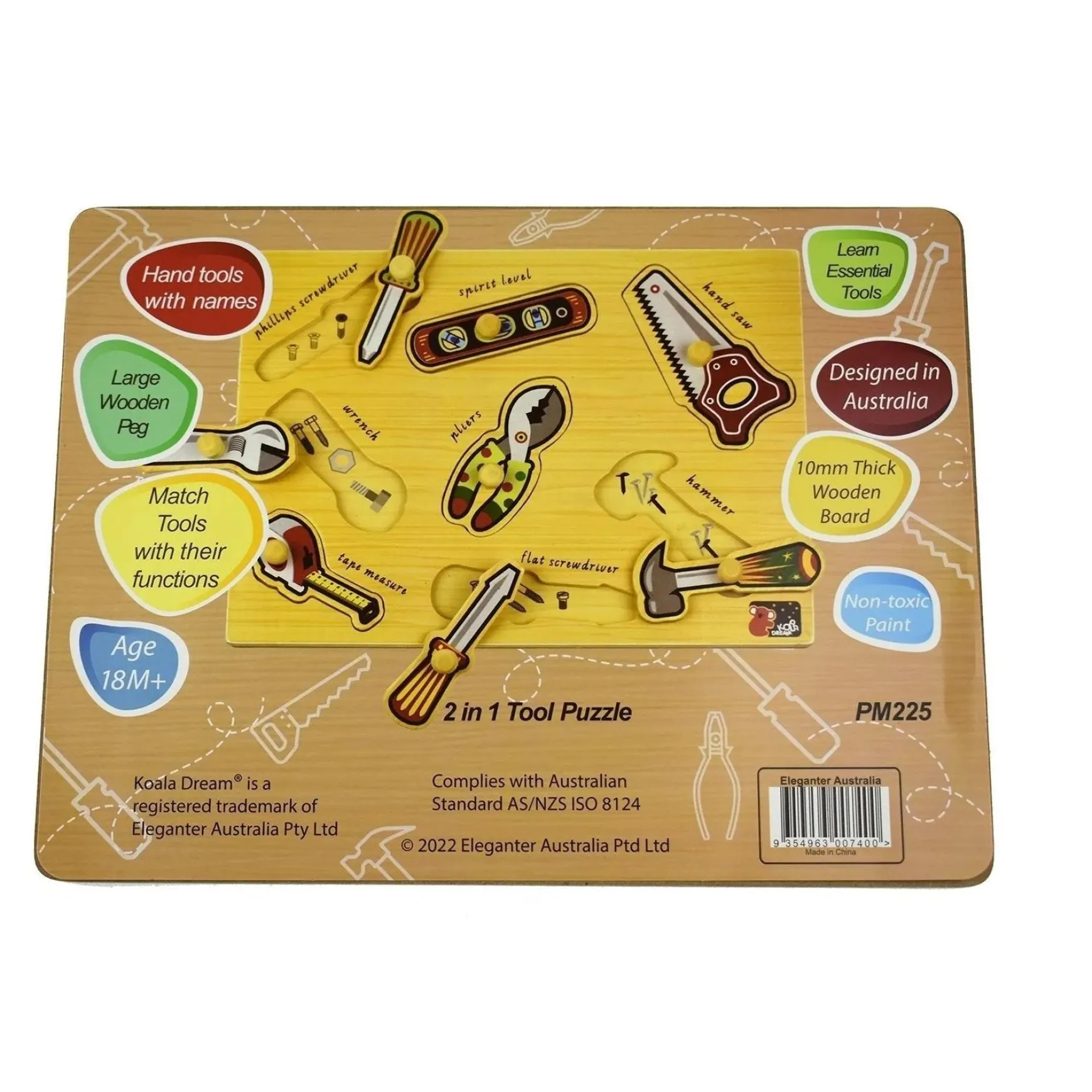 The new and improved 2 in 1 Tool Peg Puzzle by Koala Dream, designed specifically for toddlers. This engaging puzzle features eight wooden lift-out tools recessed in the base board, offering a delightful challenge for young children to discover and assemble.