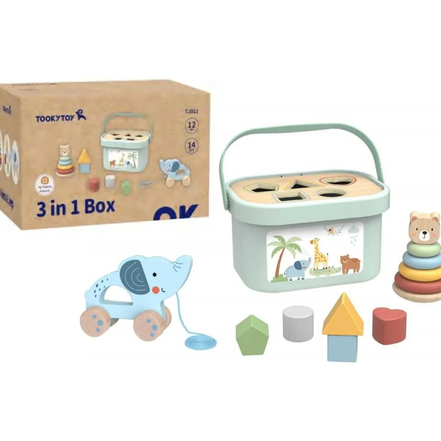 The 3 in 1 Toy Box from Tooky Toy is a classic toy set that includes a shape sorter toy, a bear stacker toy, an elephant push and pull toy and a plastic shape sorter bucket. The bucket features five different colourful shape holes that allow children to practice shape recognition and problem-solving skills as they sort the shapes into the corresponding holes. The bear stacker toy consists of a tower with four rings and one bear head, allowing children to stack the rings in order of size and improve their fine motor skills. The elephant push and pull toy is an adorable addition to the set, allowing children to practice walking and balance as they pull the toy along behind them or push it in front of them. All the blocks and rings fit in the bucket with a carry handle, making it easy to store and transport the set. This 3 in 1 toy set is perfect for children who love to play and learn. It promotes shape recognition, fine motor skills development, and imaginative play, making it an excellent addition to any child’s toy collection. The set is made with durable materials and designed to withstand the wear and tear of playtime, ensuring hours of entertainment for children. The wooden and plastic 3 in 1 Toy Box from Tooky Toys is made from timber and finished to the highest quality and is painted in child safe, non toxic paint.