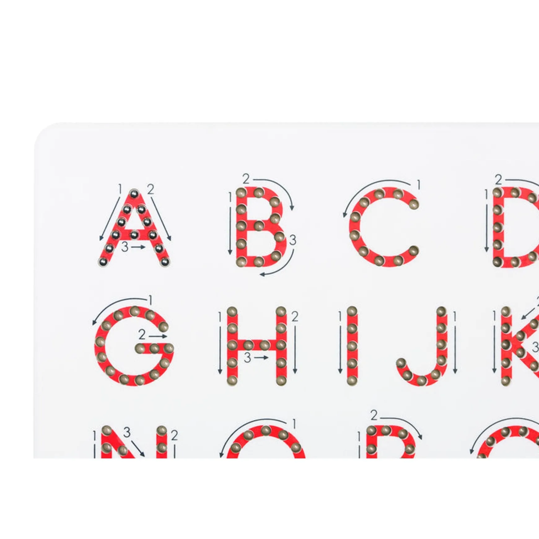 Kids writing their first letters will get helpful up, down and sideways instructions via easy-to-follow arrows. A magnetic stylus pulls beads up to create solid lines. Erases with the tip of a finger.