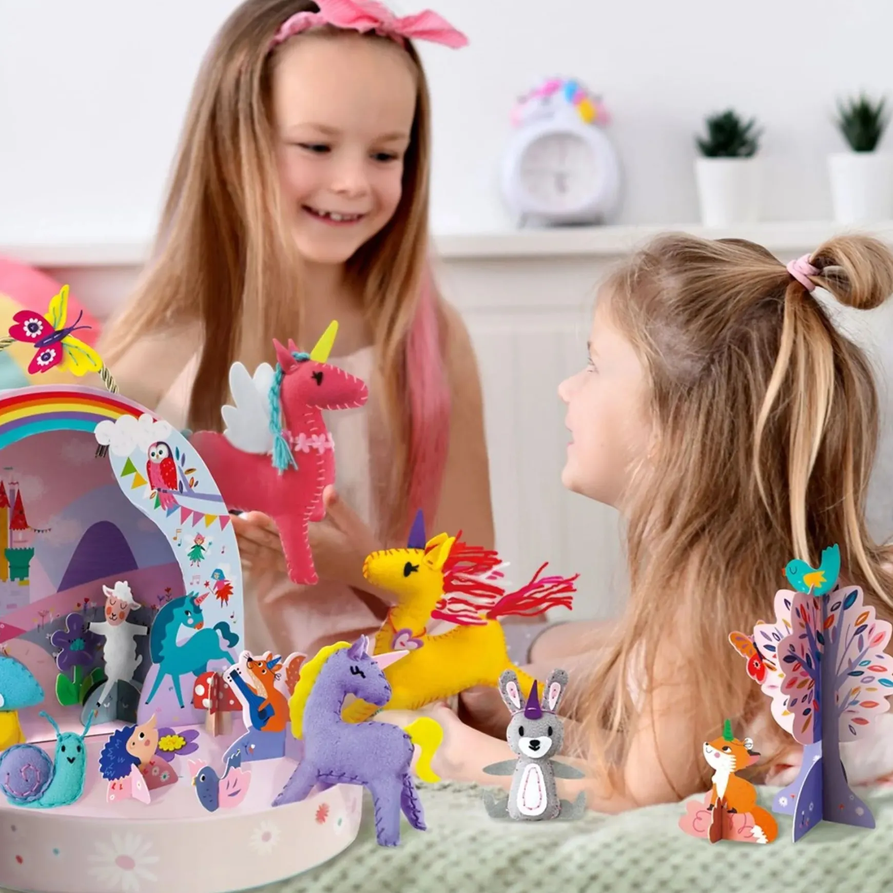 Combine sewing activities with fabric materials and quality cardboard to create 3 standing unicorns and 17 other standing animals and decoration such as flowers and trees.