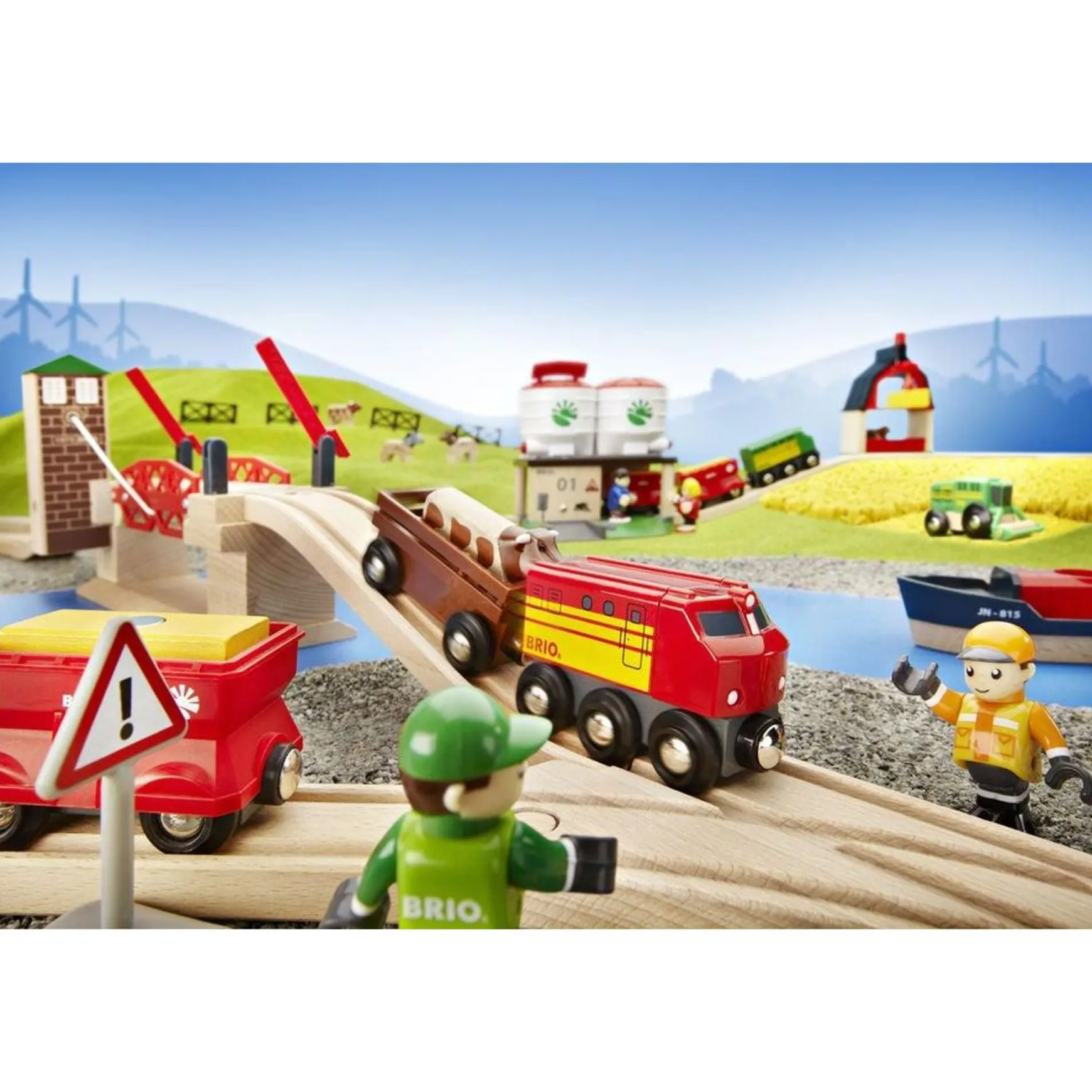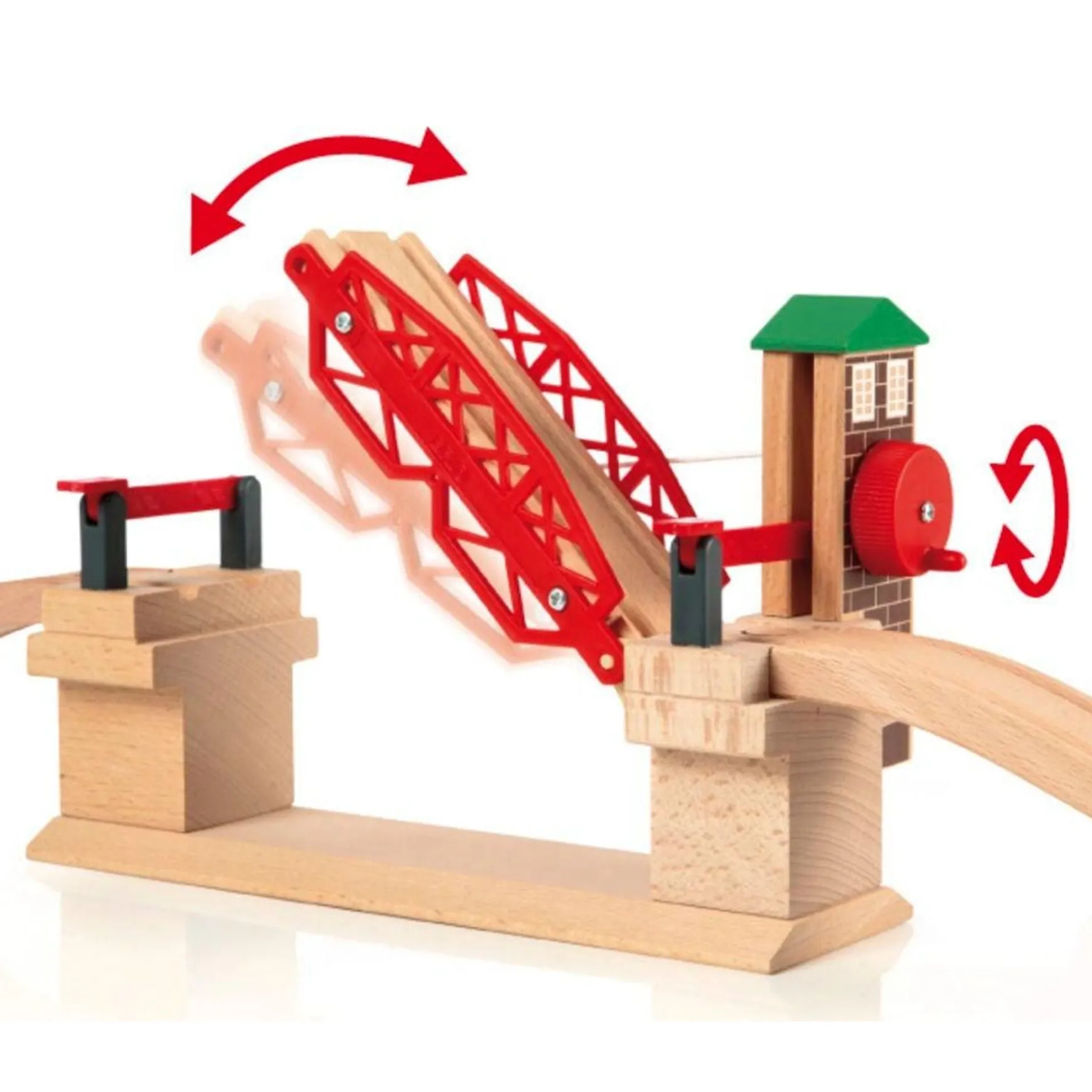 Just turn the crank to lift the bridge and manually lower the stop barriers. Includes 2 ascending tracks for easy connection to the Railway system.