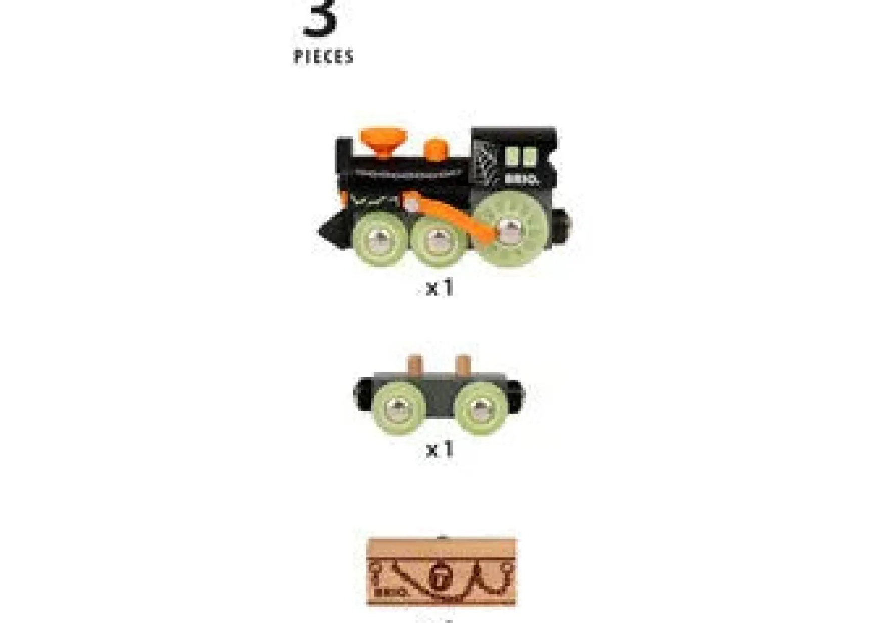 oooOOoooo. Something spooky is creeping along the train tracks. Is that a train or something more sinister? It’s the 33986 Ghost Train!Something spooky rides the rails: This ghostly steam train comes with glow in the dark wheels and details that come to life when it gets dark. Eerily following behind is a wooden casket load – but what could be inside?Part of BRIO World: Featuring iconic BRIO magnetic connections, this toy train is ready to connect to other vehicles and wagons and haunt the BRIO World. The play details of this train help children’s development by promoting logical thinking and improving fine motor skills.33986 Ghost Train includes 3 pieces: 1x Glow in the dark Ghost Engine, 1x Wagon, 1x Wooden Chest Load.