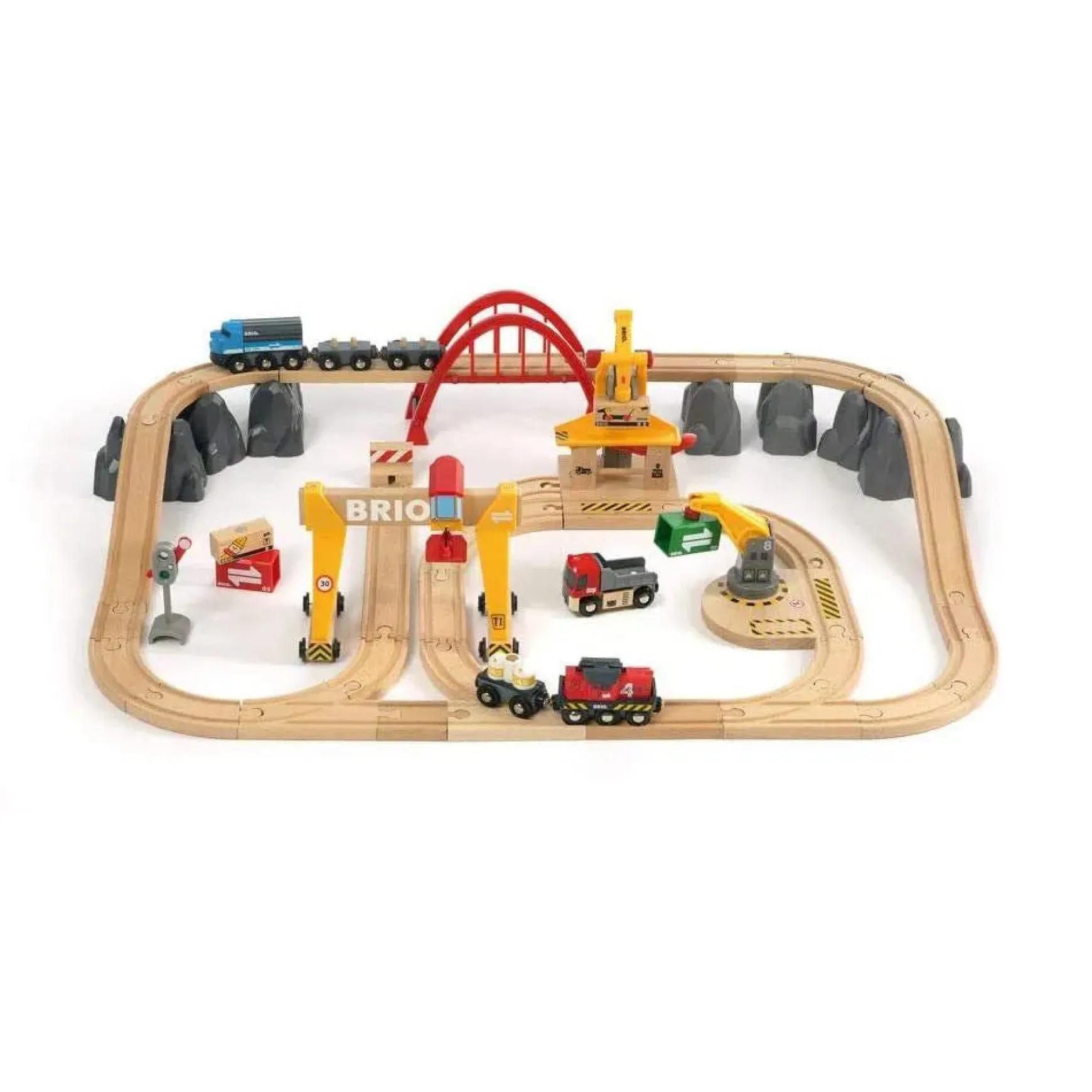 The 54-piece Cargo Railway Deluxe Set is an action-packed toy train set filled with mechanical functions and cargo-themed play.