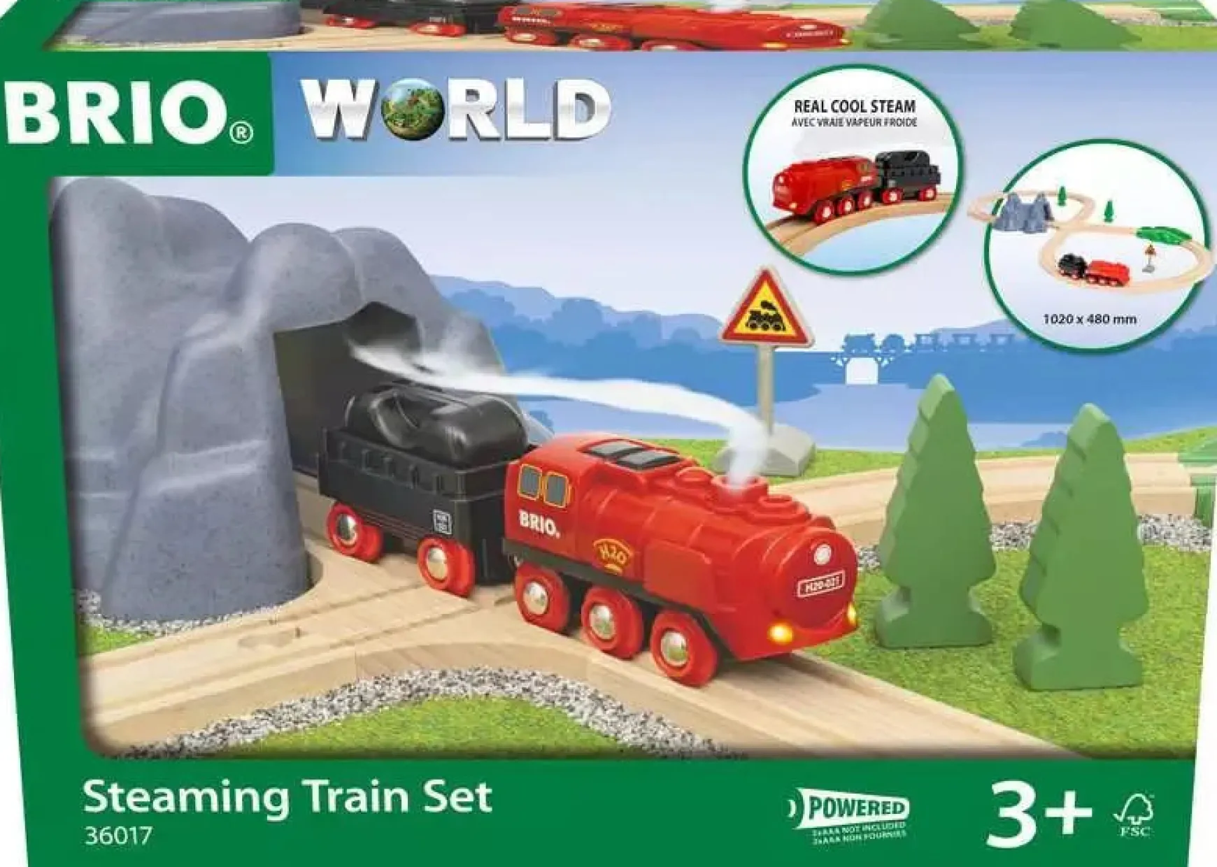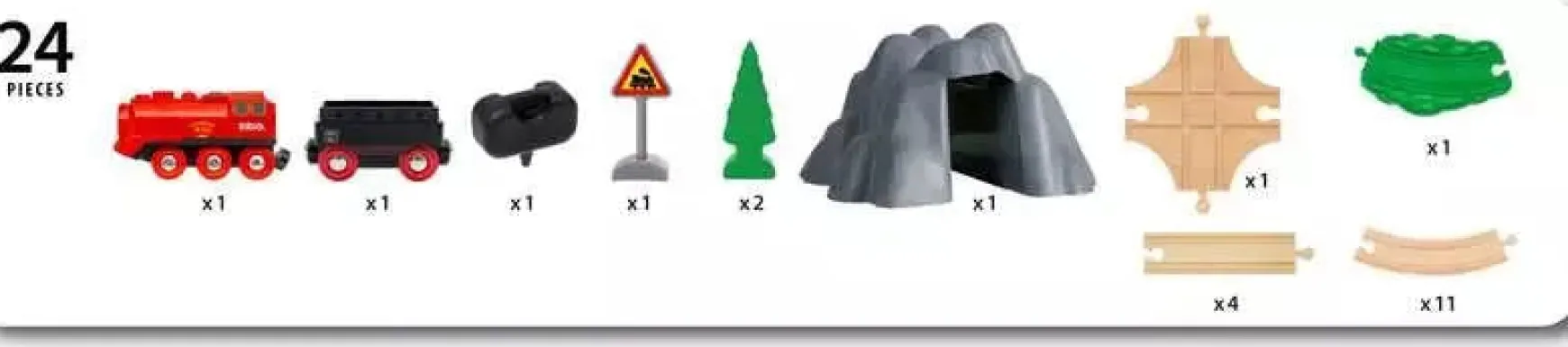 36017 Steaming Train Set includes 24 pieces; 1x Battery-Operated Steaming Train, 1x Cargo Wagon with Refill Load, 1x Mountain Tunnel, 1x Mountain Track, 2x Wooden Trees, 1x Railway Sign, 15x Wooden Train Tracks, 1x Wooden Railway crossing.