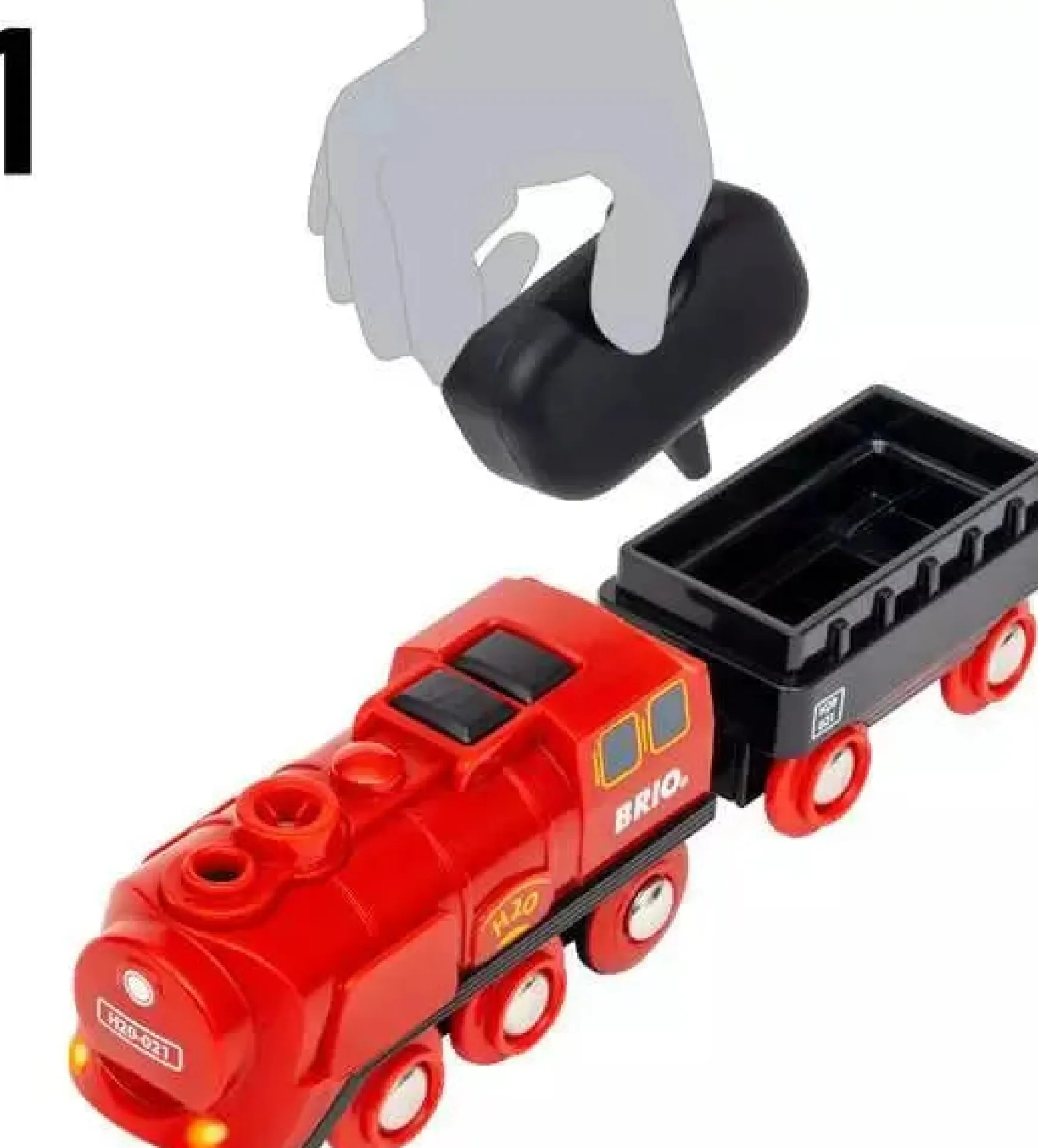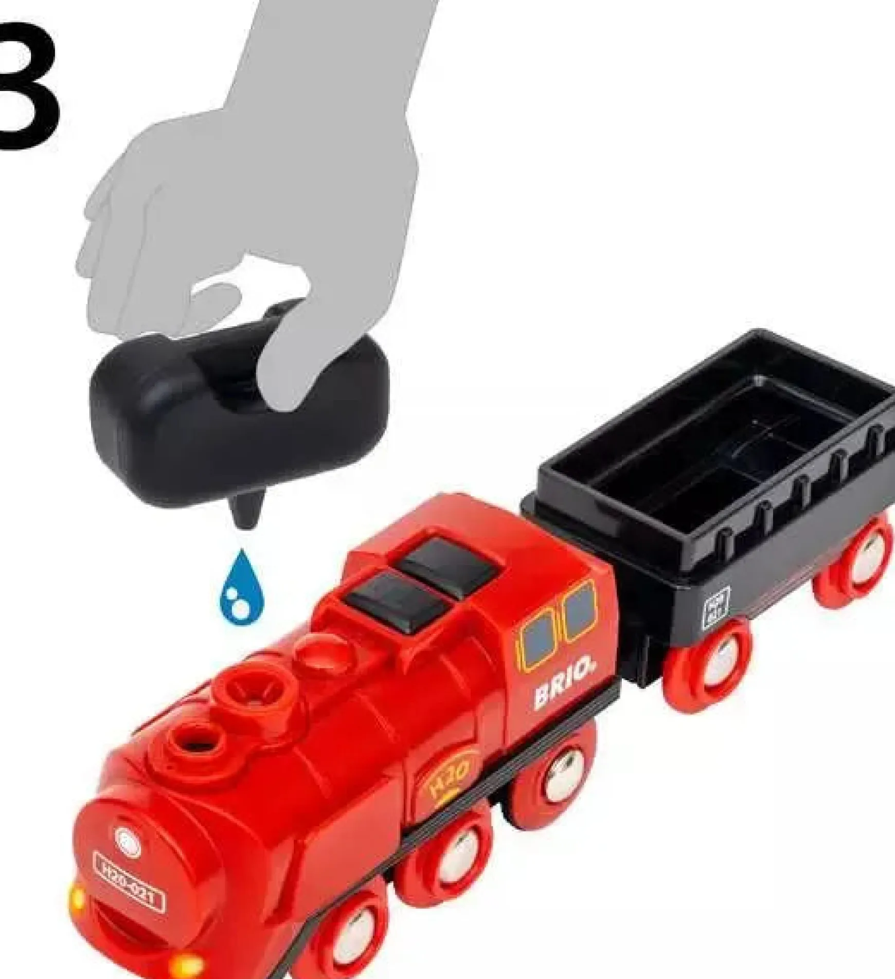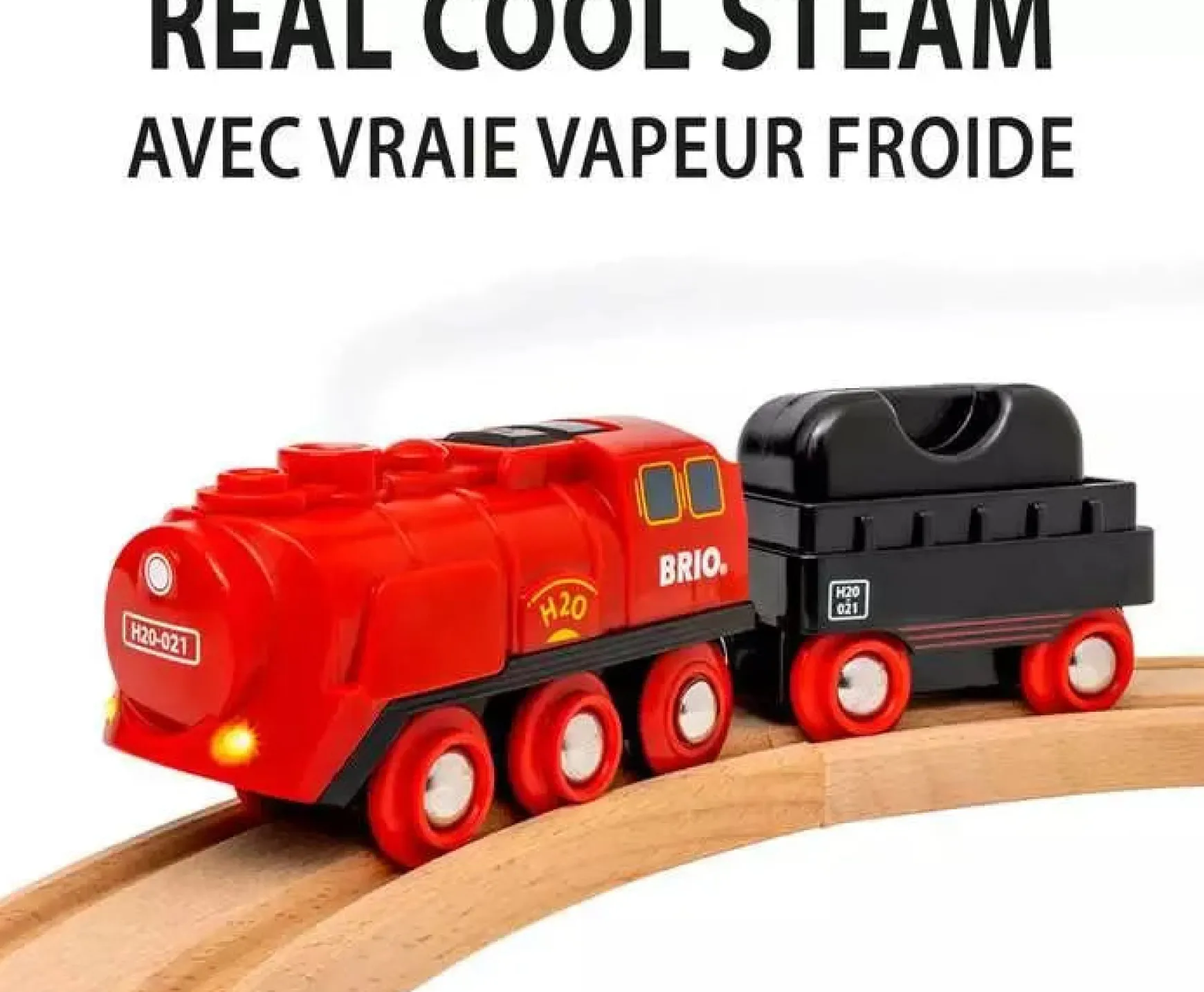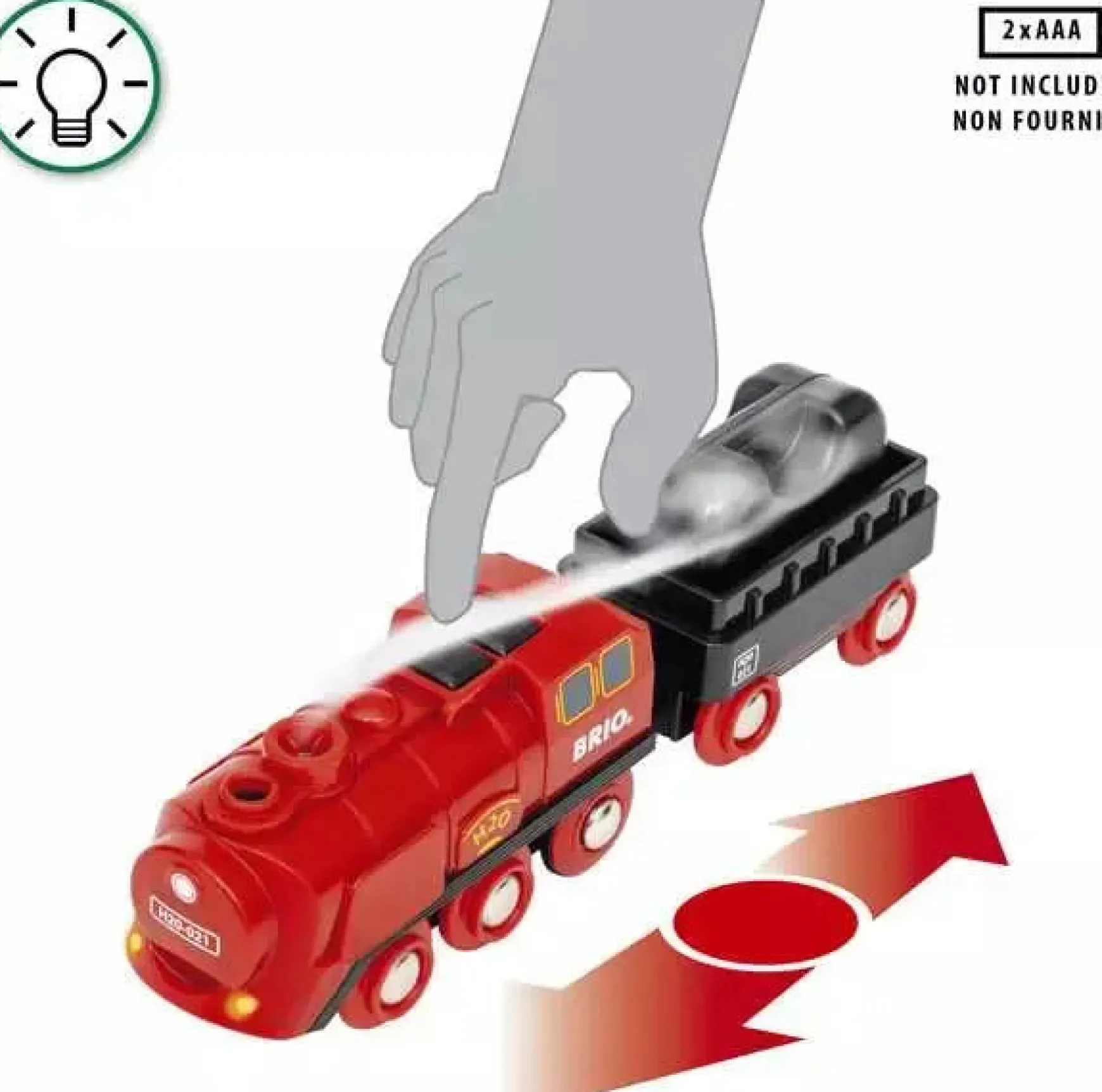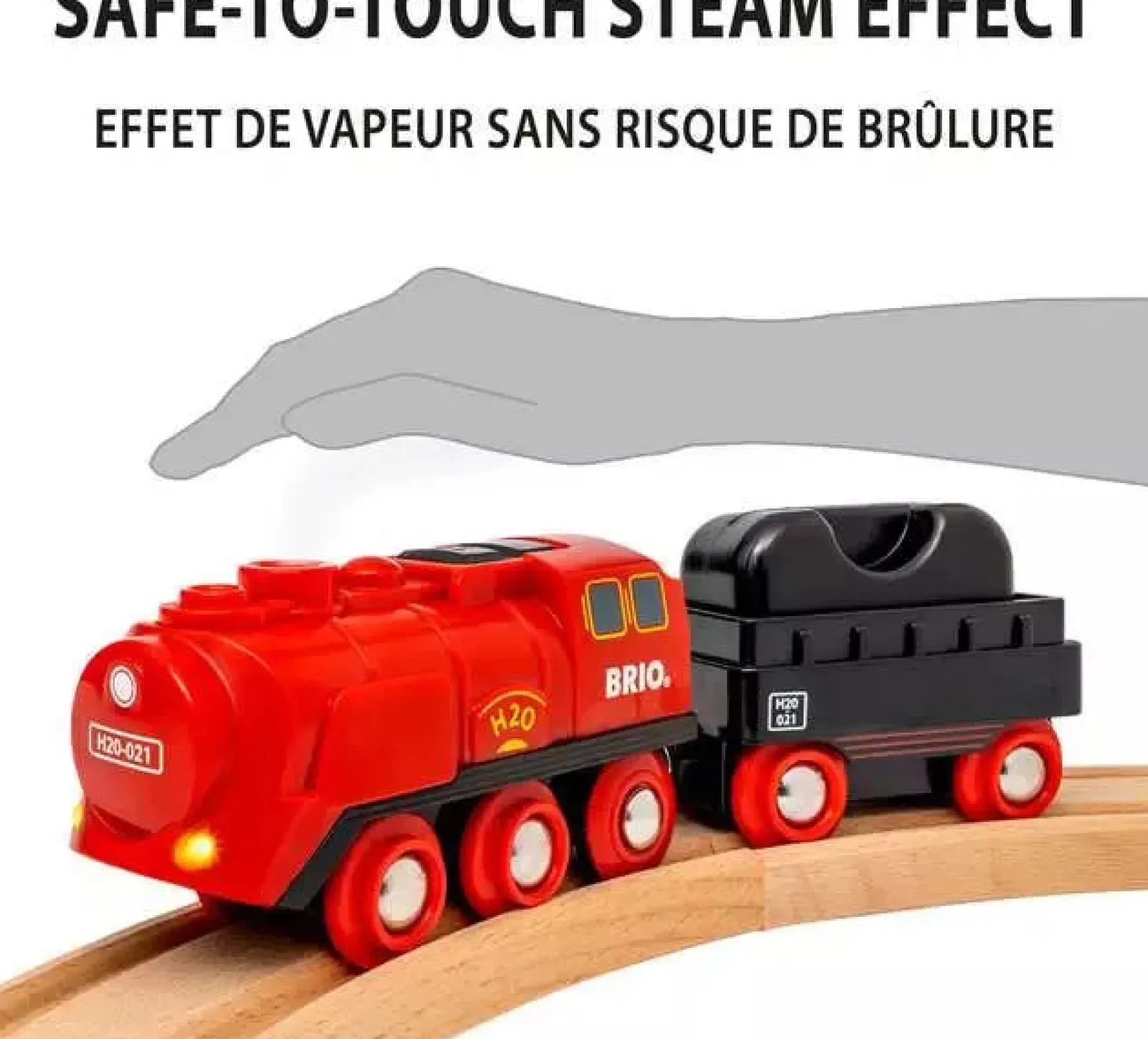 Chug around this classic figure 8 train set with realistic steam effects in the 36017 Steaming Train Set. The red battery-powered engine produces safe-to-touch steam as it drives around the tracks. Once you’re out of water, simply refill the engine using the refill load that’s pulled behind the train. Press the red forward button on the top of the engine, the front lights turn on as the steam starts to rise and you’re off again on more classic wooden railway adventures.