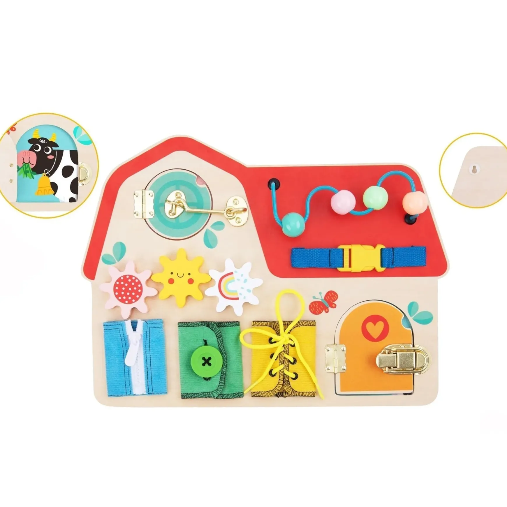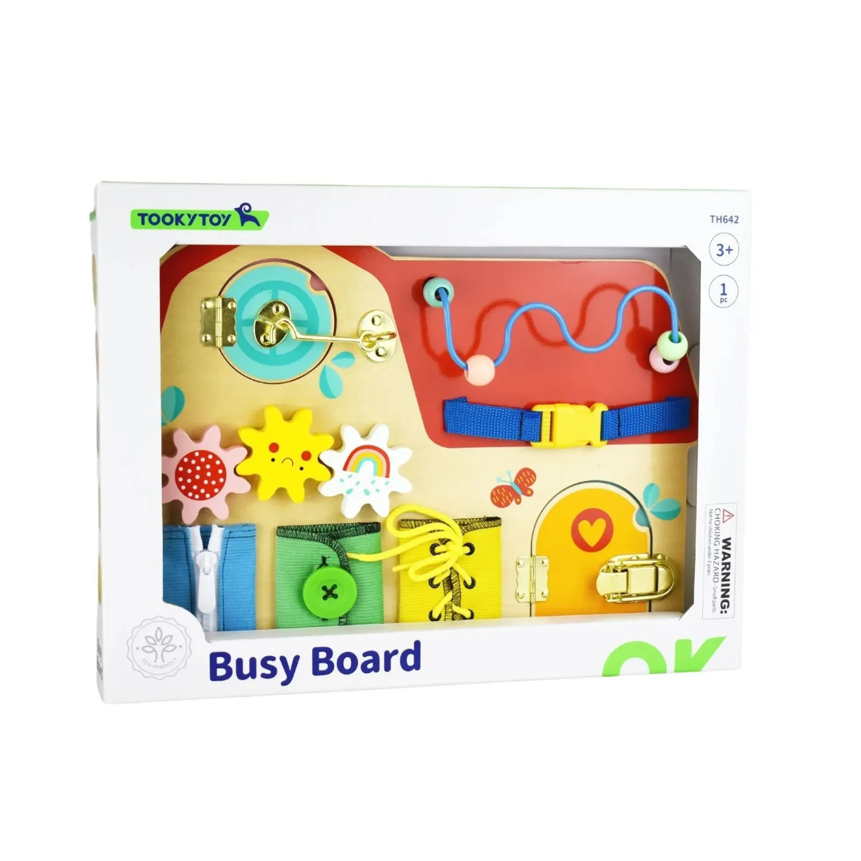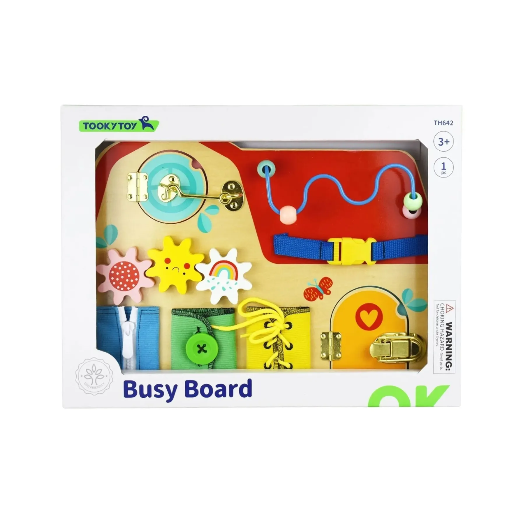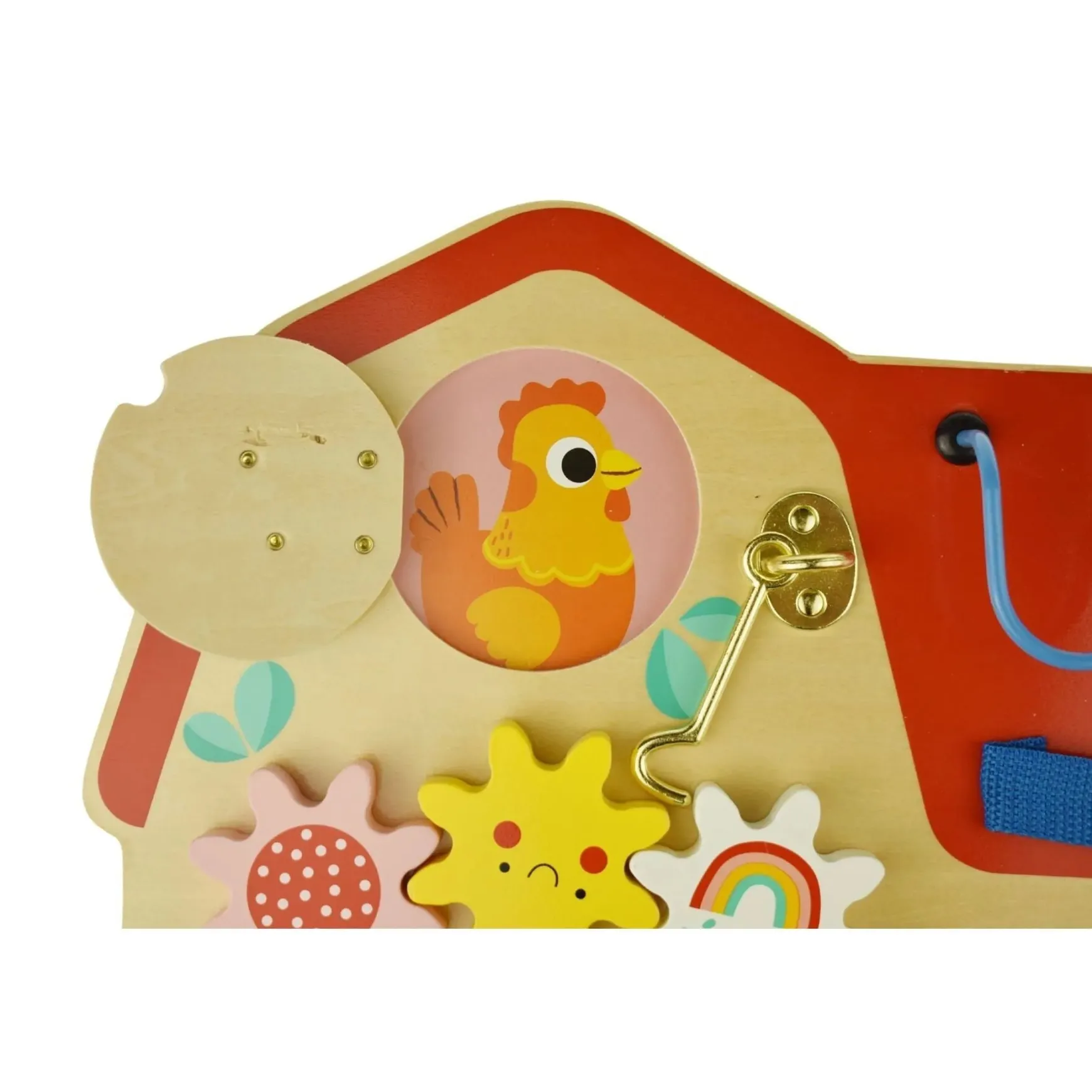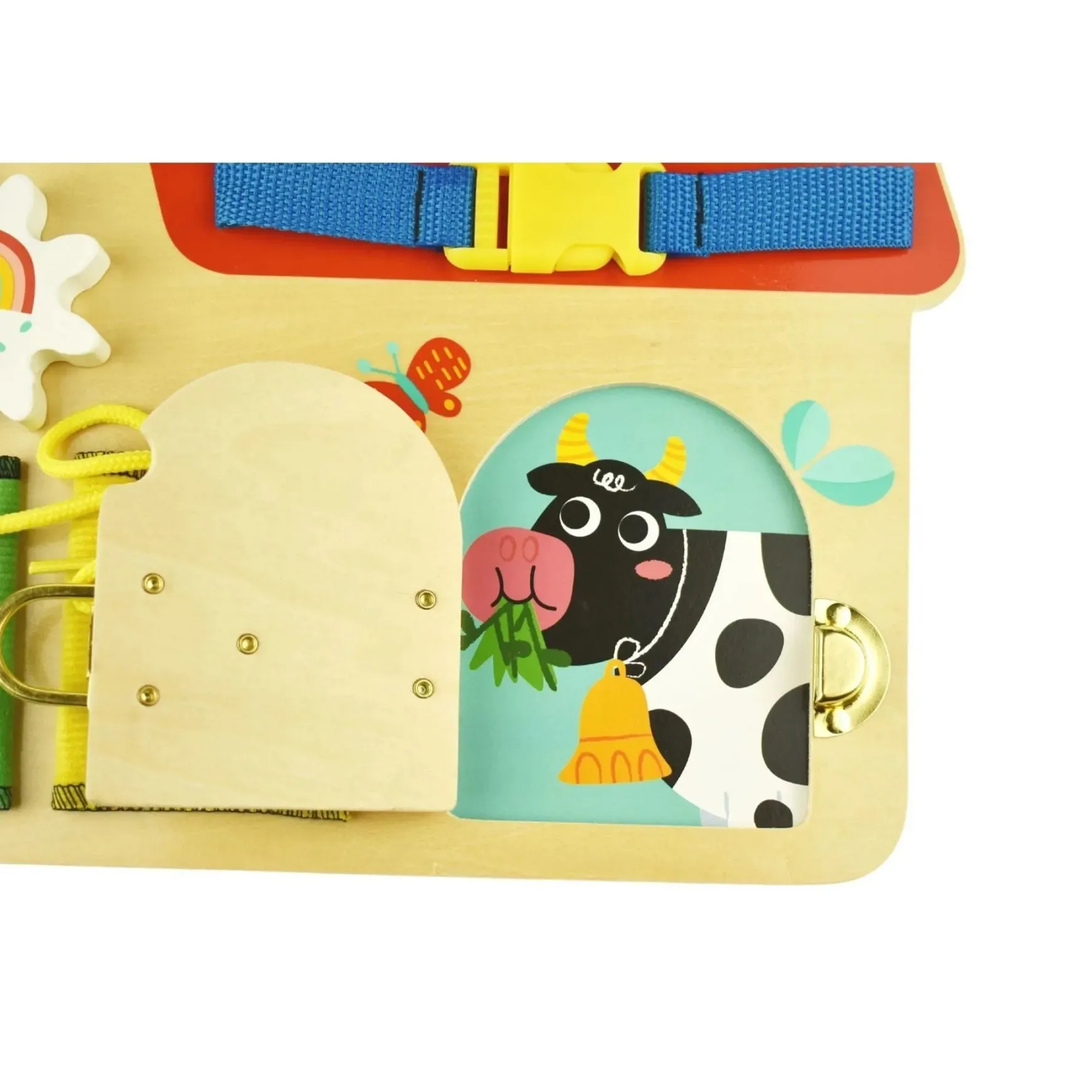 This busy board has everything a young child will love to explore and discover as they undo latches and laces to open doors and hatches to discover what sits inside the barn with this educational, play based learning activity board. Children will learn problem solving skills, develop fine motor skills and patience as the are challenged with this cute wooden board. The wooden Busy Board from Tooky Toys is made from timber and finished to the highest quality. This toy is painted in child safe, non toxic paint.