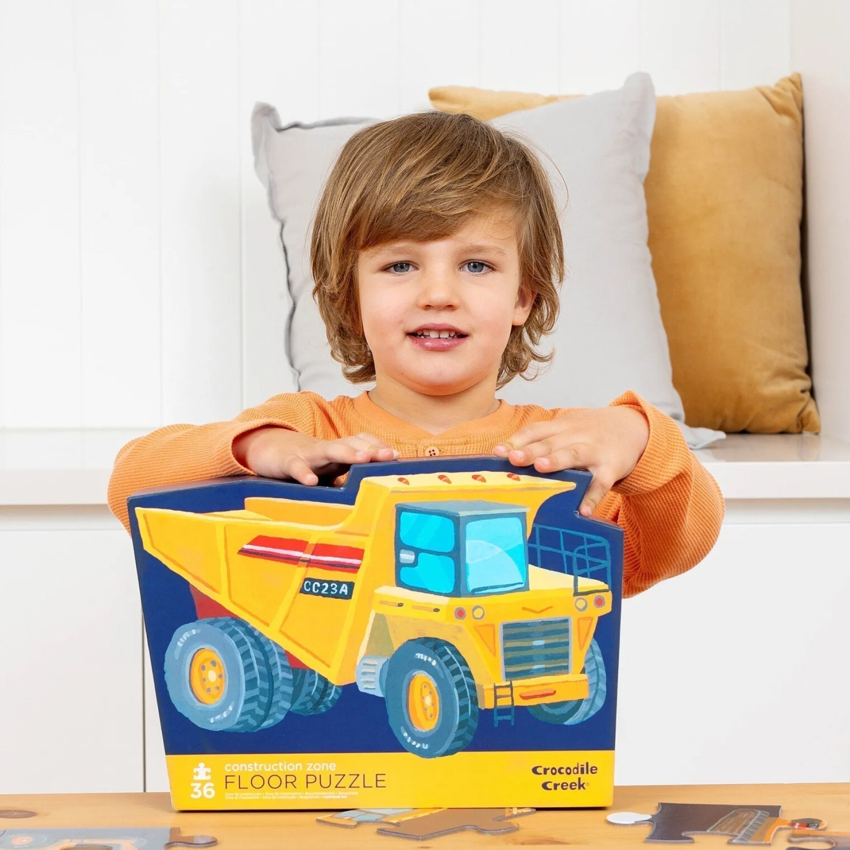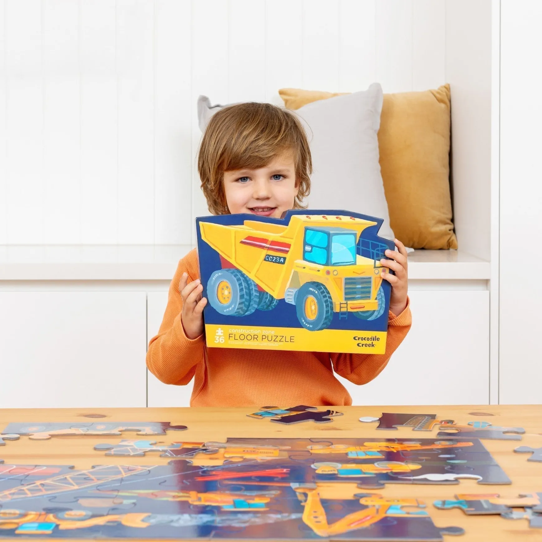 The littlest aspiring builders will love piecing together the trucks, diggers and cranes in this construction themed 36-piece floor puzzle. All wrapped up in its unique contour-shaped storage box, the jumbo, sturdy pieces of this high-quality puzzle are ideal for little hands.