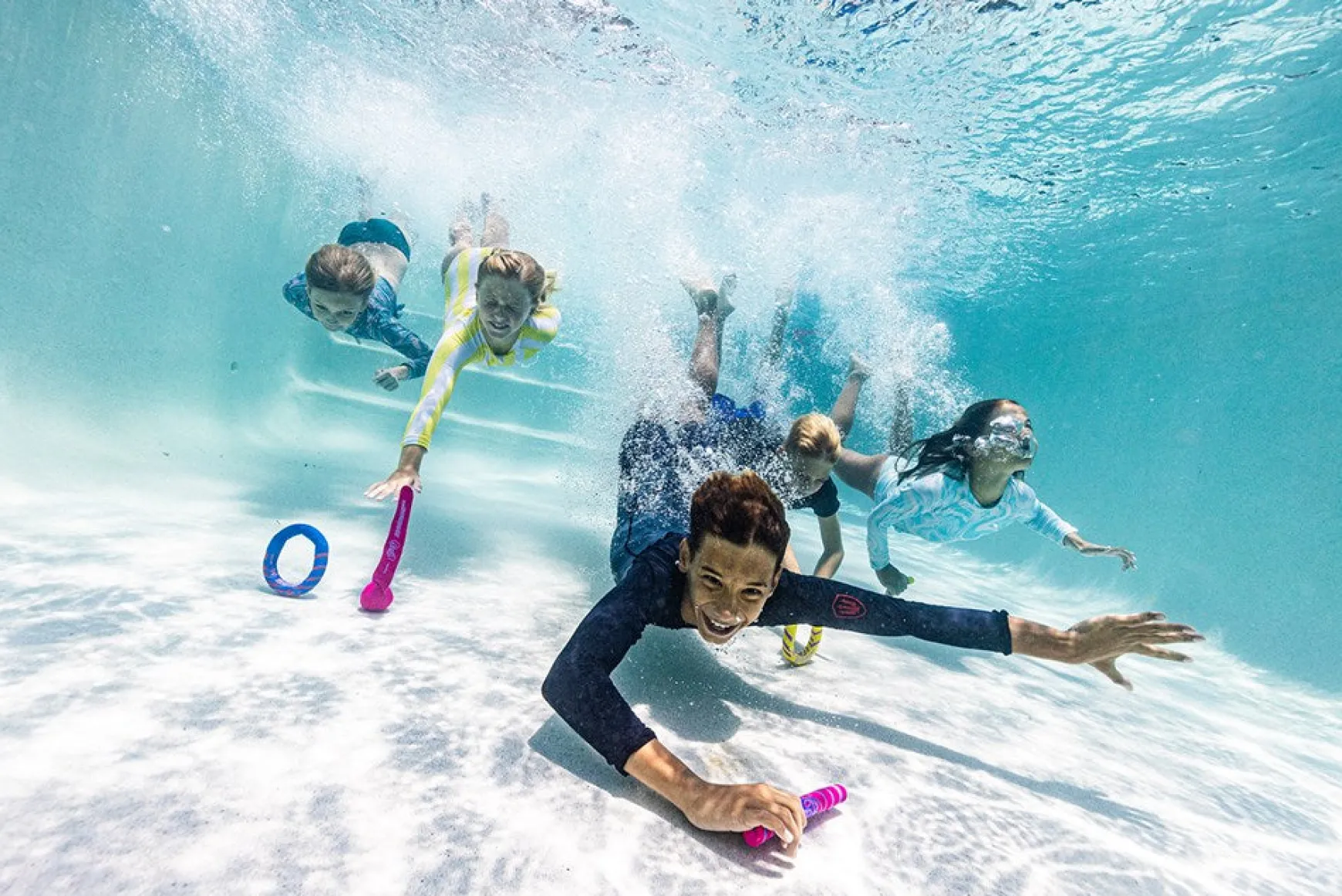 - A variety of colorful, sinkable dive toys for interactive play