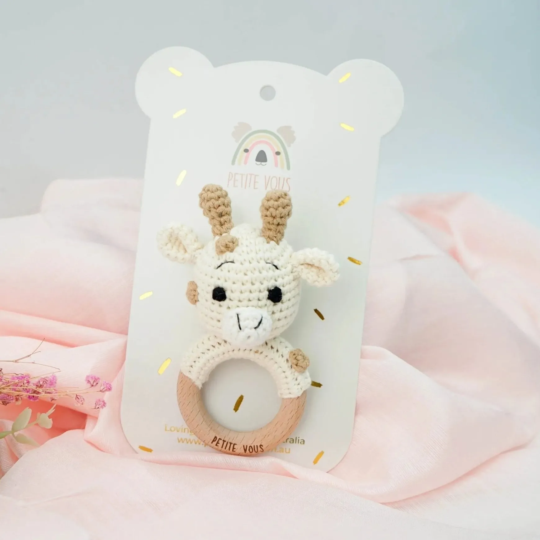 Introducing our beautiful crochet ring rattle in the cute Percy Giraffe design. Each toy is lovingly handmade with 100% cotton yarn and attached to a baby safe, beechwood teething ring. Features are embroidered making them safe for baby. Presented on our luxe backing card, this is the perfect gift for baby showers, newborns or hampers. Suitable from 0+ years. Polyester filling. Measures approx 6cm W x 10cm H