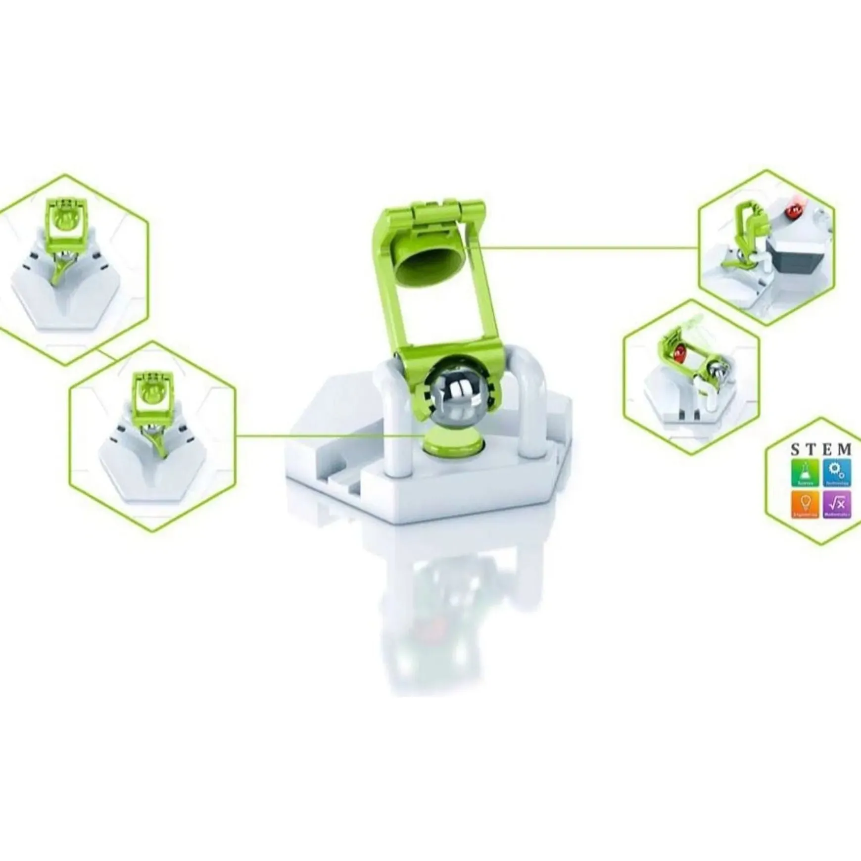 Dip down between levels! The Dipper will take your marble, pick it up, move down a level and drop it. Use this extension for a dynamic way to change between the levels in your tracks. You can control what side the ball will leave the Dipper allowing you to continue building in the right direction. Combined with the GraviTrax Starter Set, the Dipper will guarantee fast-paced fun and action-packed tracks!