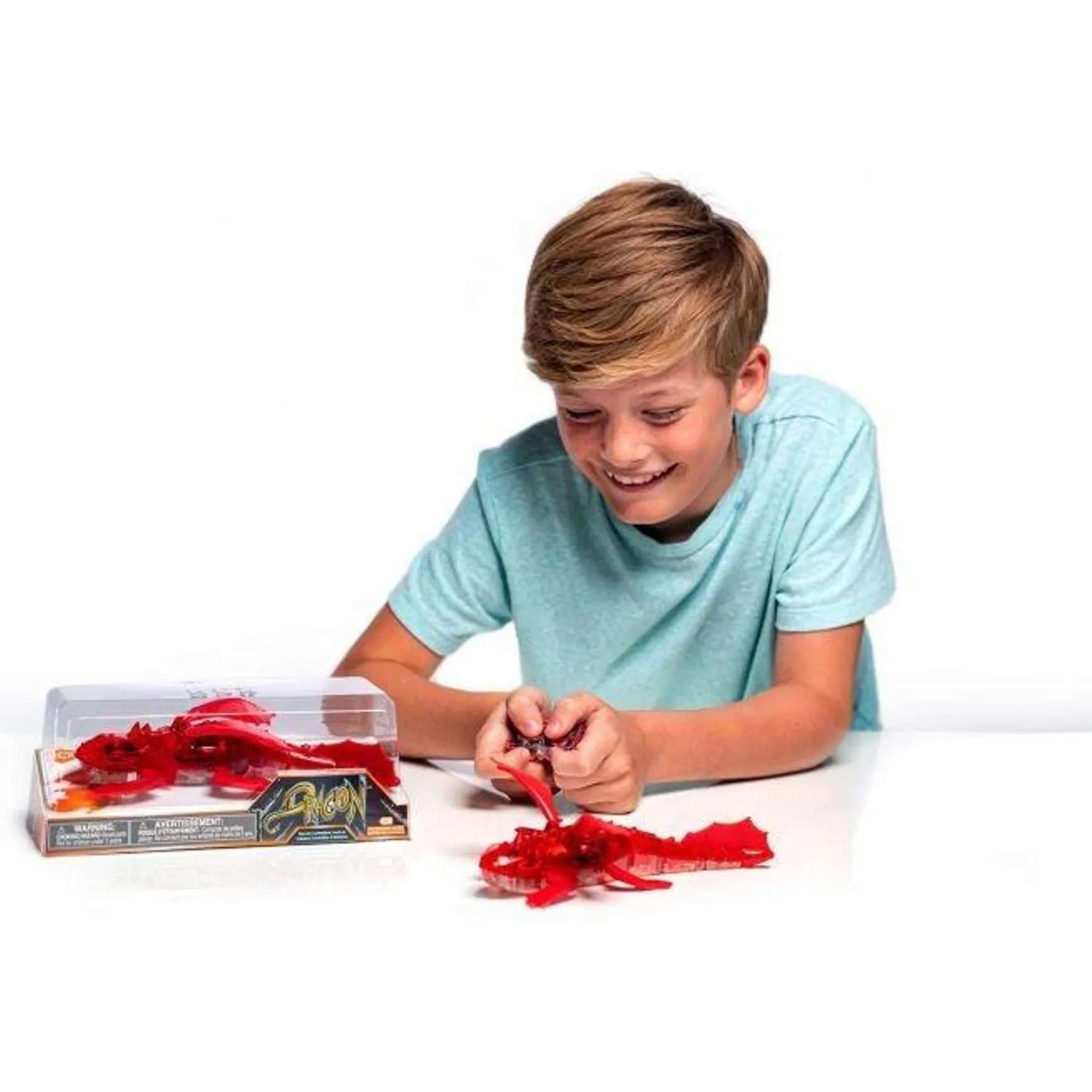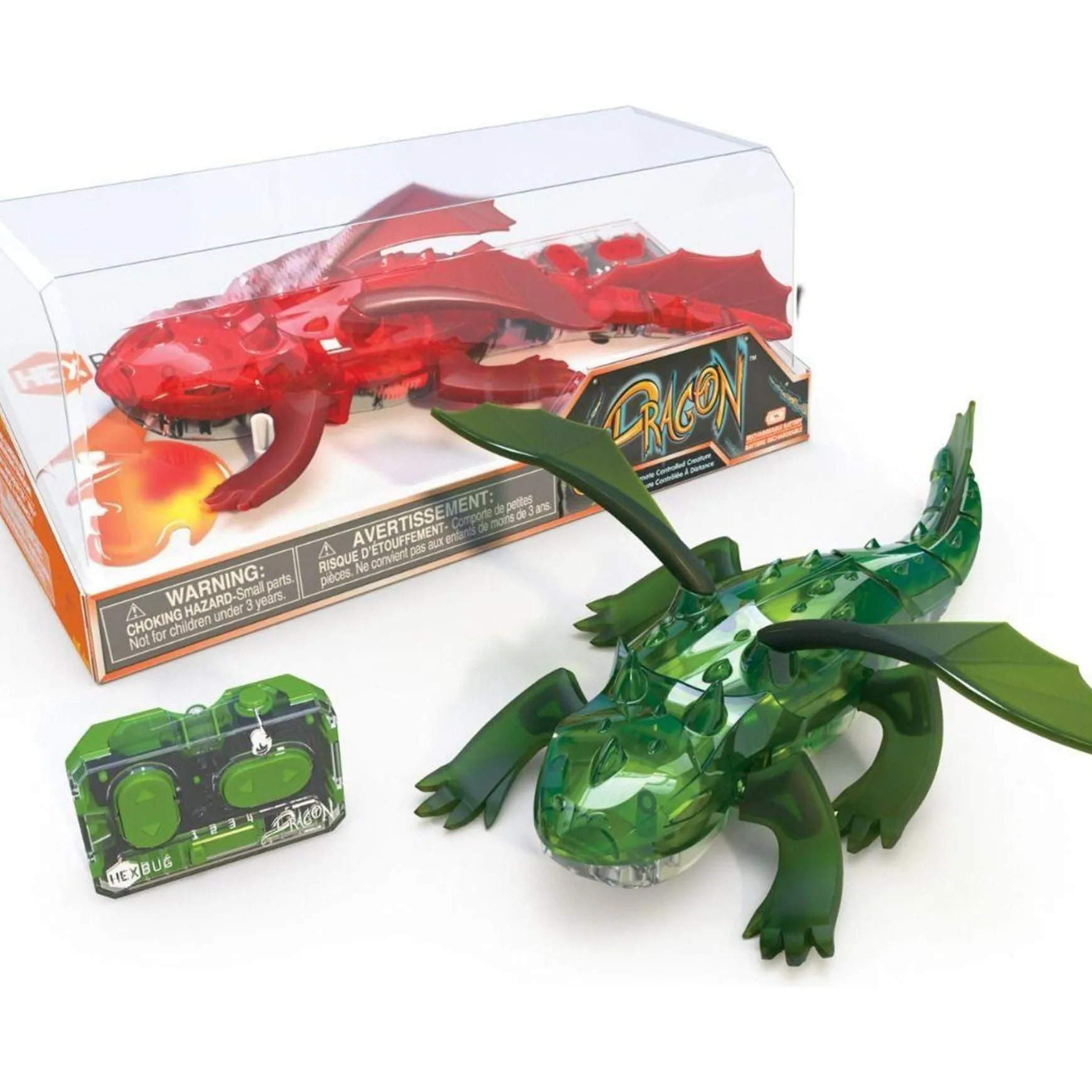 The HEXBUG Dragon has risen from the fires of myth and legend! Watch as it slithers across any surface breathing LED lit fires and roaring ferociously at all who dare to come close. Using a powerful remote control, you decide the Dragon’s every move! With rubber rotating paws for traction, fearsome adjustable wings and a flexible tail moving from side to side, your friends just might think this robotic creature is alive!