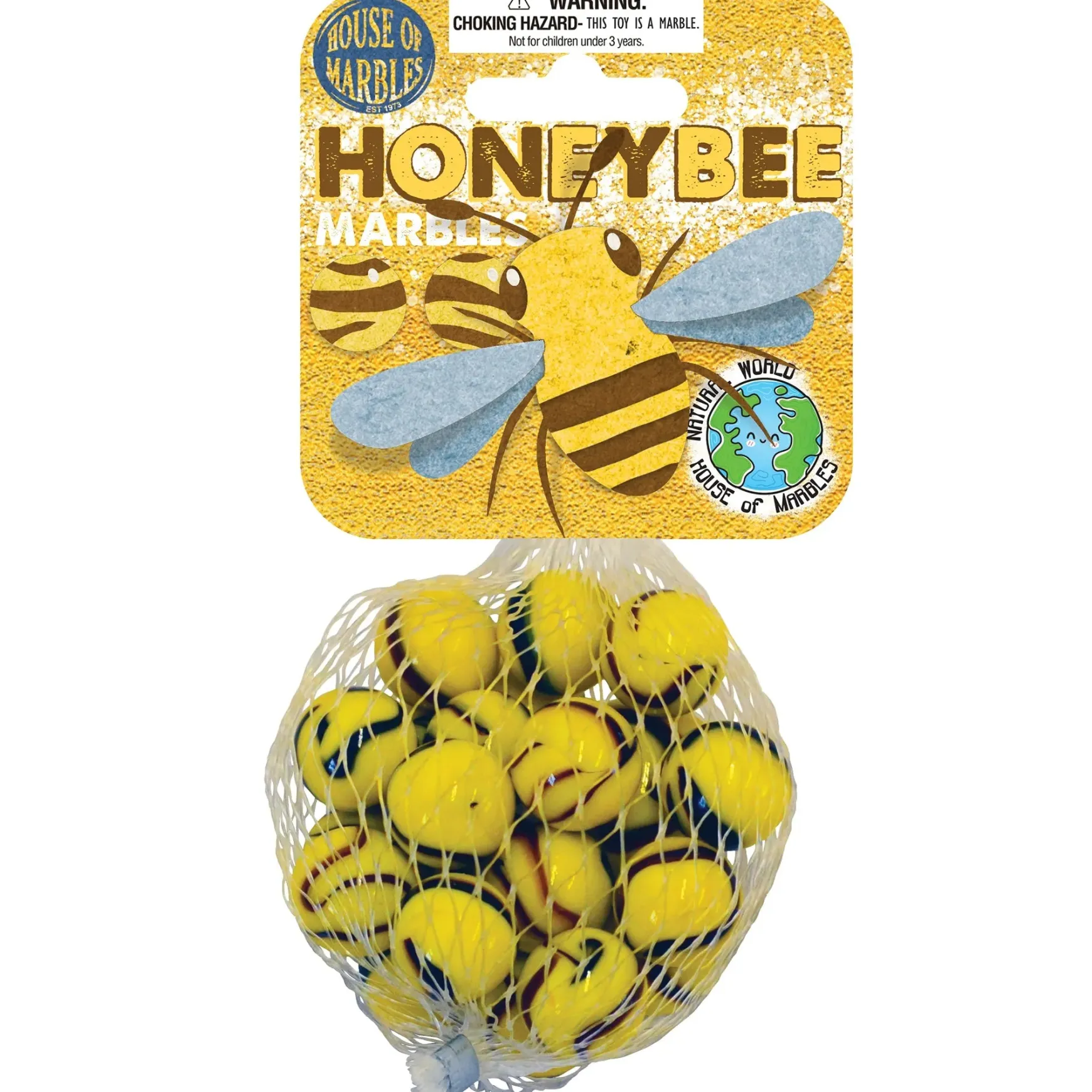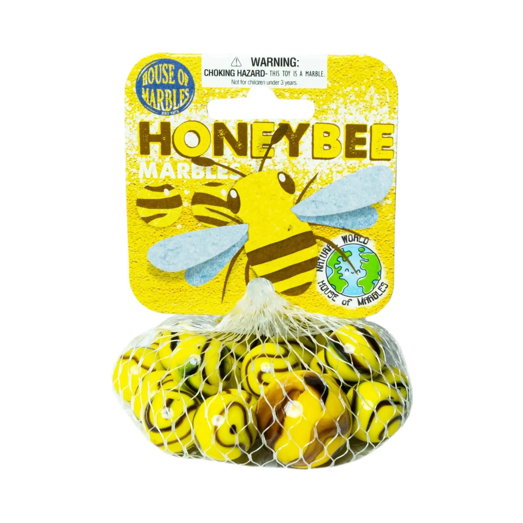 A bag of fun, yellow ‘bee’ marbles that kids will love to play with. Each bag contains a shooter-sized marble plus lots of little ones for collecting, swapping and playing.