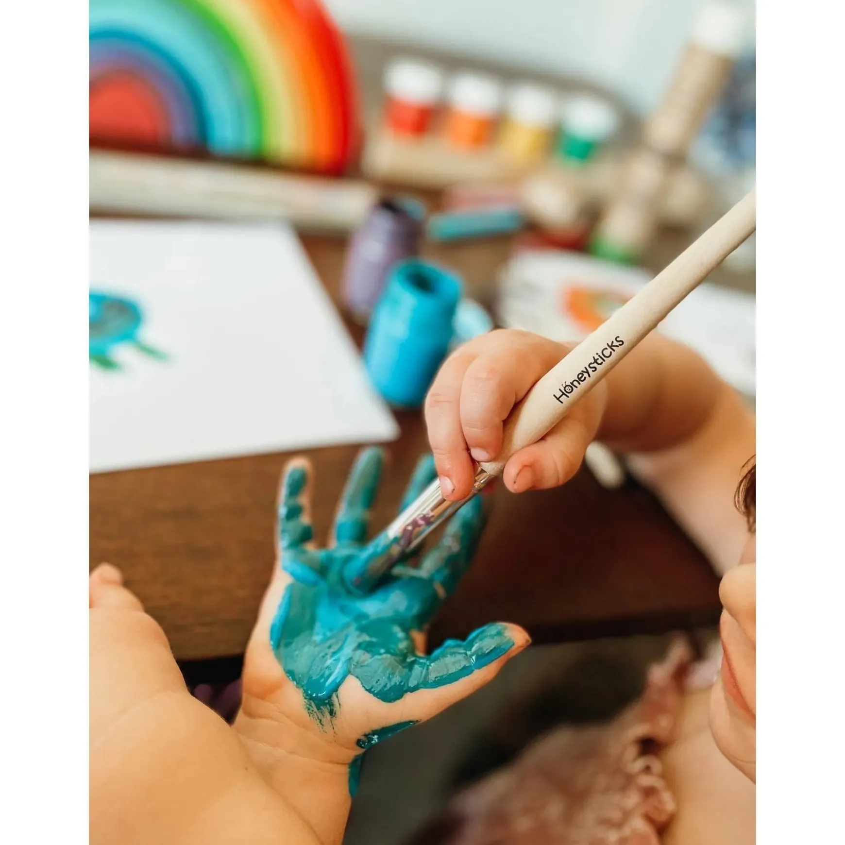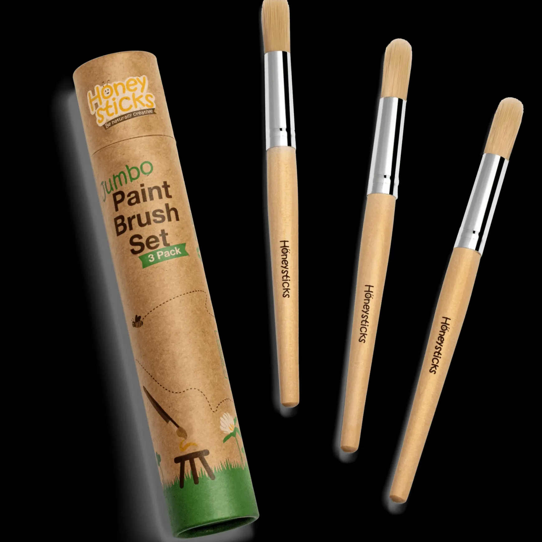Honeysticks Jumbo Paint Brush set comes with 3 Jumbo Paintbrushes with long thick natural wooden handles that are easy for little hands to hold and use.