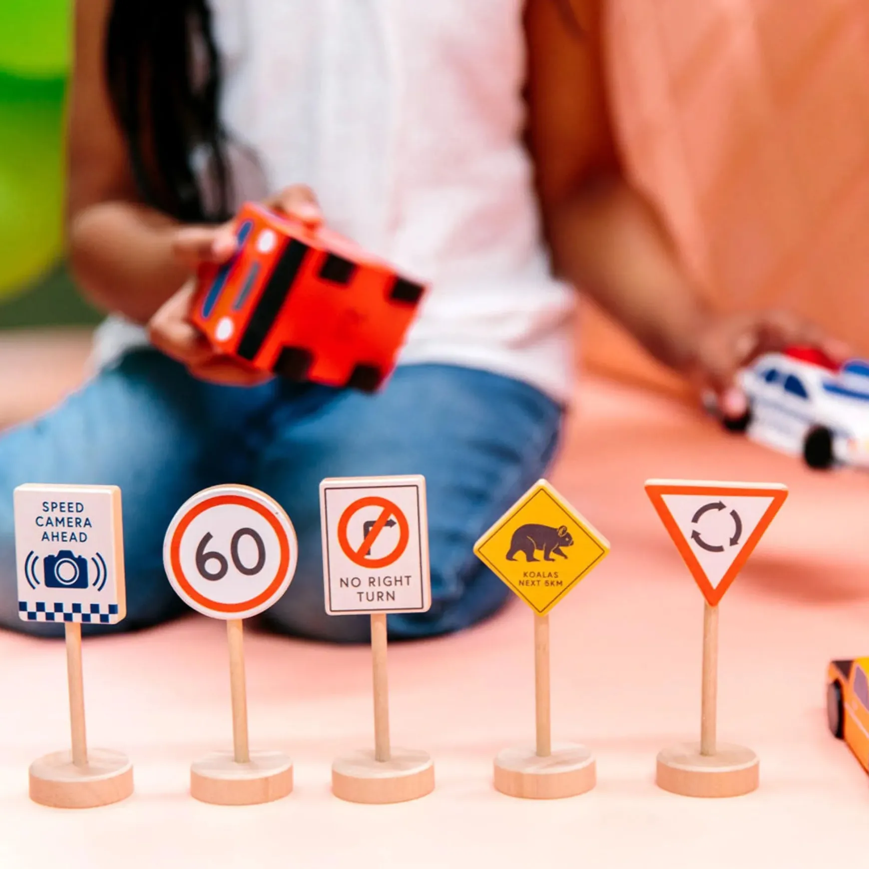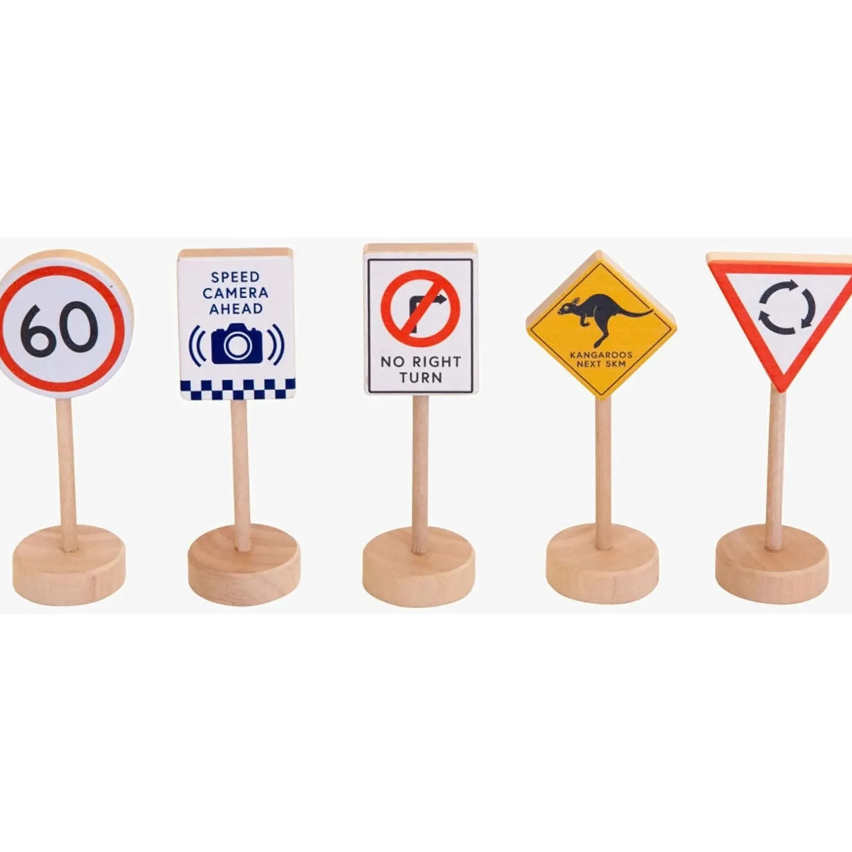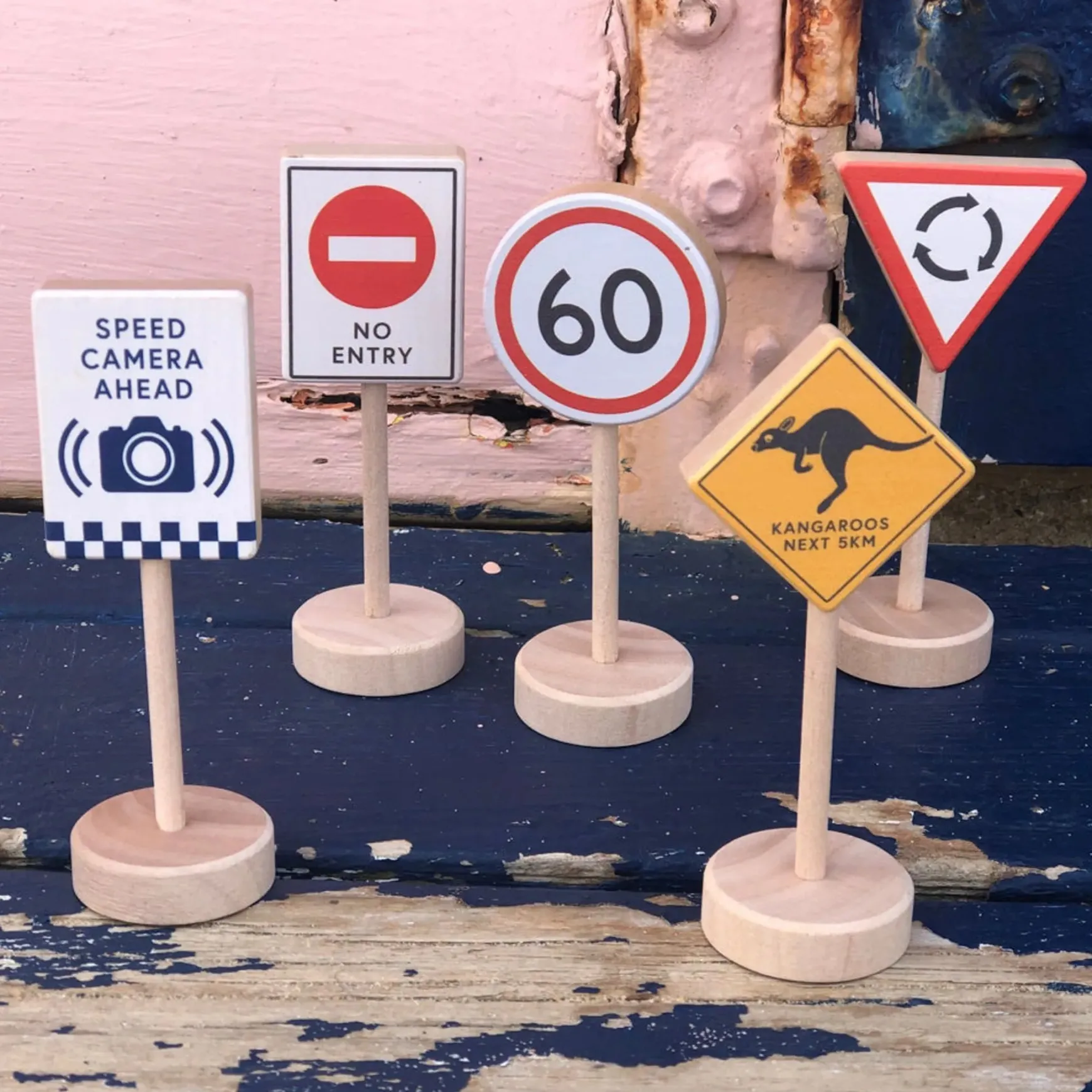 Make playing cars a bit more fair-dinkum Aussie and just a little bit more fun with these classic wooden traffic signs. The set includes 5 Australian street signs with a different design on the back to suit your mood. Get to know our speed limits, kangaroo u0026amp; koala crossings, warnings and speed camera’s on a play level without the police fines. Easy to add to any road or city playset or even a comfy play mat. Each sign is approximately 10cm high.