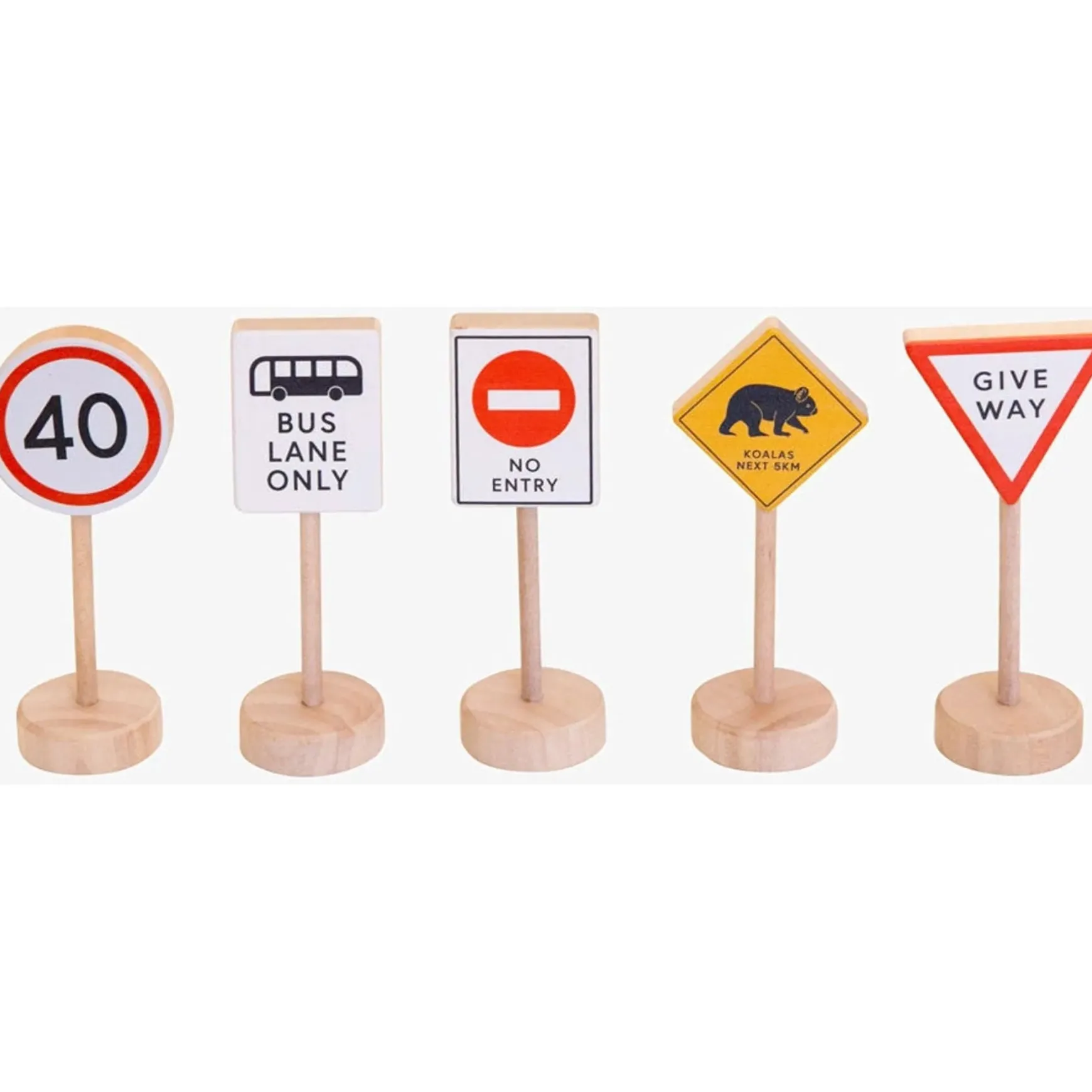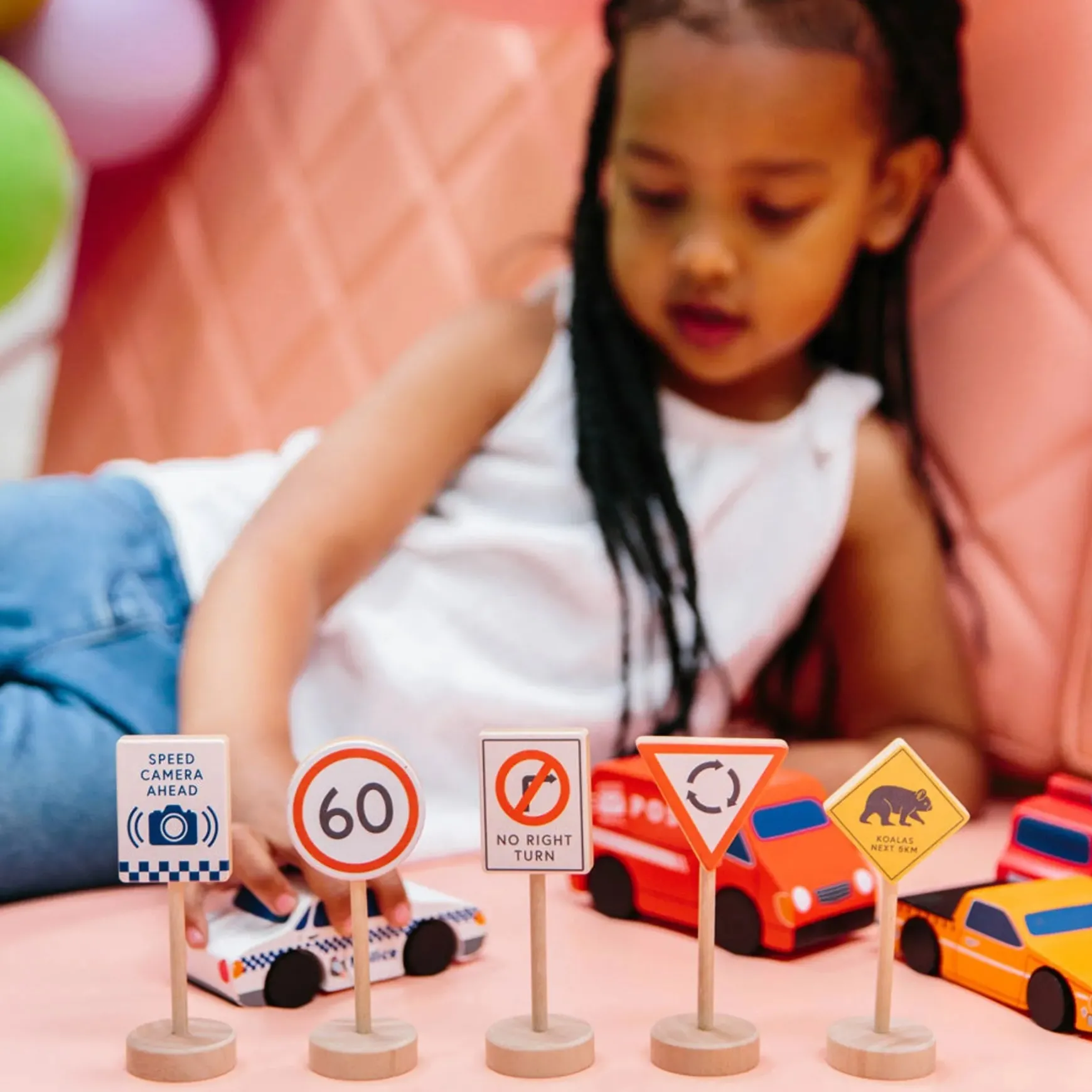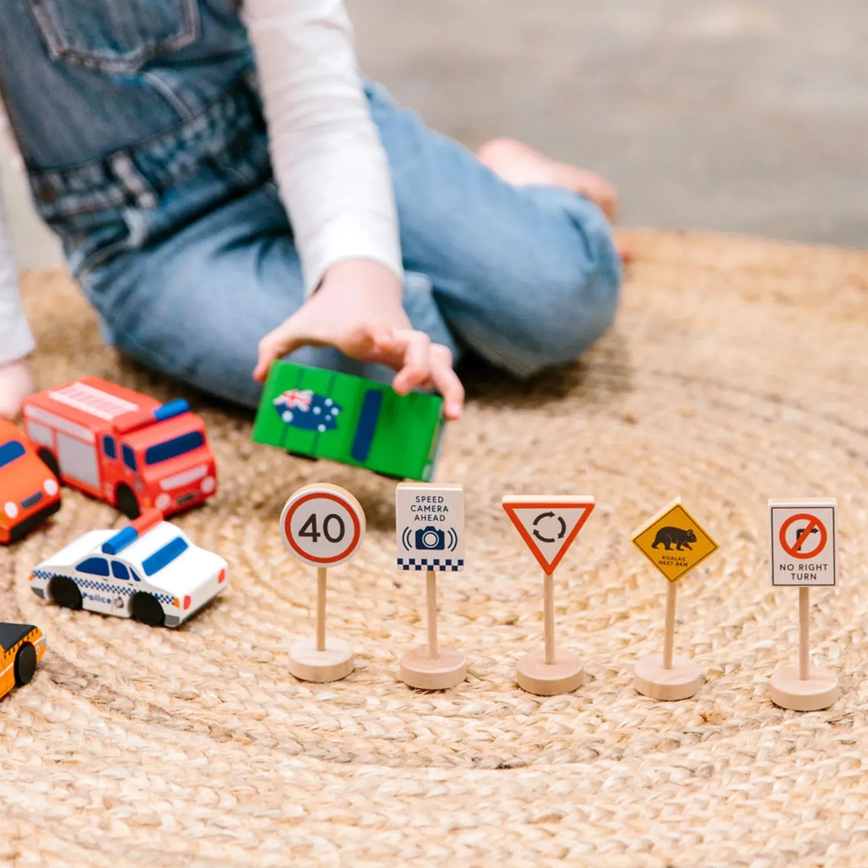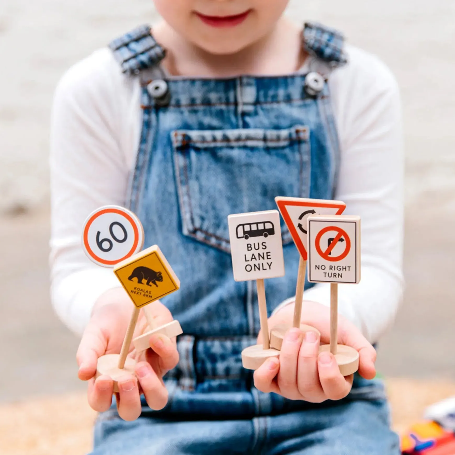 Make playing cars a bit more fair-dinkum Aussie and just a little bit more fun with these classic wooden traffic signs. The set includes 5 Australian street signs with a different design on the back to suit your mood. Get to know our speed limits, kangaroo u0026amp; koala crossings, warnings and speed camera’s on a play level without the police fines. Easy to add to any road or city playset or even a comfy play mat. Each sign is approximately 10cm high.