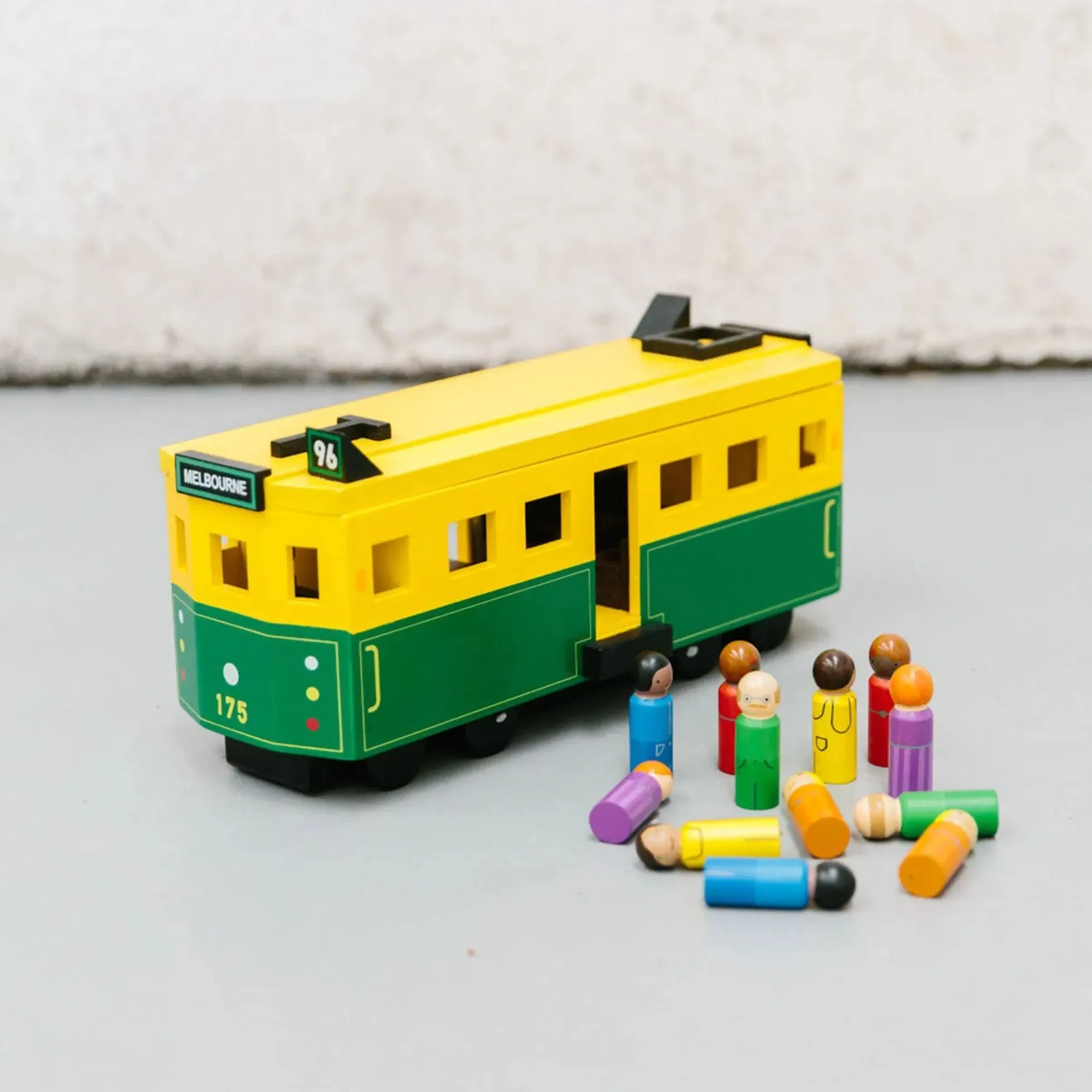 This iconic wooden tram is painted with authentic colours and based on the iconic W-class Melbourne tram. This wonderful creation comes complete with 12 wooden passengers and 2 uniformed tram conductors that have their own cabins on each end of the tram. It has wheels on the bottom (for pushing and zoom zooming) and the lid comes off the top for little hands to access the wooden passengers.