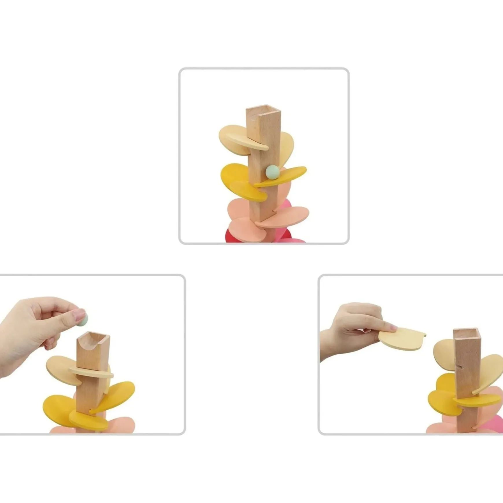 Beautiful wooden tree with delicately coloured leaves in muted pastel tones. Place a marble on the top leaf and release. As it cascades down, each leaf makes a different tone. Calming and mesmerising for children to watch the balls roll down and listen to the pleasant sound.