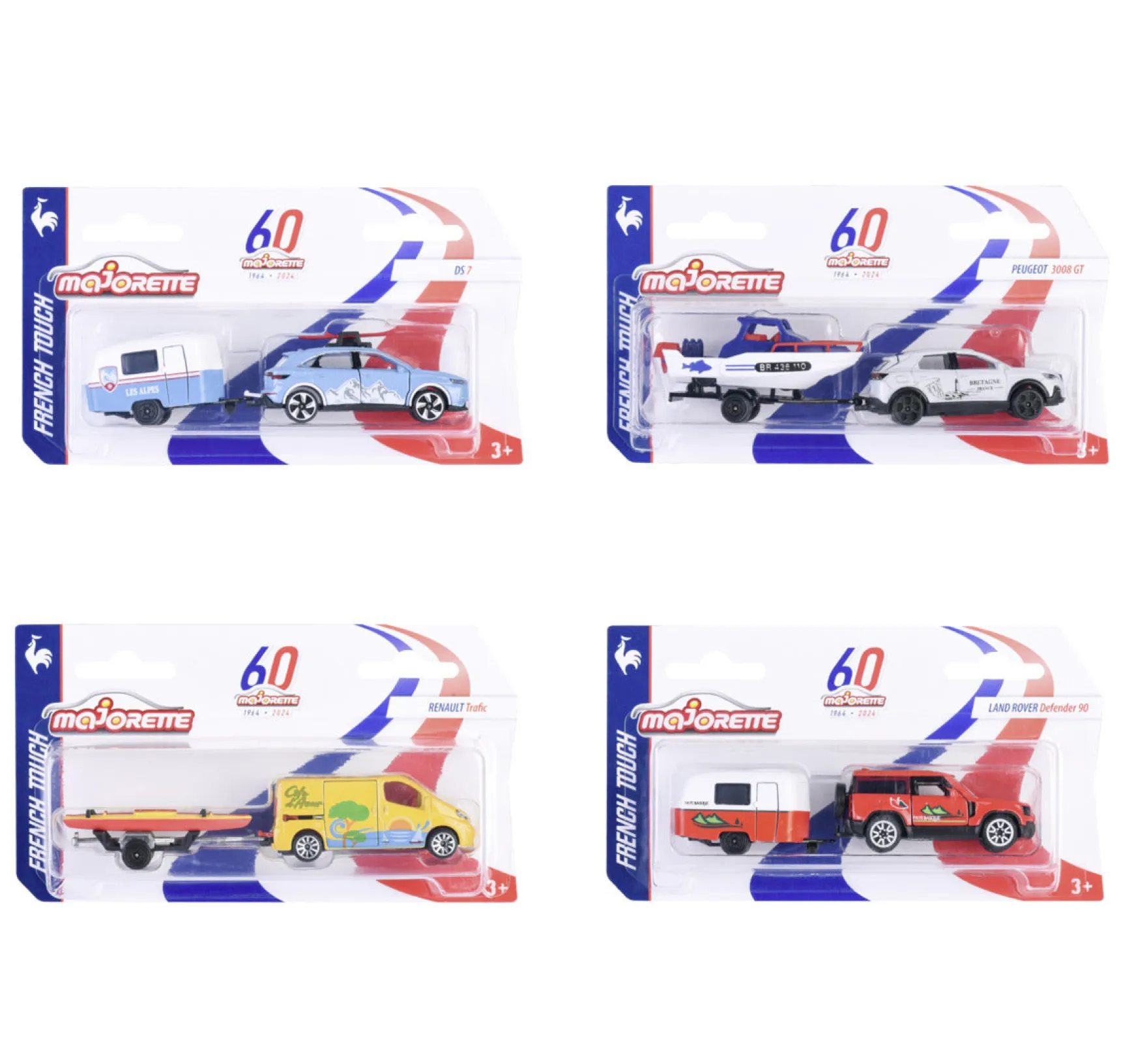 Celebrate Majorette’s 60th anniversary with the French Touch Trailer (Assorted), a special edition collection that brings the charm of French design to life on the road. Each trailer in this assortment is paired with a beautifully detailed die-cast vehicle, representing the pinnacle of French automotive craftsmanship. From the sleek lines of a Renault pulling a stylish caravan to the robust design of a Citroën paired with a vintage trailer, these models are a tribute to the brand’s six decades of excellence in creating high-quality, realistic toy vehicles.