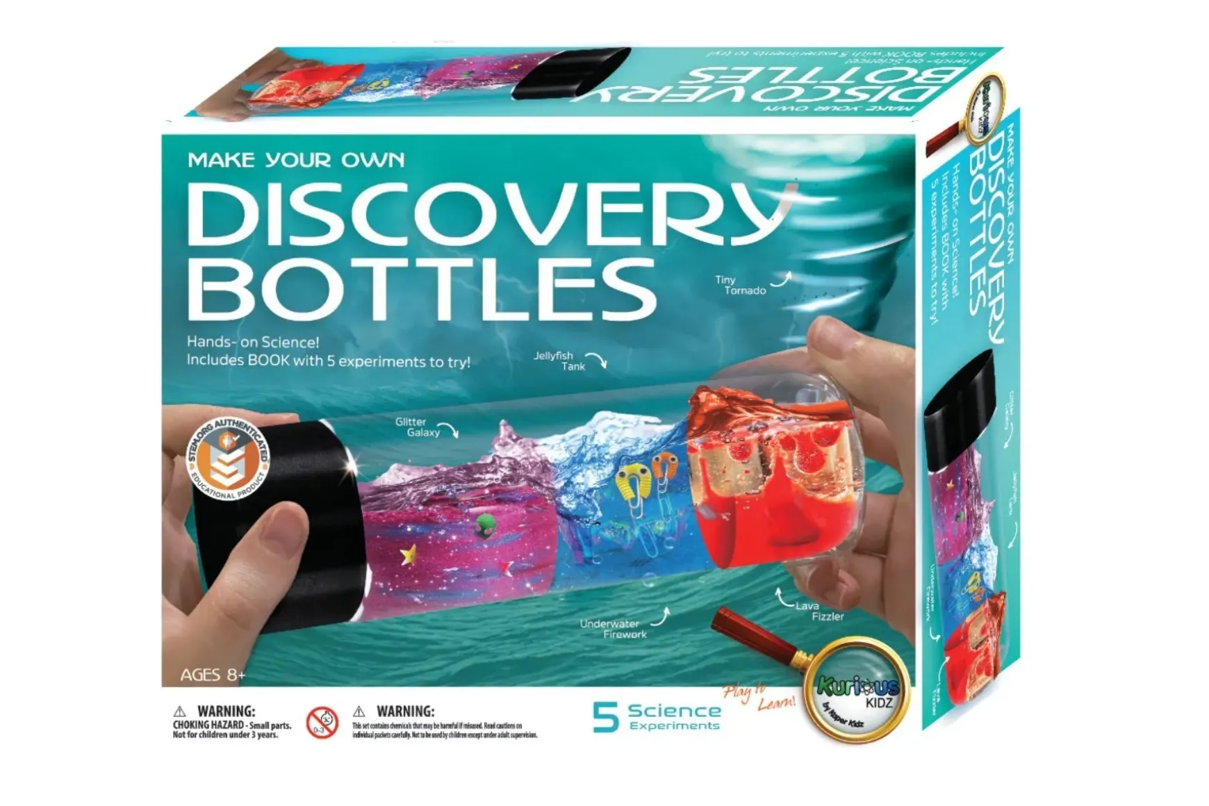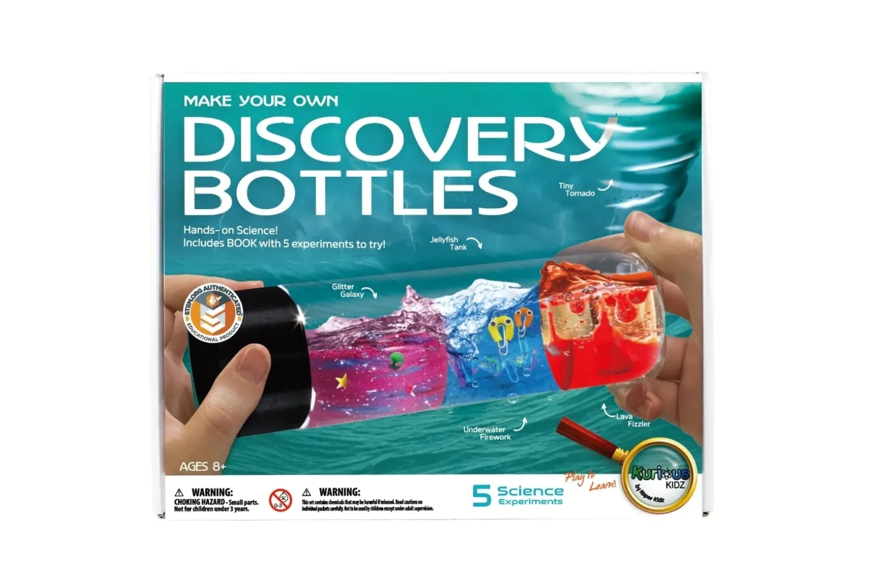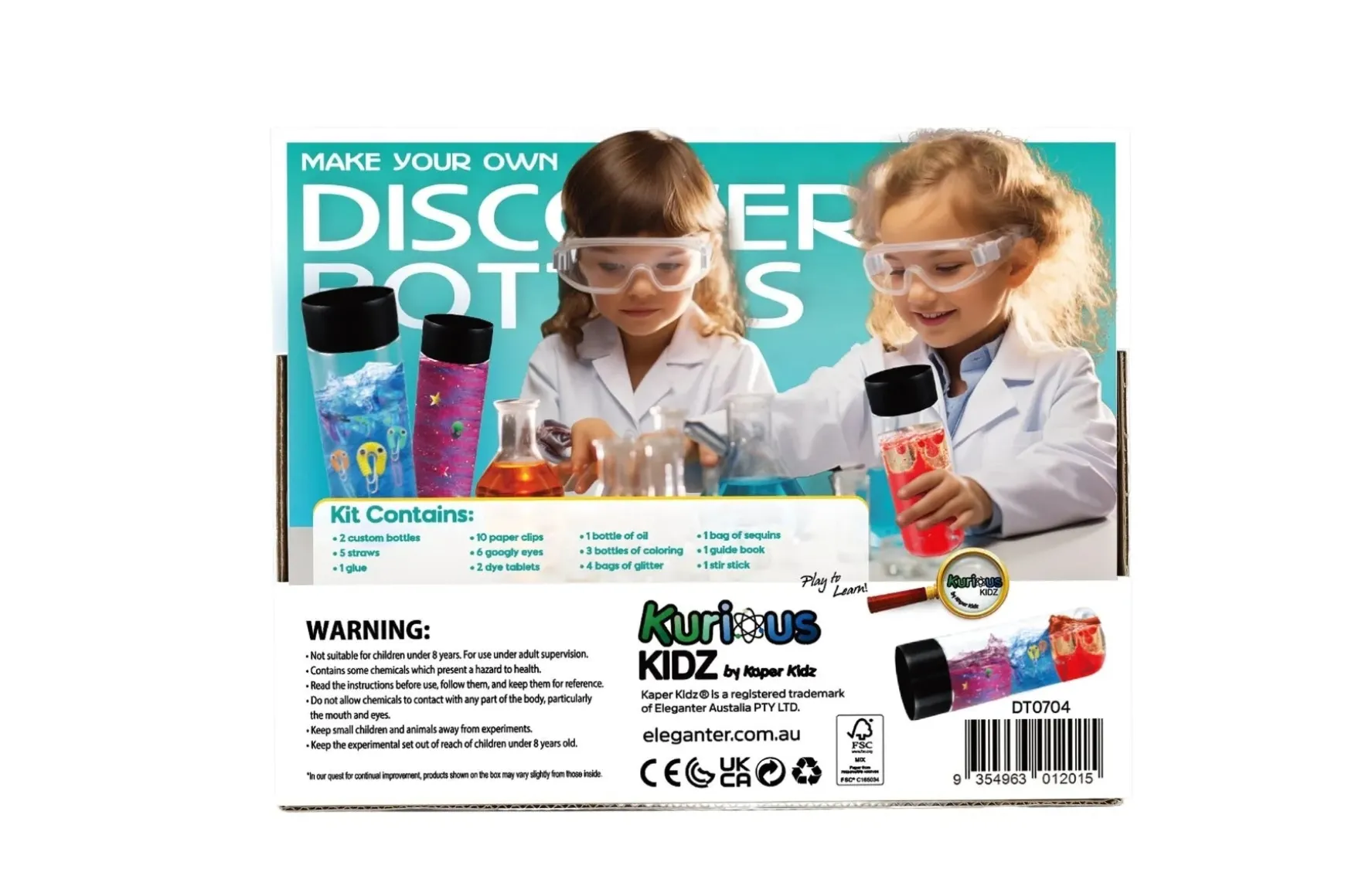 Dive into the wonders of water with the Make Your Own Discovery Bottles kit by Kurious Kidz from Kaper Kidz. This engaging science kit features five exciting experiments, perfect for young explorers aged 8 and up. Build a tiny tornado and learn about the dynamics of swirling vortices. Create a mesmerizing glittery galaxy and discover the beauty of sparkling stars. Explore chemical reactions with fizzing lava that bubbles and froths. Understand buoyancy by making a jellyfish that floats and sinks in water. Watch underwater fireworks as oil and water interact in stunning displays. Each experiment provides hands-on learning, encouraging curiosity and critical thinking through interactive play. The kit includes all necessary materials, making it easy and fun to dive right into the experiments. Combining education with entertainment, the Make Your Own Discovery Bottles kit is designed to inspire a love of science and exploration in children. Perfect for solo play or group activities, its an ideal choice for curious minds eager to discover the fascinating world of water.