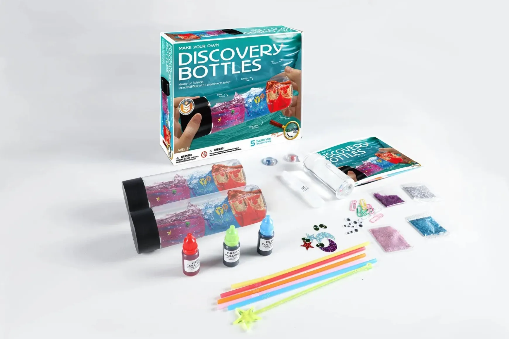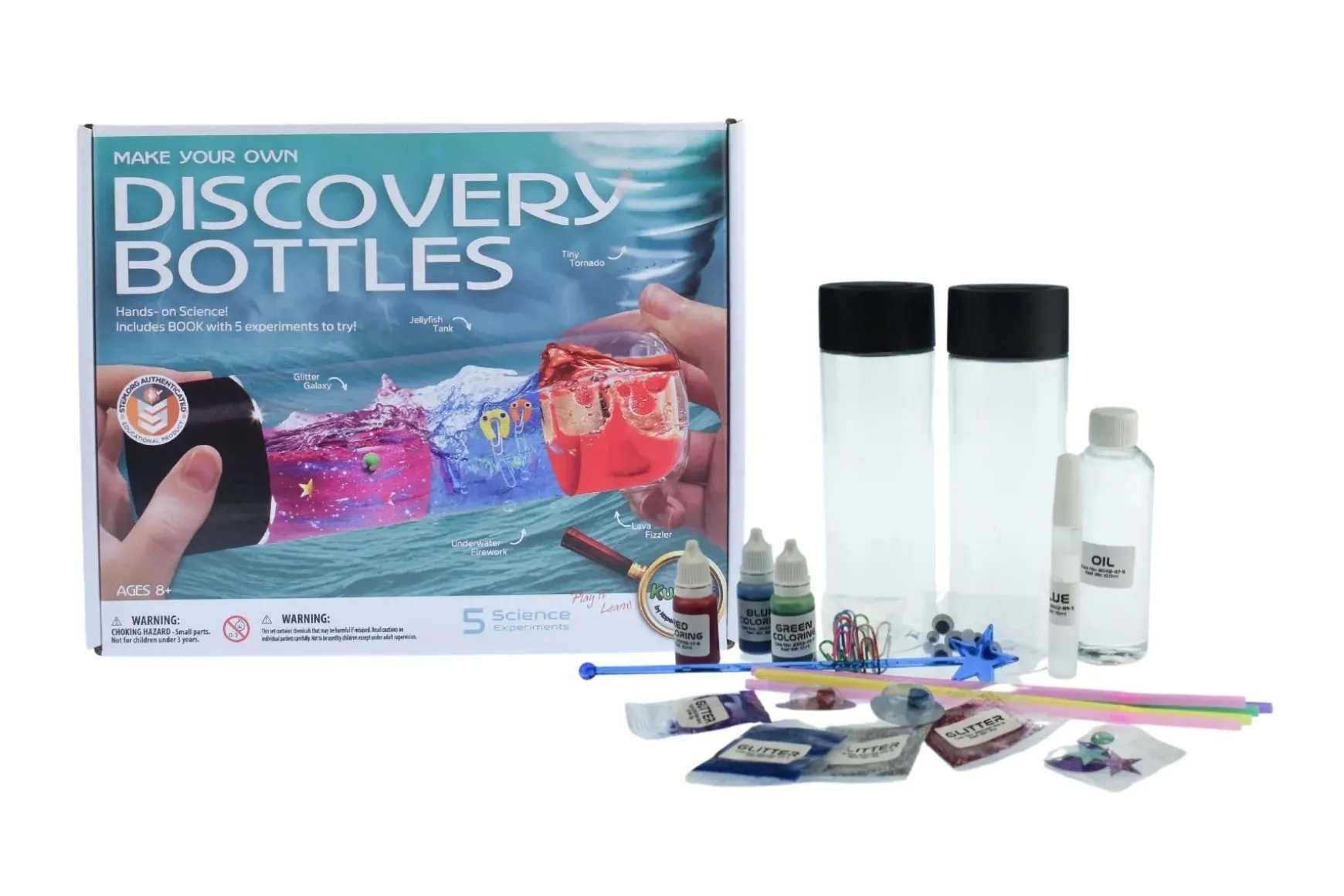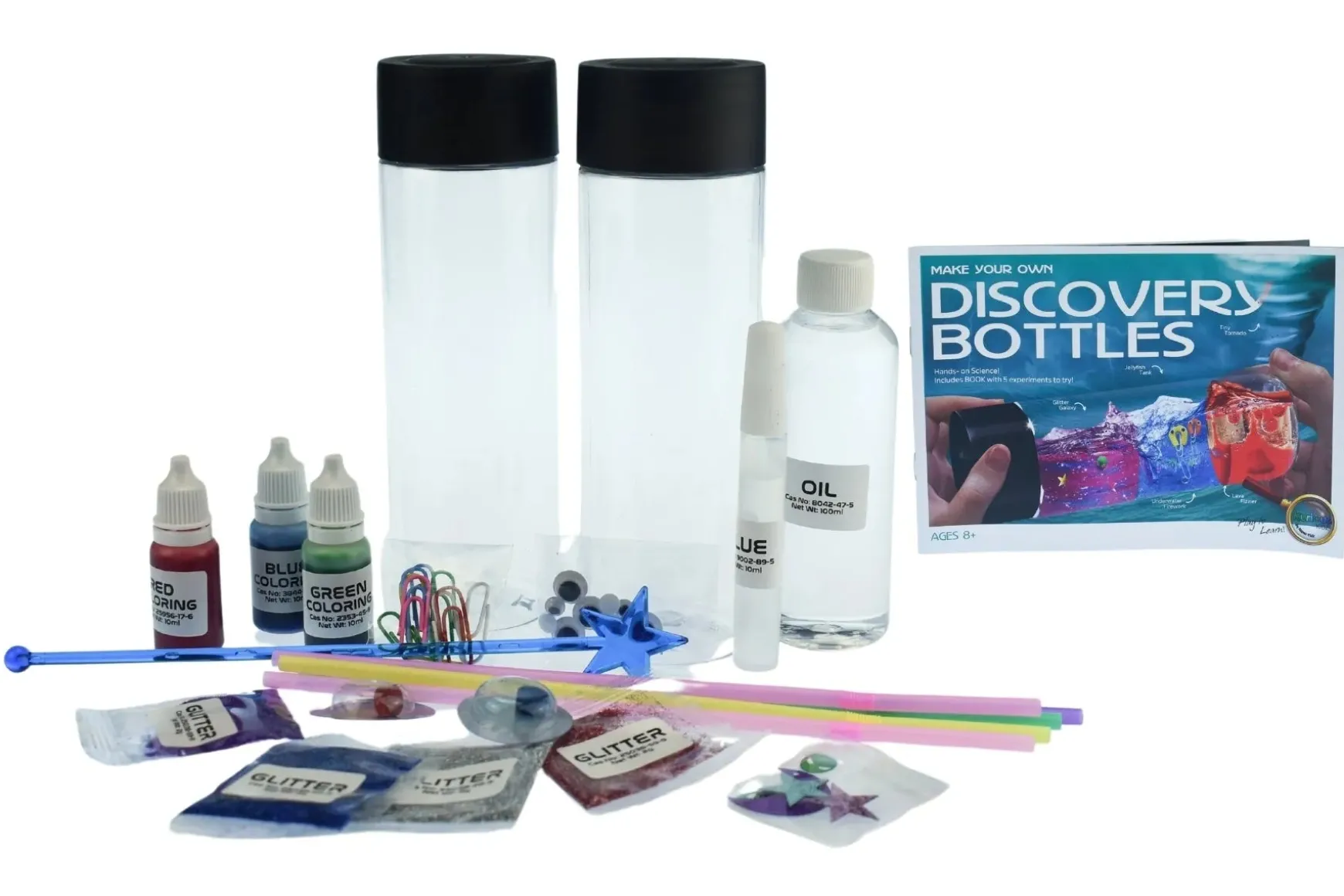 Dive into the wonders of water with the Make Your Own Discovery Bottles kit by Kurious Kidz from Kaper Kidz. This engaging science kit features five exciting experiments, perfect for young explorers aged 8 and up. Build a tiny tornado and learn about the dynamics of swirling vortices. Create a mesmerizing glittery galaxy and discover the beauty of sparkling stars. Explore chemical reactions with fizzing lava that bubbles and froths. Understand buoyancy by making a jellyfish that floats and sinks in water. Watch underwater fireworks as oil and water interact in stunning displays. Each experiment provides hands-on learning, encouraging curiosity and critical thinking through interactive play. The kit includes all necessary materials, making it easy and fun to dive right into the experiments. Combining education with entertainment, the Make Your Own Discovery Bottles kit is designed to inspire a love of science and exploration in children. Perfect for solo play or group activities, its an ideal choice for curious minds eager to discover the fascinating world of water.
