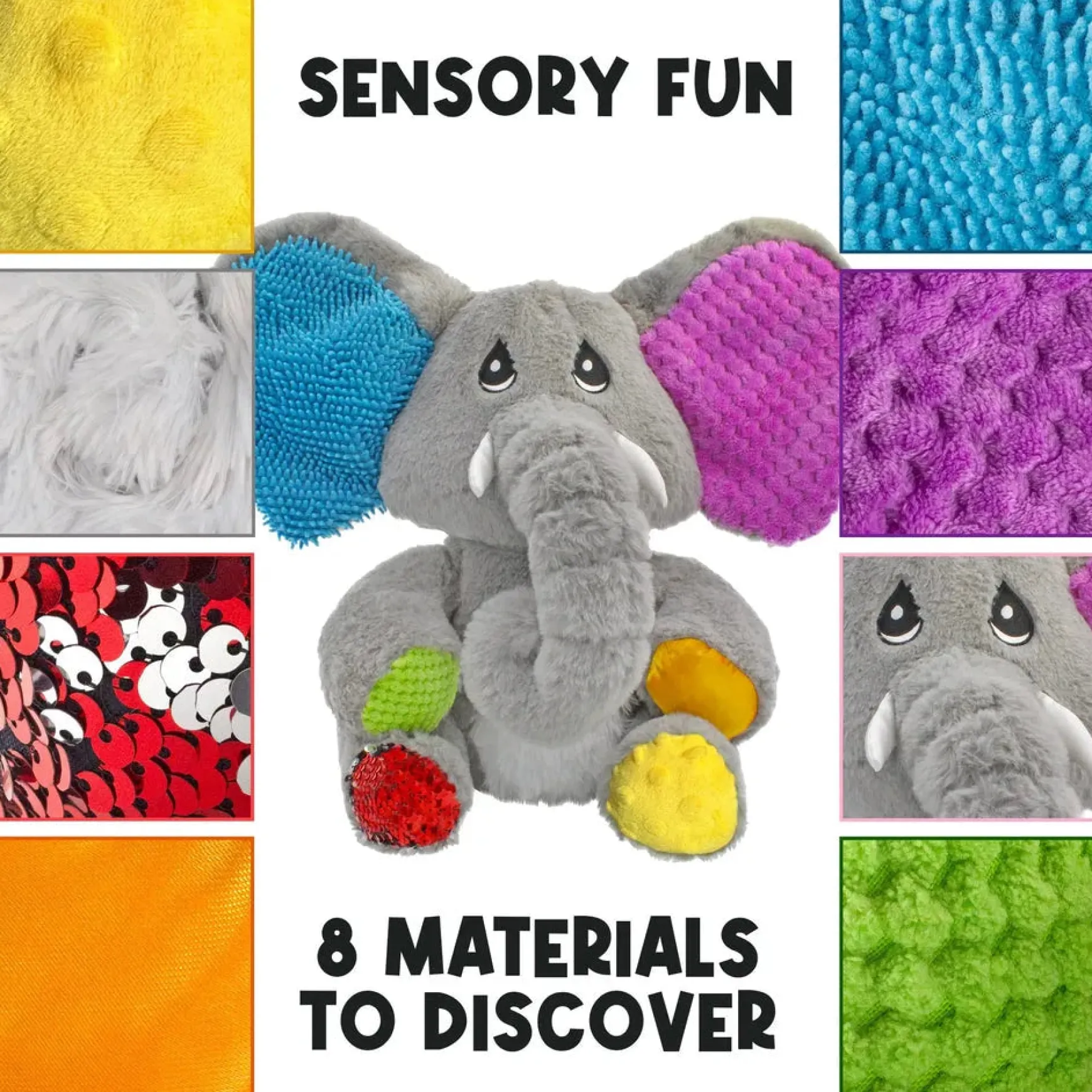 Ellie is a plush stuffie that offers a unique sensory experience for your child. Each colored fabric area features a different sensory material, stimulating your child’s sense of touch. Ellie’s ears make a crinkle sound, providing auditory stimulation as well.