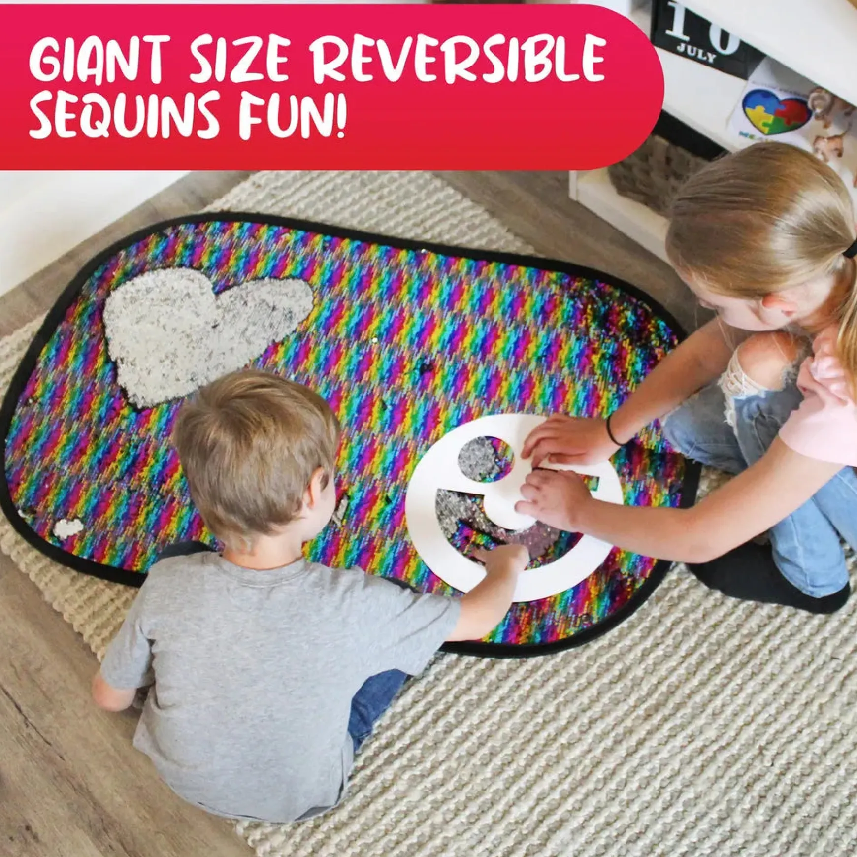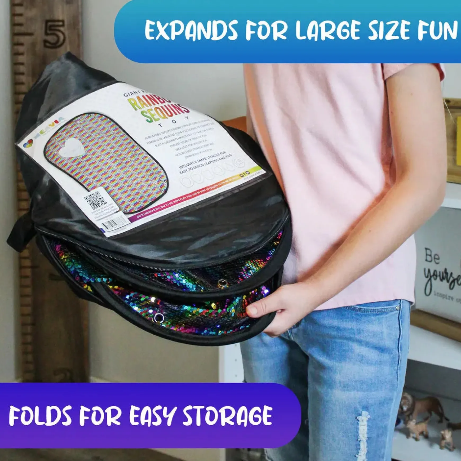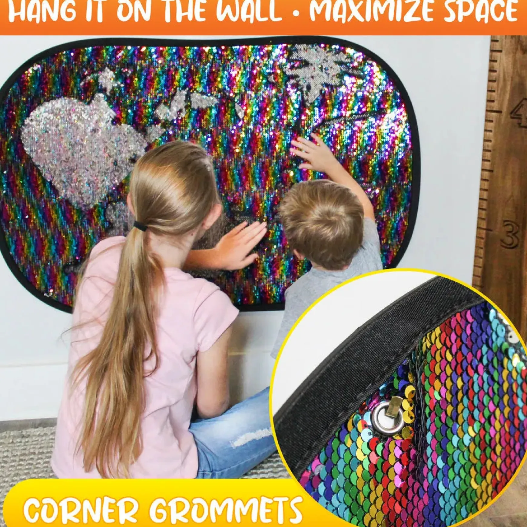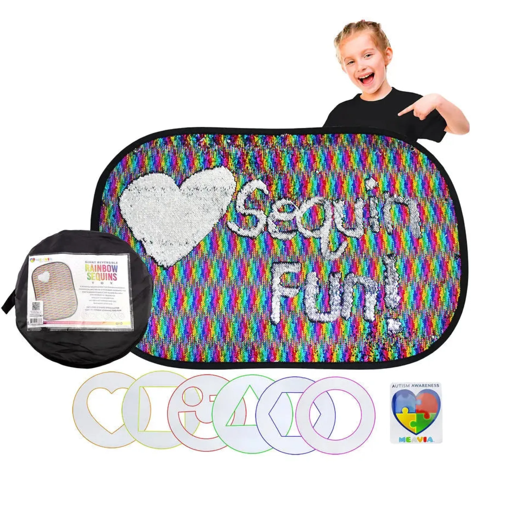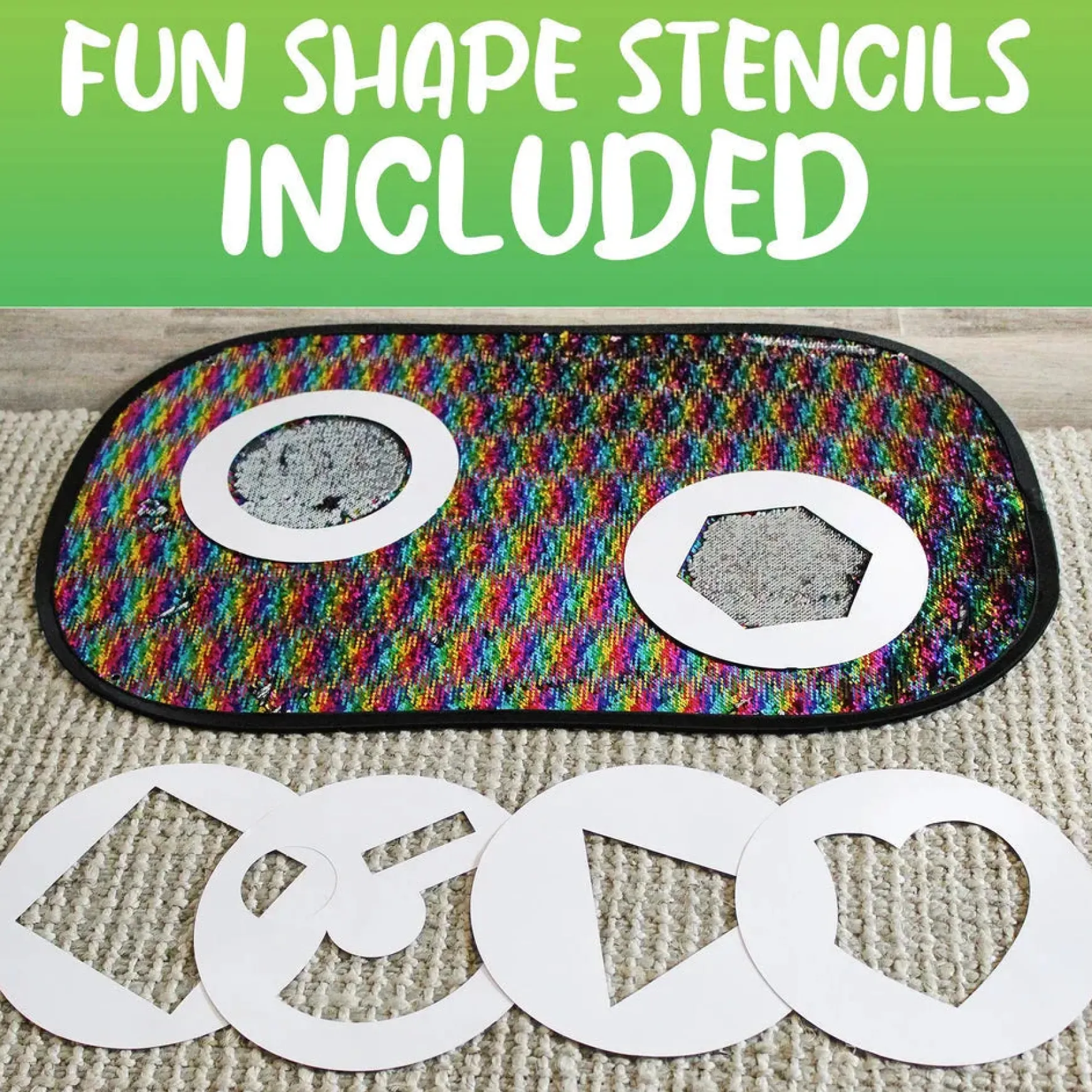 Reversible sequins have a unique sensory feel that kids love. That’s why this design expands to be a large size creative space. This reversible sequins fabric can be used on a sensory wall (thanks to a grommet in each corner), on a sensory floor, or on a sensory table. Included with this toy are six fun shaped stencils so it’s easy for kids to create unique shapes. Our reversible sequins toy is irresistibly mesmerizing for children of all ages. The rainbow material provides visual and tactile stimulation. This toy folds down easily and comes with a quality bag for easy travel.