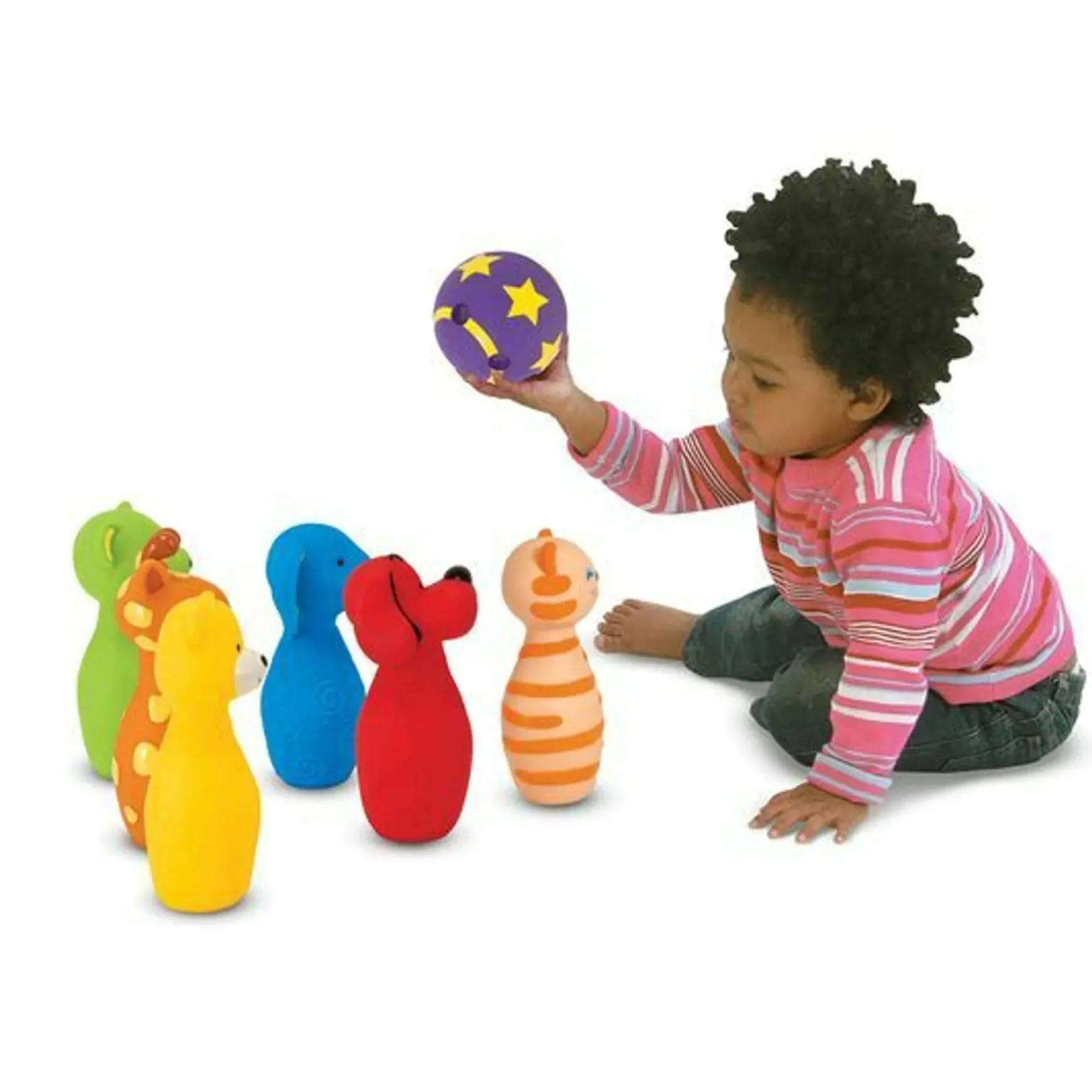 This preschool-friendly bowling set has soft plastic components that are easy to lift, easy to manoeuvre and so much fun to knock down! Six unique character pins feature bright colours, raised textures, and sweet facial expressions to encourage little bowlers. Set them up indoors and out–young children will have a blast finding new ways to knock them down! With bright colours, textures, and adorable facial expressions, these endearing toys are sure to strike big at playtime.