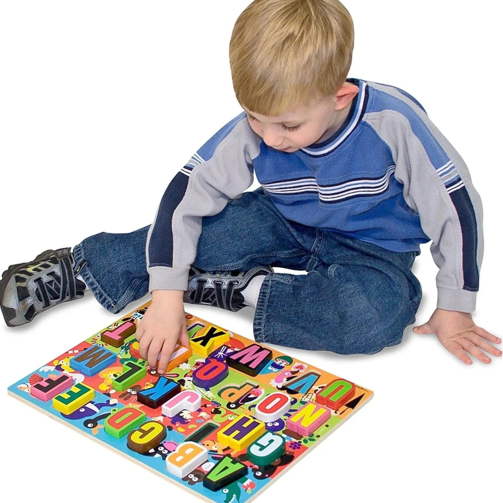 Alphabet fun begins with this extra thick wooden puzzle that includes 26 easy-grasp, chunky pieces (A-Z). Each piece is shown with a colourful picture that begins with that letter and a full-colour, matching letter is shown under each piece. Letter pieces stand up. Encourages hand-eye, fine motor, letter recognition and pre-reading skills.
