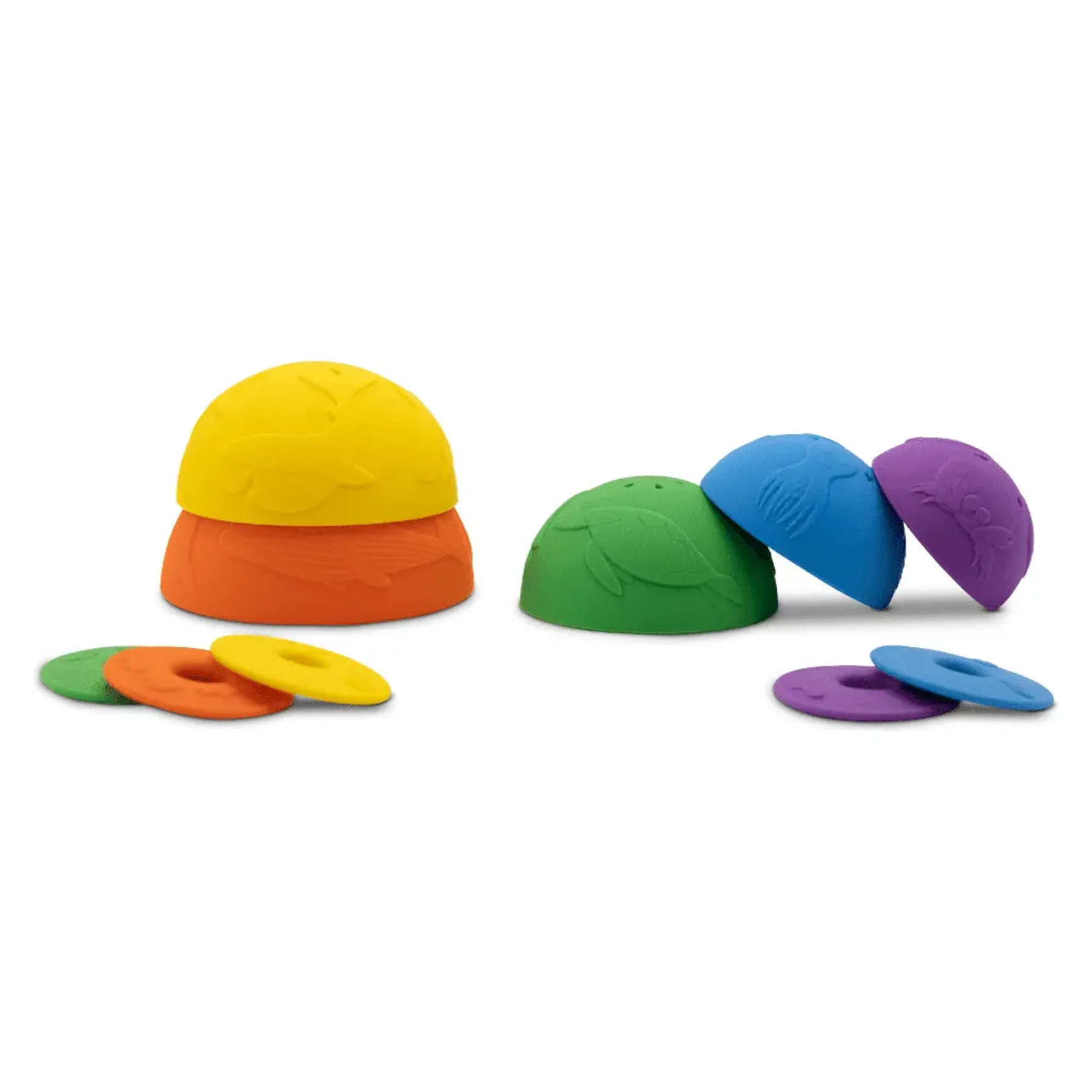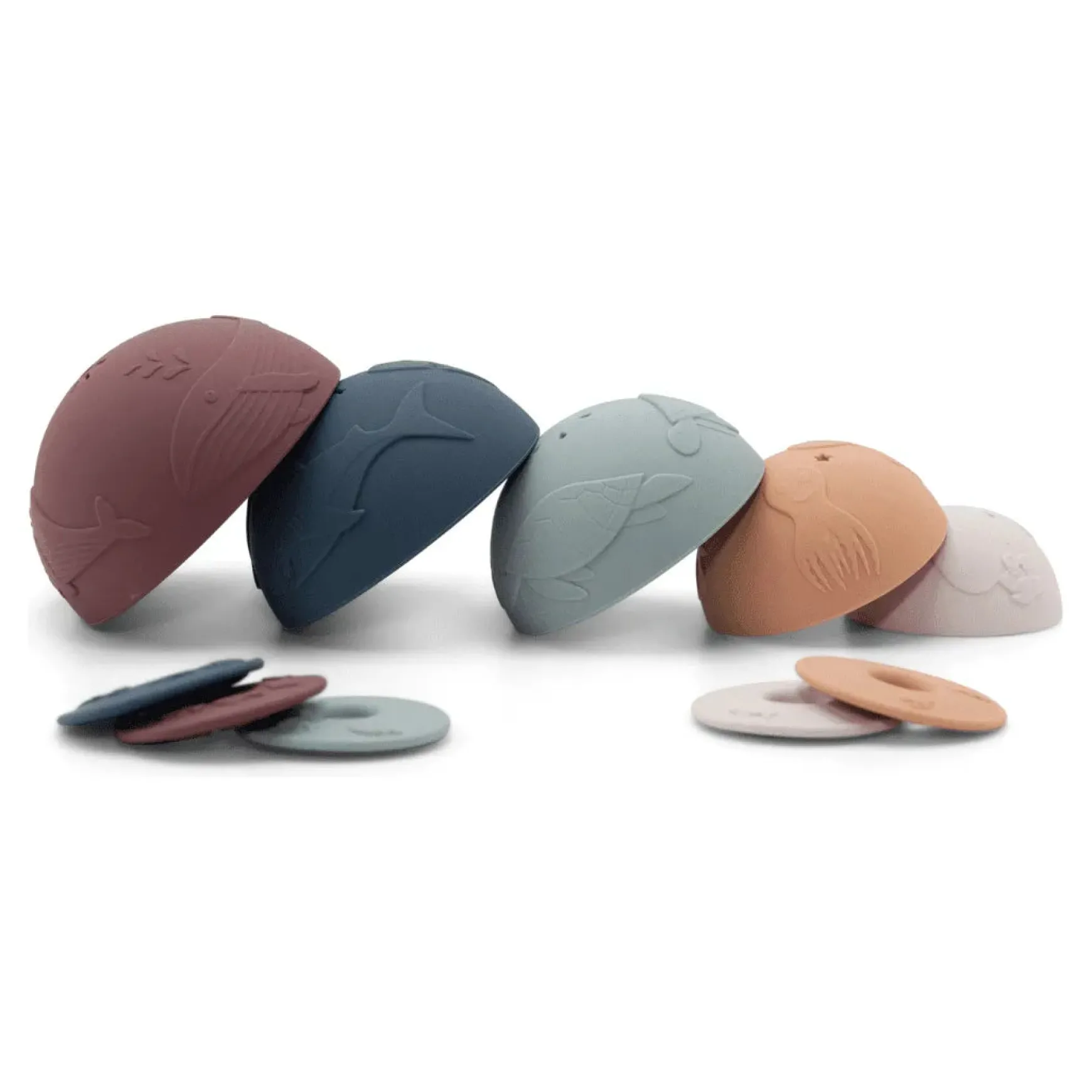 A set of 5 Stacking Cups plus 5 Treasure Coins! Our Ocean Stacking Cups can help your kids explore marine life through sensory play. Stack them up, nest them, hide objects under, texture stamp with sand or playdough…and match the coins with their cup!