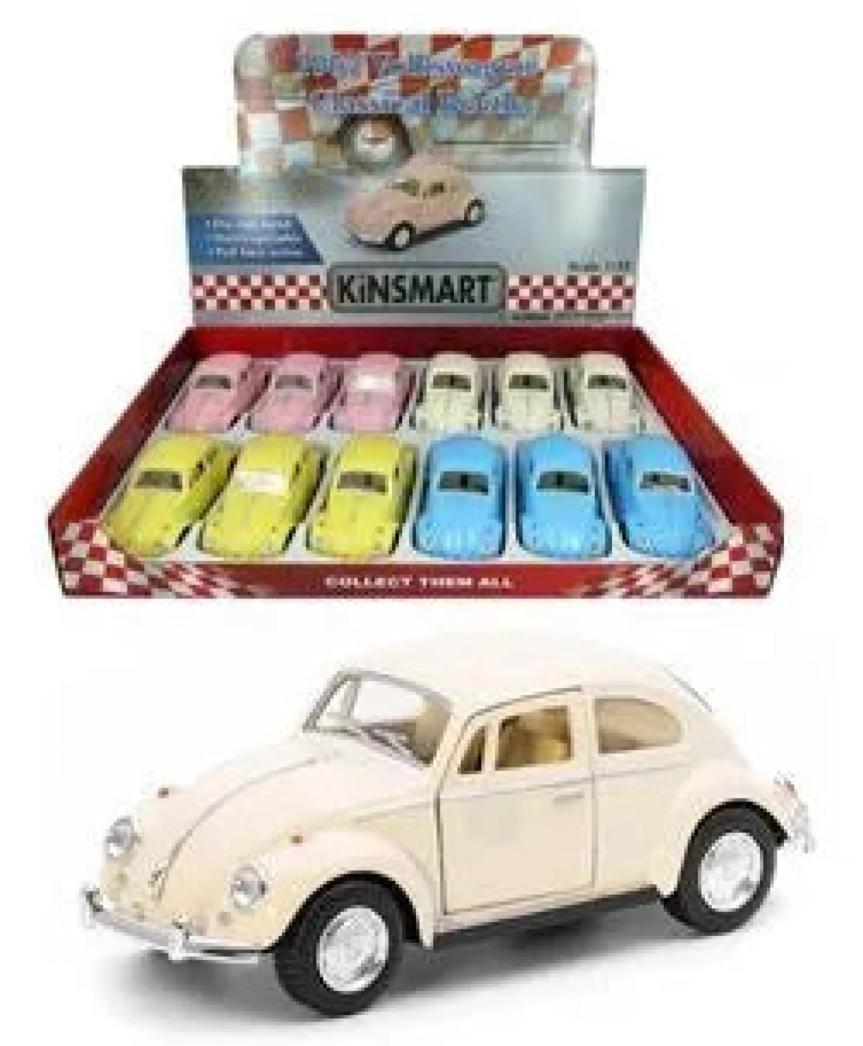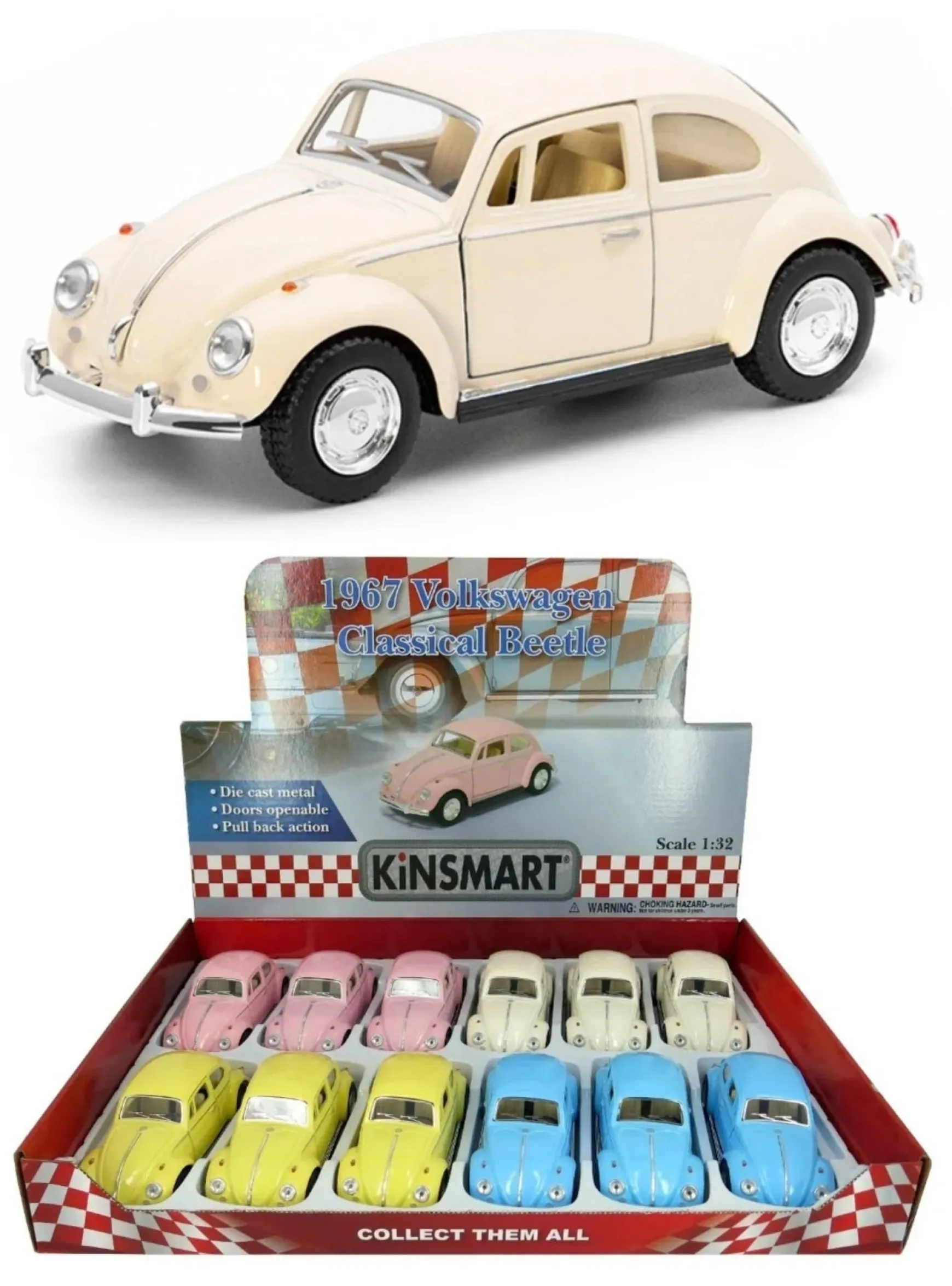 These Pastel VW Classical Beetles are a 1:32 scale and are approximately 12.5cm long with openable doors and a pull back action.