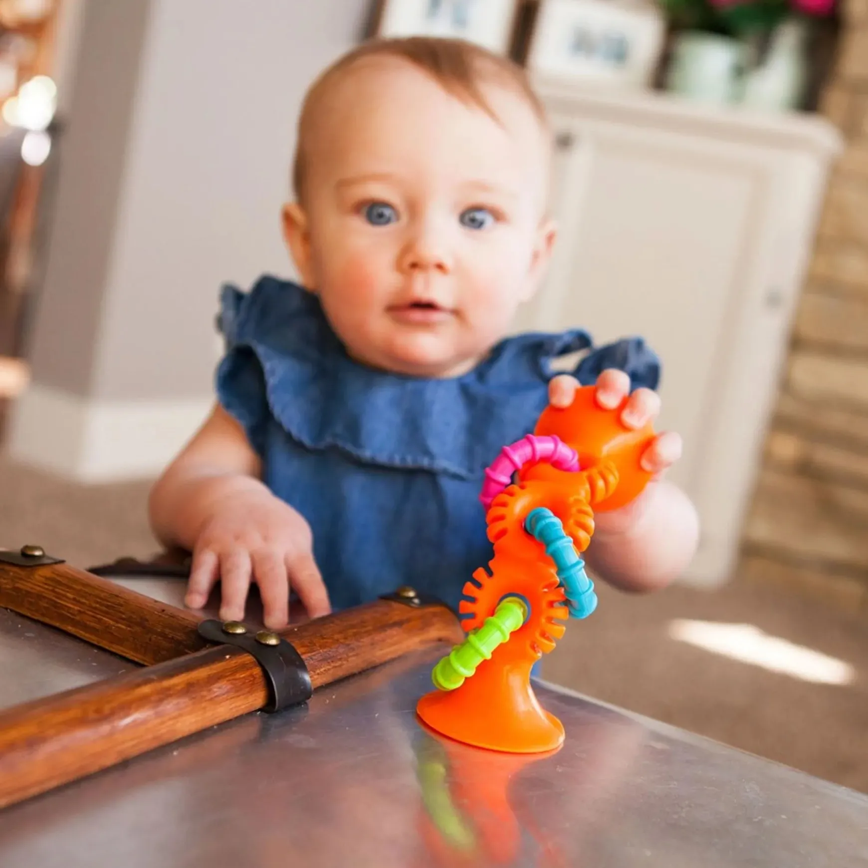 Little explorers can’t help but get sucked into the sensory excitement of these bendy, rattly, chewy, suction-cup creations! Their vivid textures instantly inspire little fingers to grab and feel while their soft silicone material simultaneously makes them perfect for soothing sore gums. Flip and spin the textured, plastic rings to hear them rattle brightly. Press their suction cups onto any smooth, non-porous surface to set up a stationary play space and then pull them off to hear their loud and exciting POP. They’re sure to become baby’s new favorite toy! No matter which one you choose, early playtime learning really sticks when little ones start exploring with the pipSquigz Loops.
